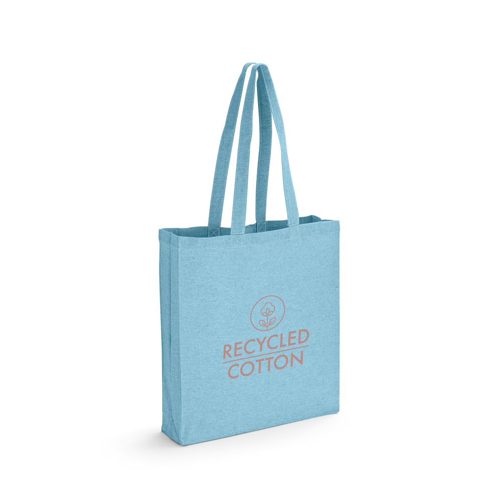 Baumwolltasche aus recycelte Baumwolle (70%) und Polyester (30%rPET) (140g / m²) mit 68 cm lange Henkel. Recycelte Baumwolle ist ungefärbt. Das Rohmaterial wird in seiner ursprünglichen Form und Farbe verwendet, ohne dass Chemikalien zum Färben oder Bleichen eingesetzt werden, was zu einer geringeren Umweltbelastung beiträgt. 380 x 410 x 100 mm