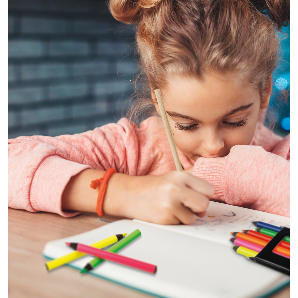 Malset bestehend aus 6 fluoreszierenden und angespitzten Buntstiften. 90 x 10 x 48 mm