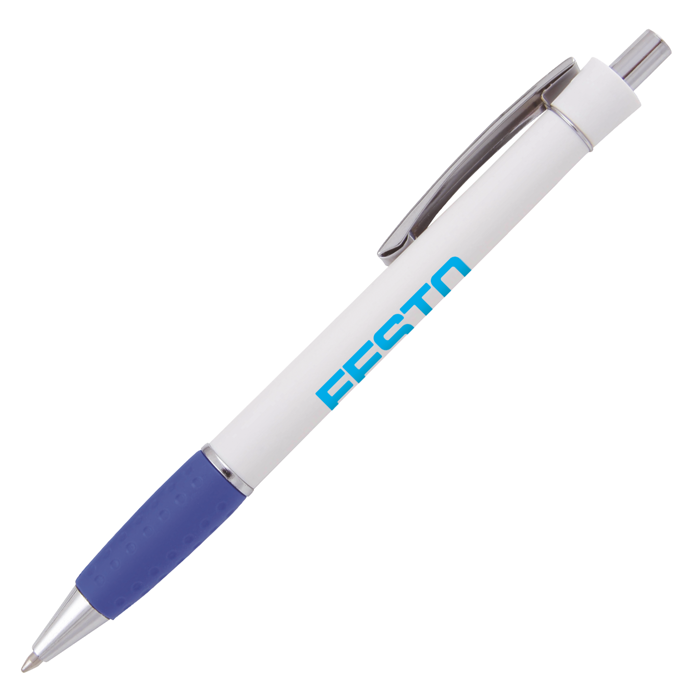 MIKKON Metall-Clip Peekay mit weißem Schaft und farbigem Clip, verfügbar in den Farben blau, rot und schwarz. Ausgestattet mit blauschreibender X-20 Mine.