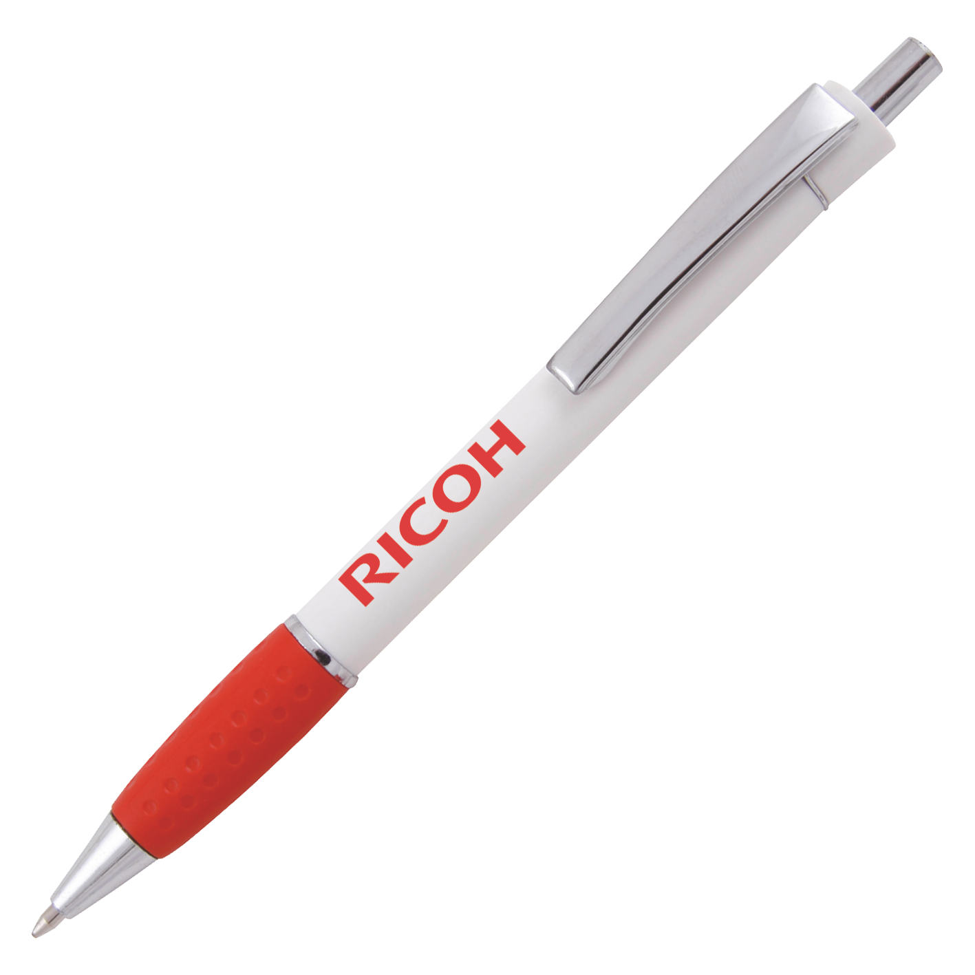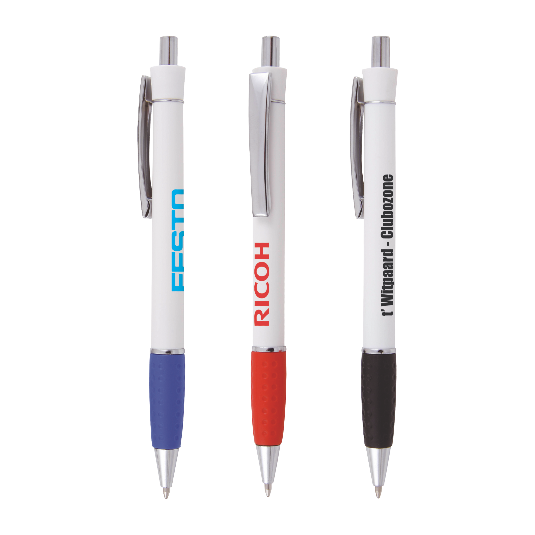 MIKKON Metall-Clip Peekay mit weißem Schaft und farbigem Clip, verfügbar in den Farben blau, rot und schwarz. Ausgestattet mit blauschreibender X-20 Mine.