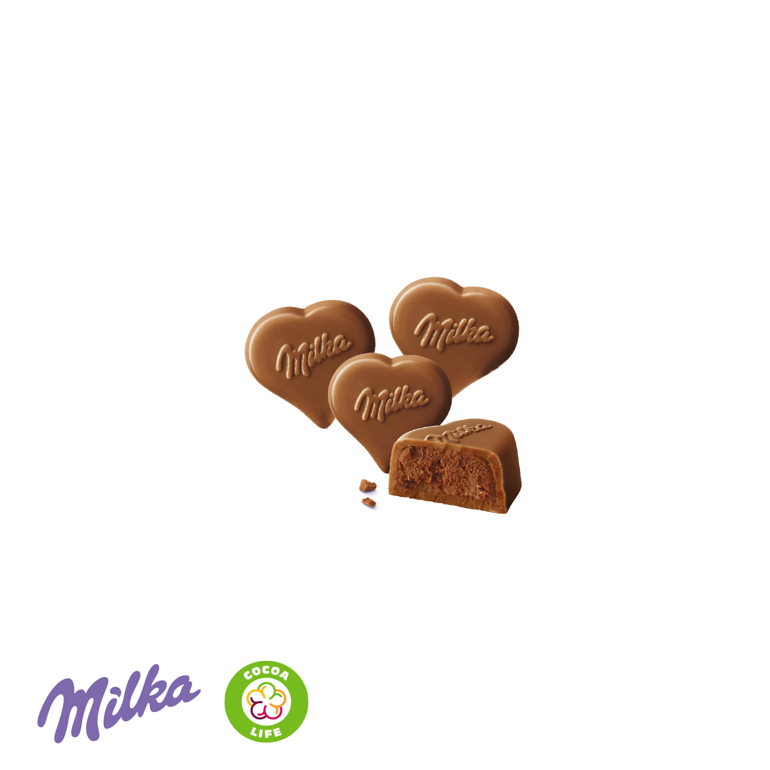 Milka von Herzen, ideal zum Verschenken! Die herzförmigen Milka "Von Herzen" Pralinen aus zart schmelzender Milka Alpenmilch Schokolade, gefüllt mit leckerer Haselnusscrème, eignen sich ideal zum Verschenken oder als kleine Geste zwischendurch.