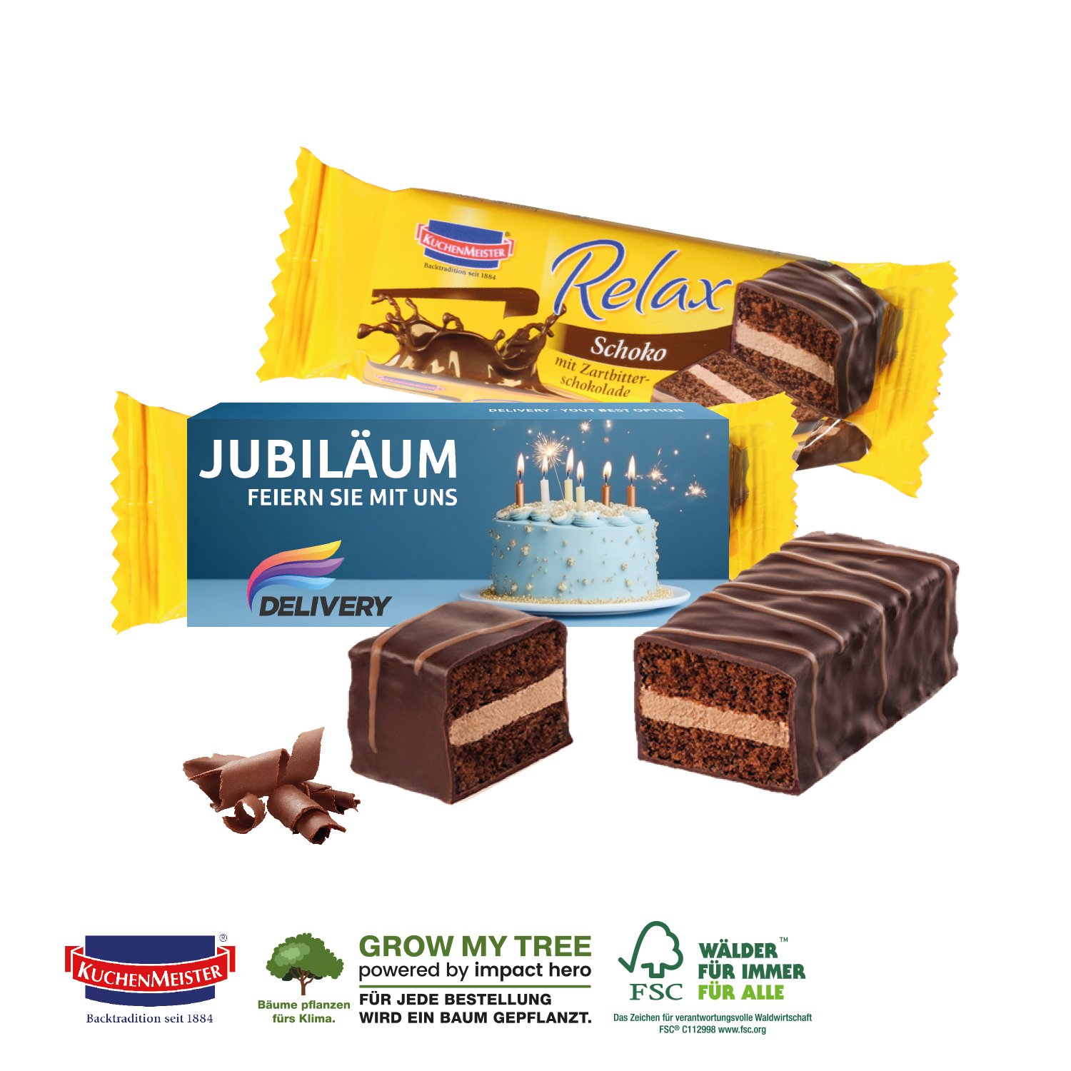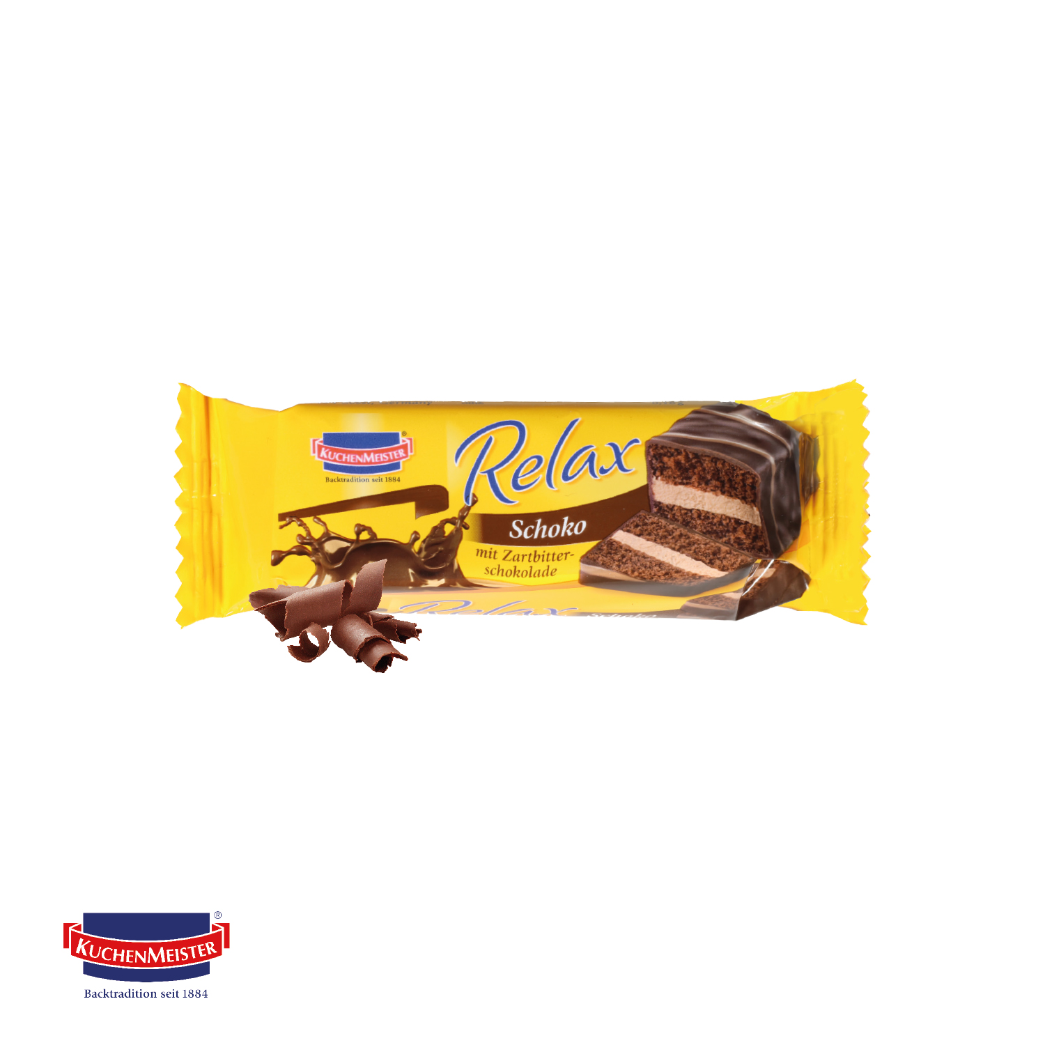 1 Schoko Kuchen "Relax" von Kuchenmeister (ca. 32 g) gefüllt mit köstlicher Kakaocreme und umhüllt von edler Zartbitterschokolade.