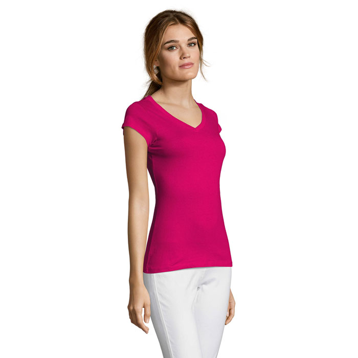 SOL'S MOON Damen-T-Shirt mit tiefem V-Ausschnitt und taillierter Schnittführung. Rippkragen, Nackenband, Kurzarm, Seitennähte. Material: 150g / m² 100% halbgekämmte, ringgesponnene Baumwolle.