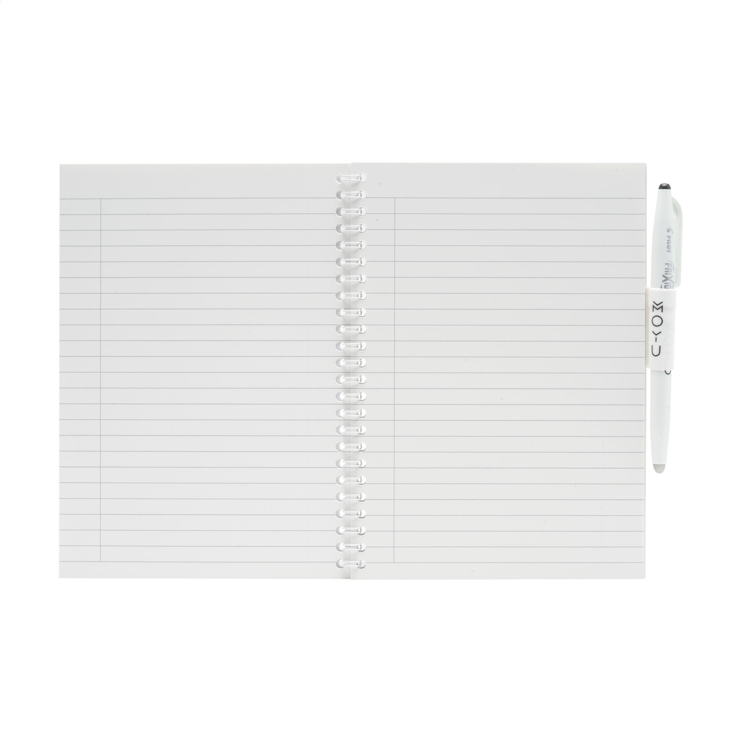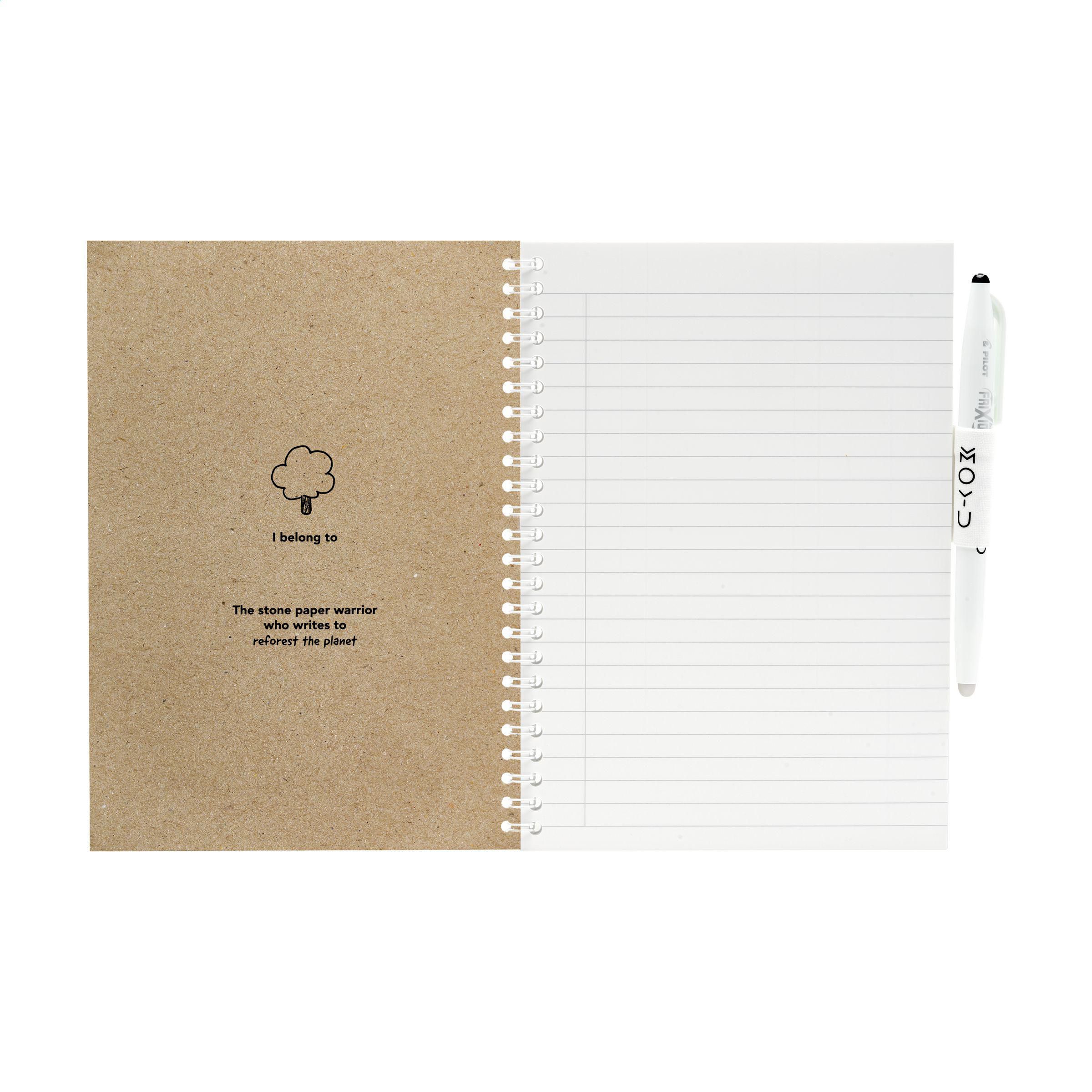 iederbeschreibbares A5-Notizbuch aus Steinpapier der Marke MOYU. Der starke Umschlag besteht aus 440 Gramm recyceltem Kraftkarton. Inklusive Stift und Reinigungstuch. Jede Steinpapierseite kommt von Natur ohne Bäume aus und ist zu 100% recycelbar. Dieses Notizbuch mit elastischer Stiftschlaufe ist in einer stabilen Spiralbindung gebunden und umfasst 18 Seiten mit liniertem Papier. Erstellen Sie Ihre Notizen mit dem zugehörigen speziellen MOYU-Stift. Der Stift enthält die original Frixion-Tinte. Die Tinte trocknet vollständig auf dem Steinpapier und lässt sich leicht löschen, ohne Spuren zu hinterlassen. Befeuchten Sie das mitgelieferte MOYU-Tuch mit etwas Wasser und wischen Sie die Tinte ab. So erhalten Sie wieder leere Seiten für neue Ideen und To-Do-Listen. Im Durchschnitt kann man etwa 500 Mal auf Steinpapier schreiben. Dieses Notizbuch begleitet Sie über viele Jahre hinweg. Steinpapier besteht zu 80% aus Kalkstein und zu 20% aus sauberem Kunststoff. Es ist von Natur aus baumfrei, und zu seiner Herstellung werden weder Wasser noch Chemikalien benötigt. Die Herstellung von Steinpapier ist daher wirtschaftlicher und verursacht 67% weniger CO2-Emissionen als die Herstellung von Zellstoffpapier. Außerdem ist Steinpapier endlos recycelbar, ohne dass neue Rohstoffe hinzugefügt werden müssen.