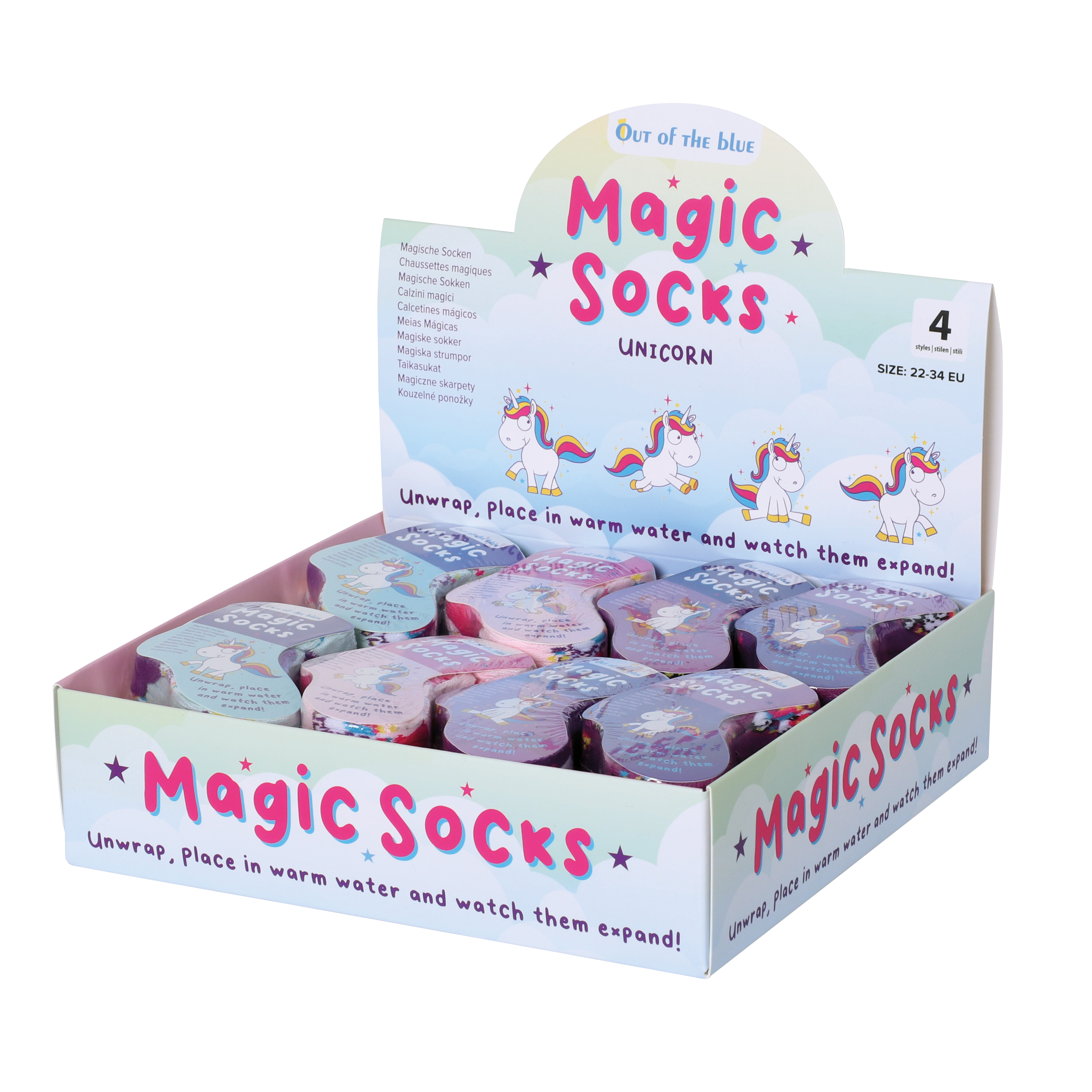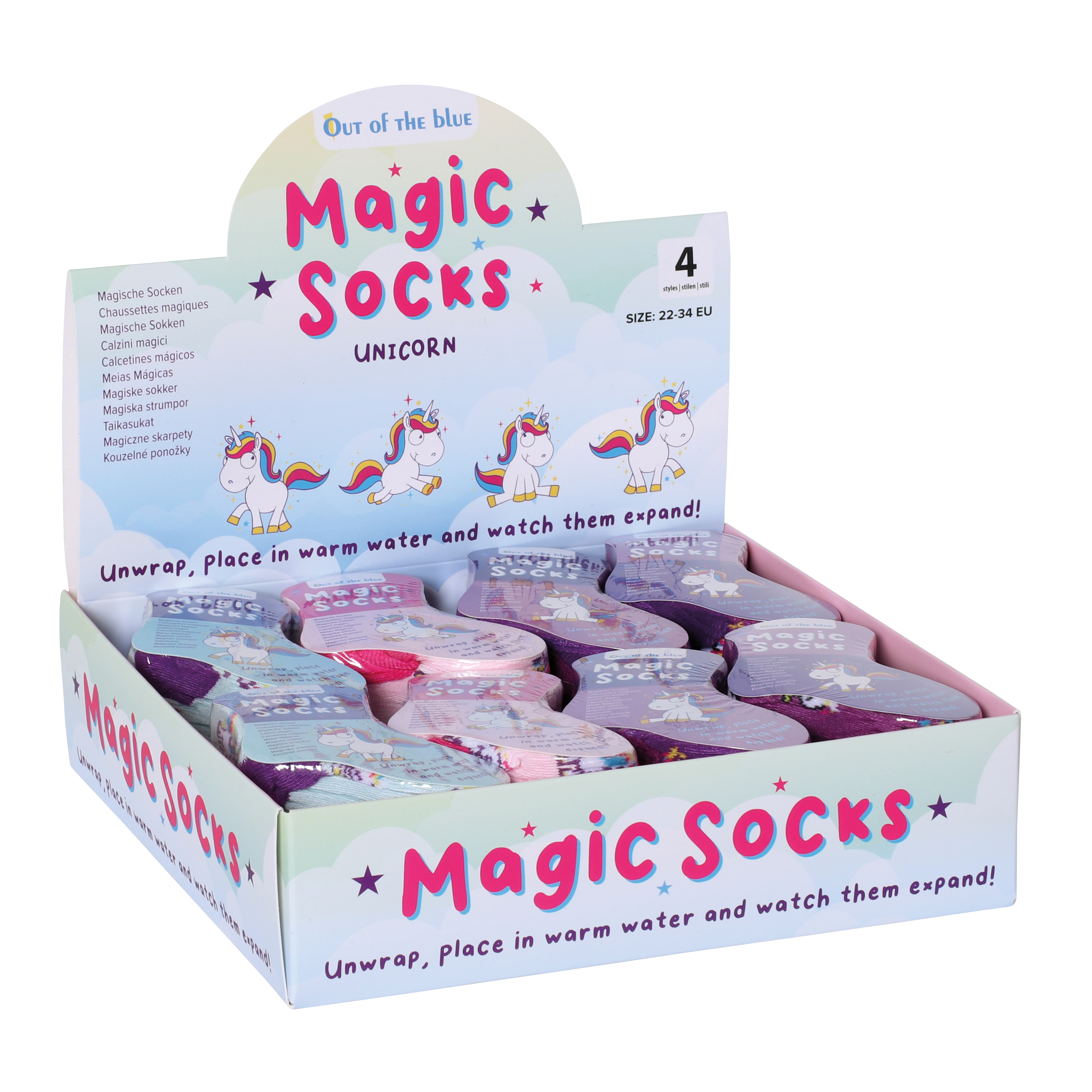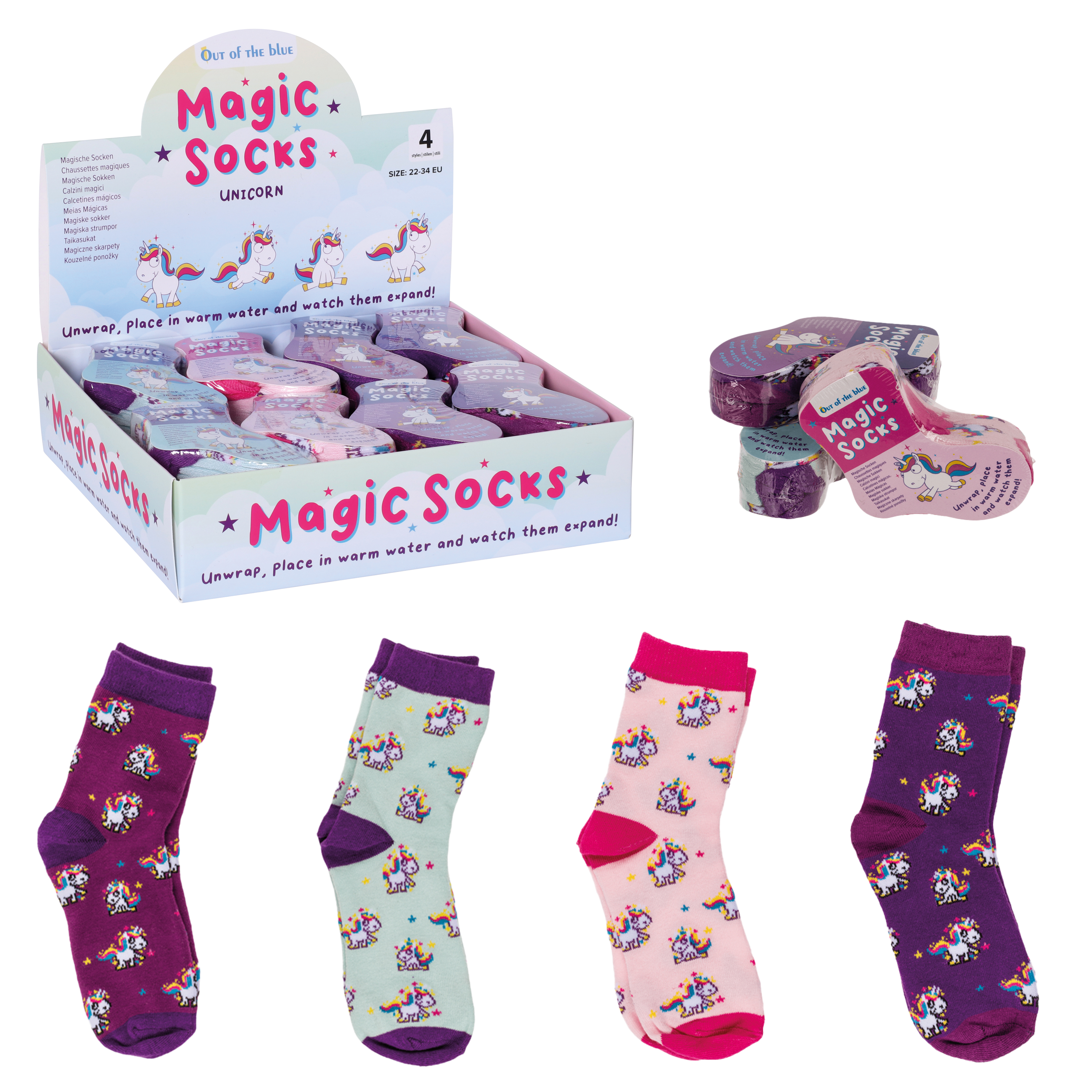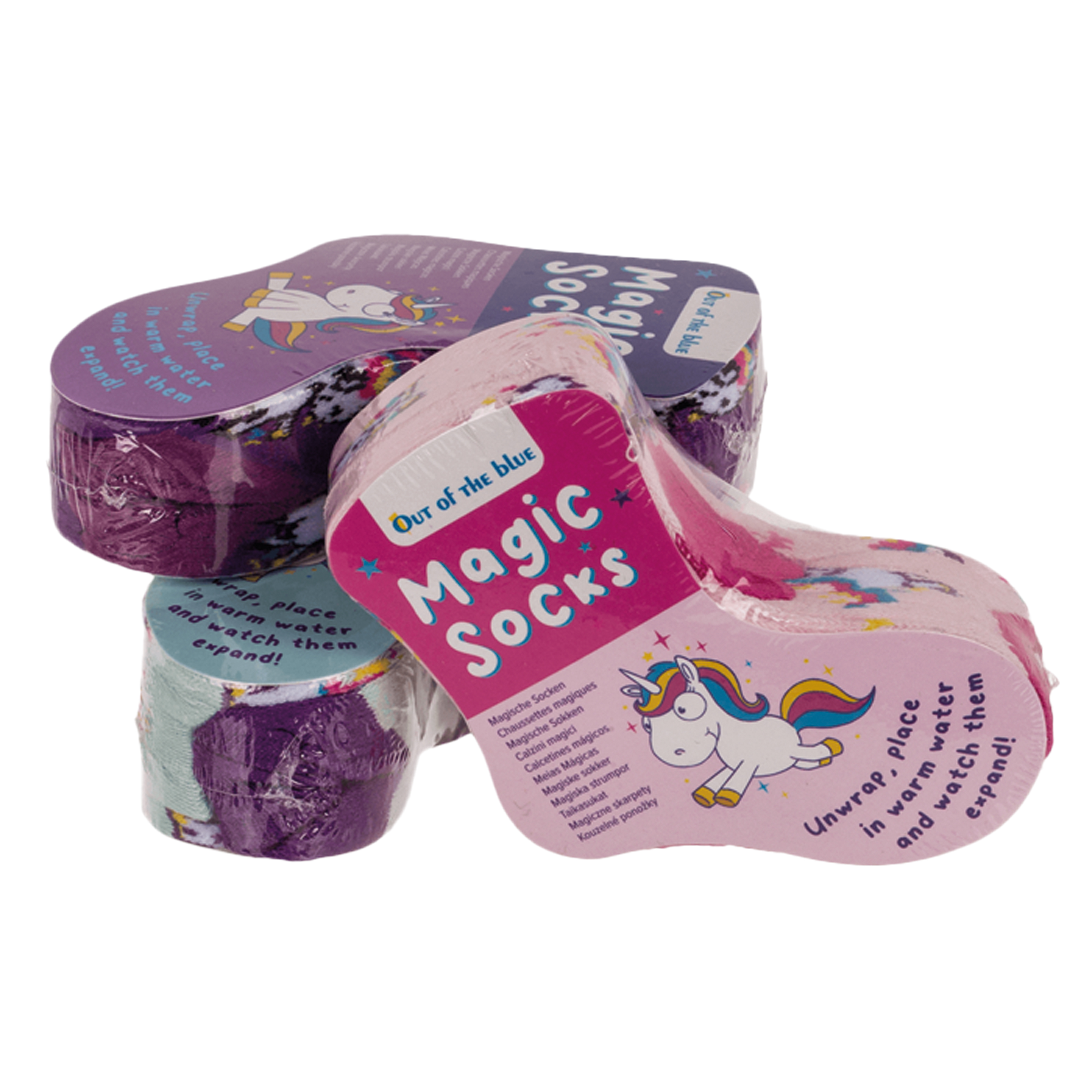 Das Päckchen wird, in warmes Wasser gelegt, wie von Zauberhand zu einen Paar fröhlich bunter Kindersöckchen. Vier Designs sortiert. 72% Baumwolle, 23 % Polyester und 5% Elastan. Passend für die Größen 22 - 34.