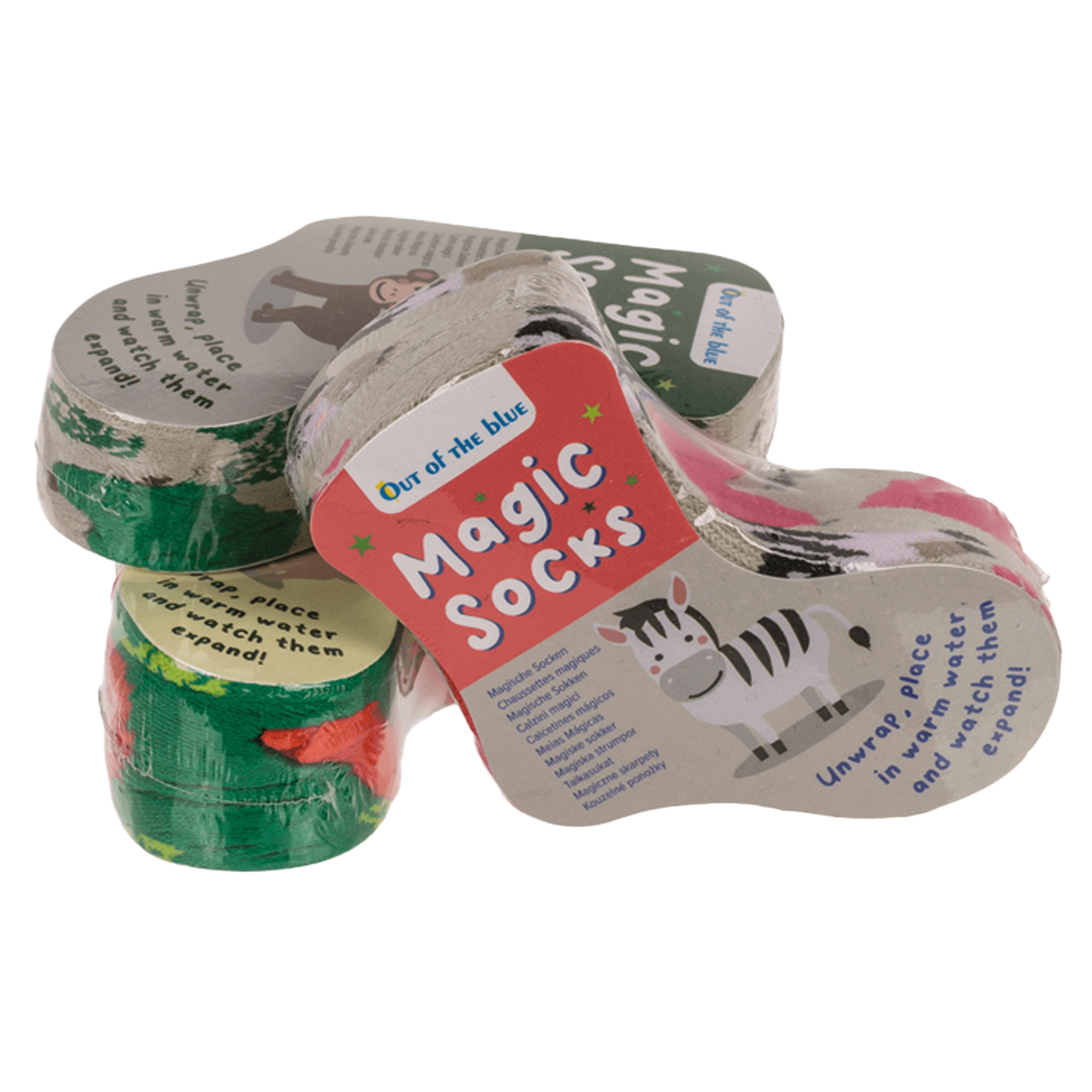 Das Päckchen wird, in warmes Wasser gelegt, wie von Zauberhand zu einen Paar fröhlich bunter Kindersöckchen. Sechs Designs sortiert. 72% Baumwolle, 23 % Polyester und 5% Elastan. Passend für die Größen 22 - 34.