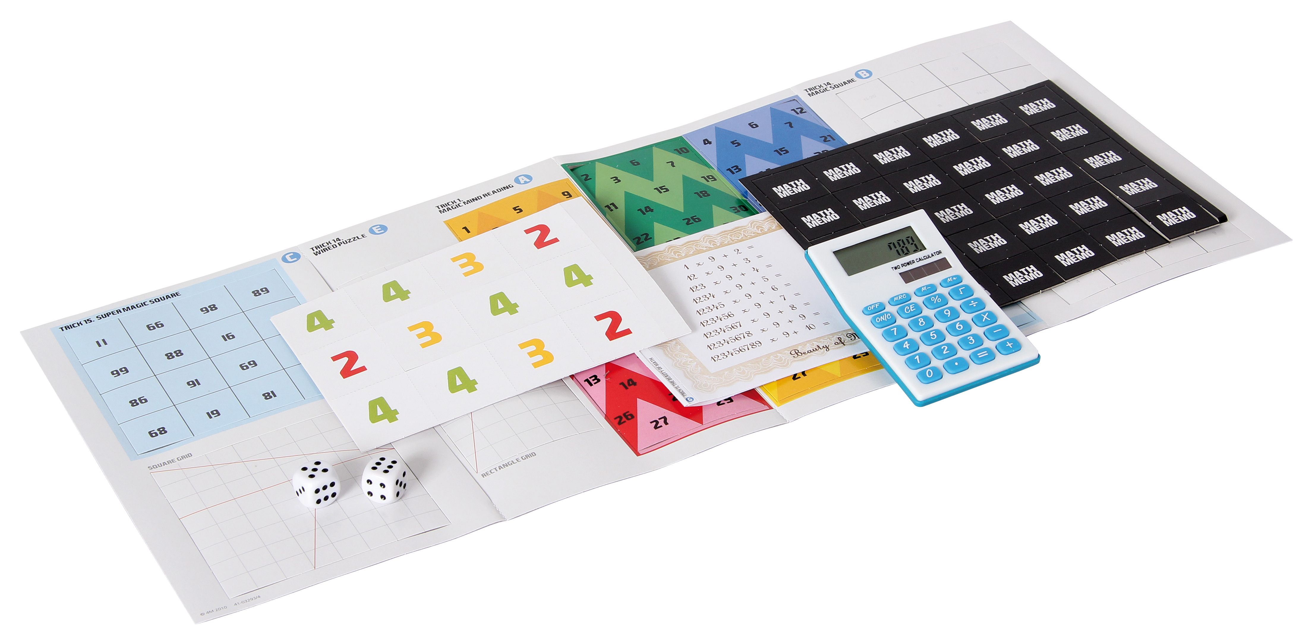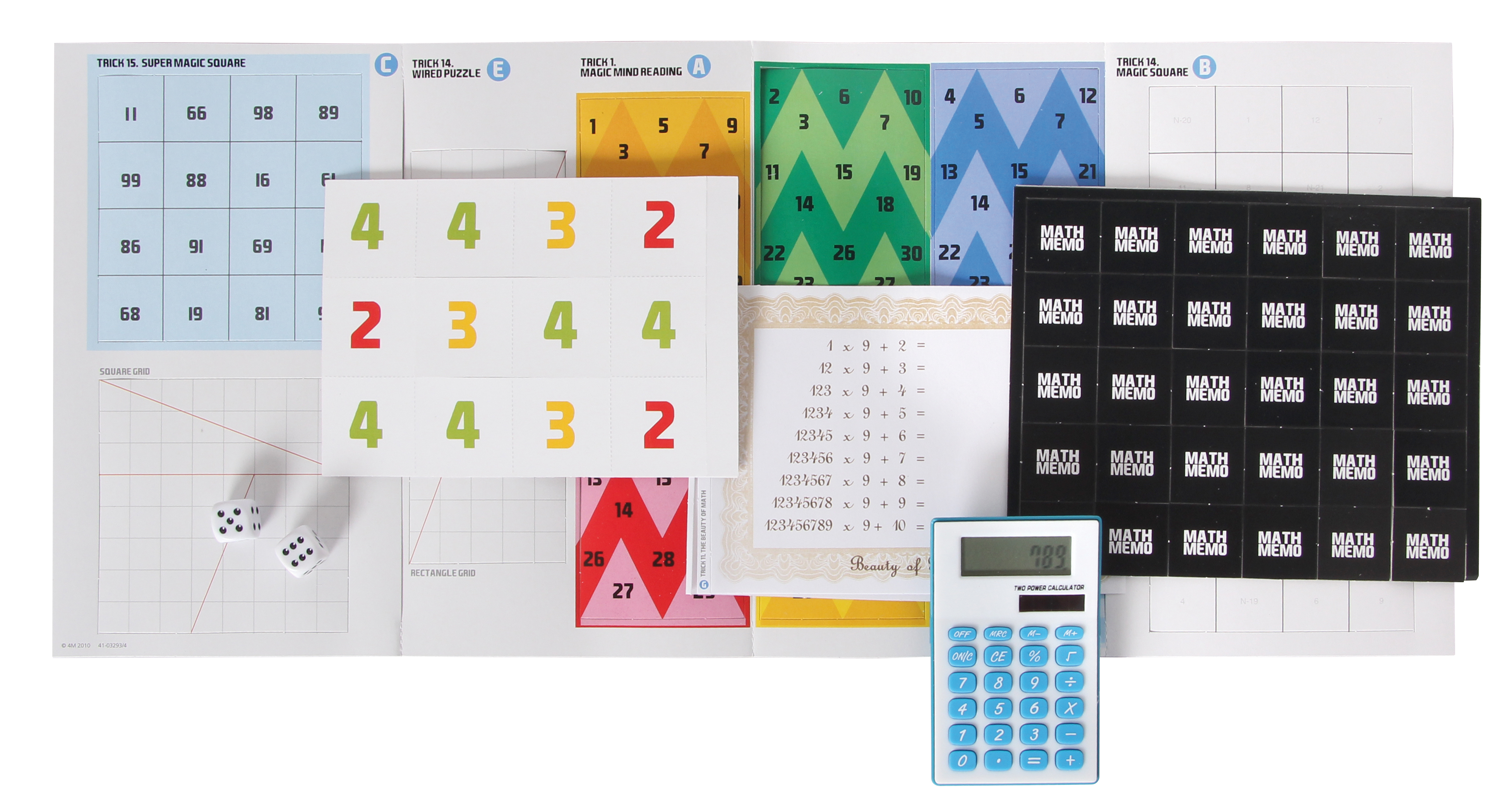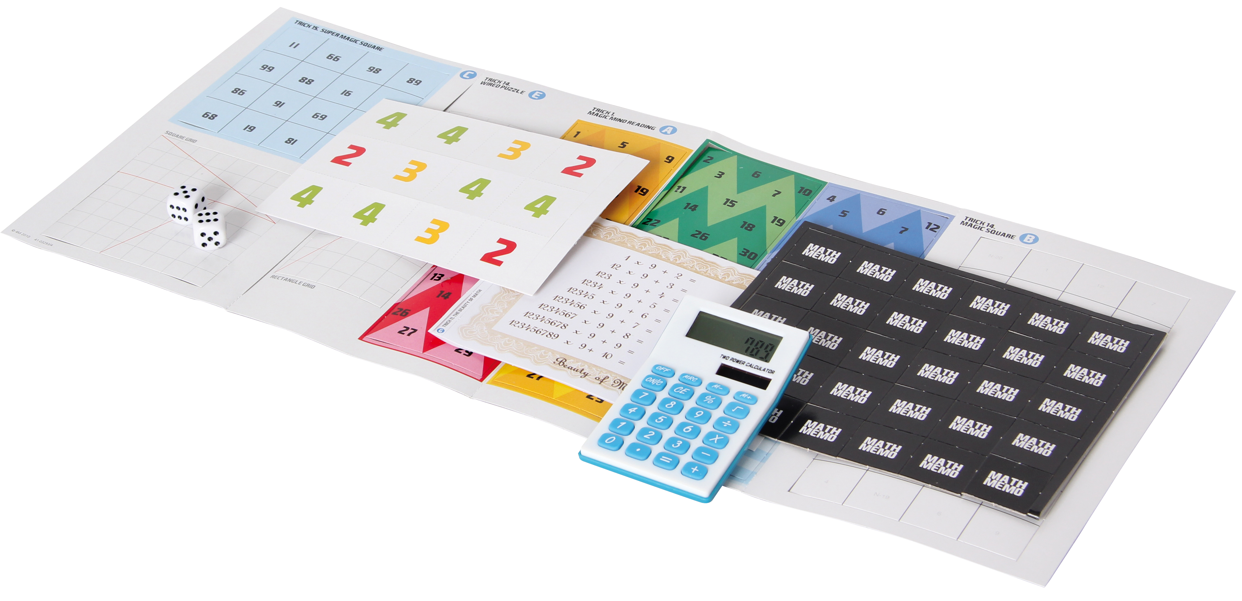 Mehr als 15 spannende Mathetricks, Spiele und Puzzles! Ab 8 Jahren. Inhalt: Taschenrechner, 2 Würfel, 1 Set magische Karten, 2 magische Quadrate, 1 Set Mathe-Karten, 40 Mathe-Memokarten, Papier zum Hindurchgehen, Anleitung.