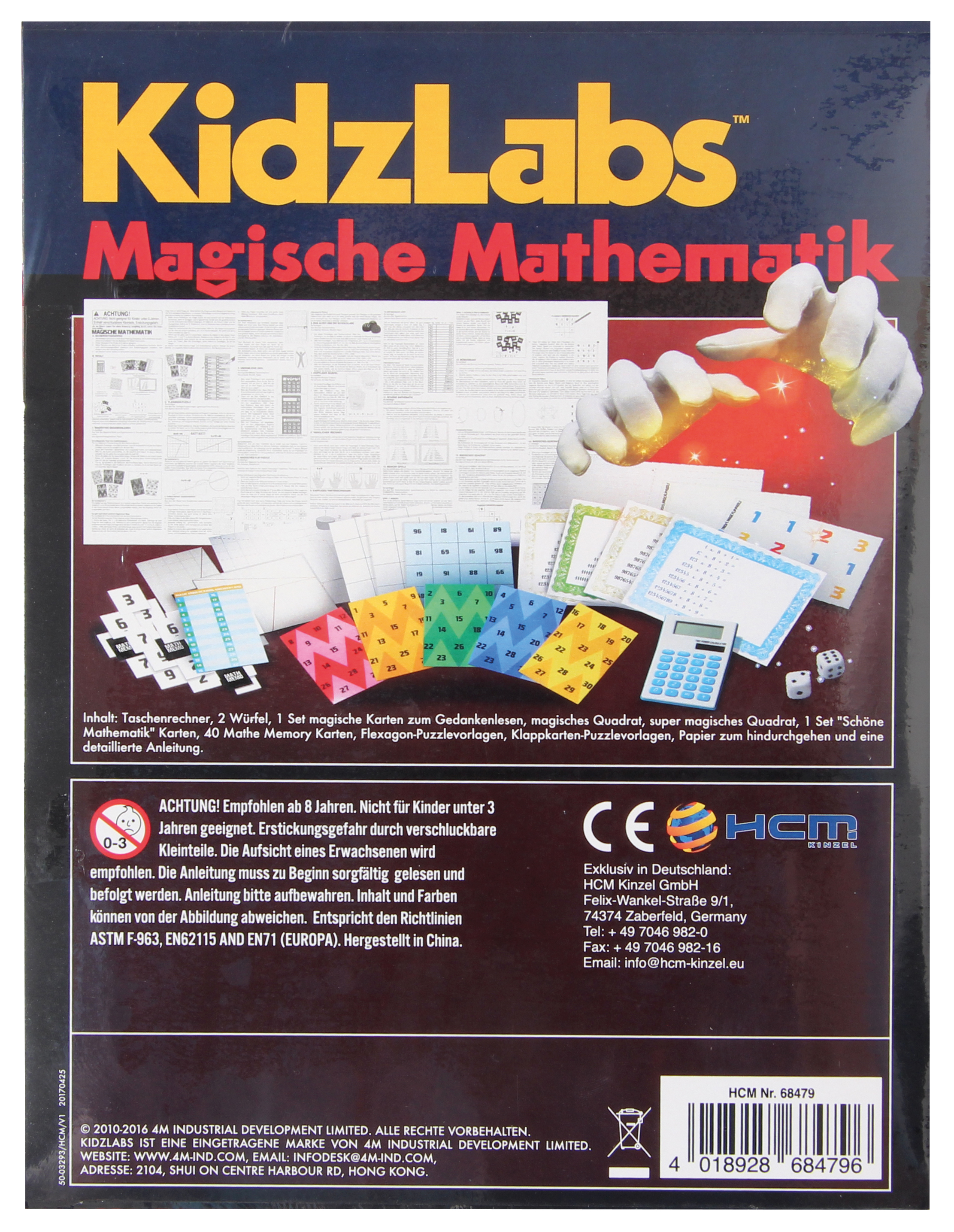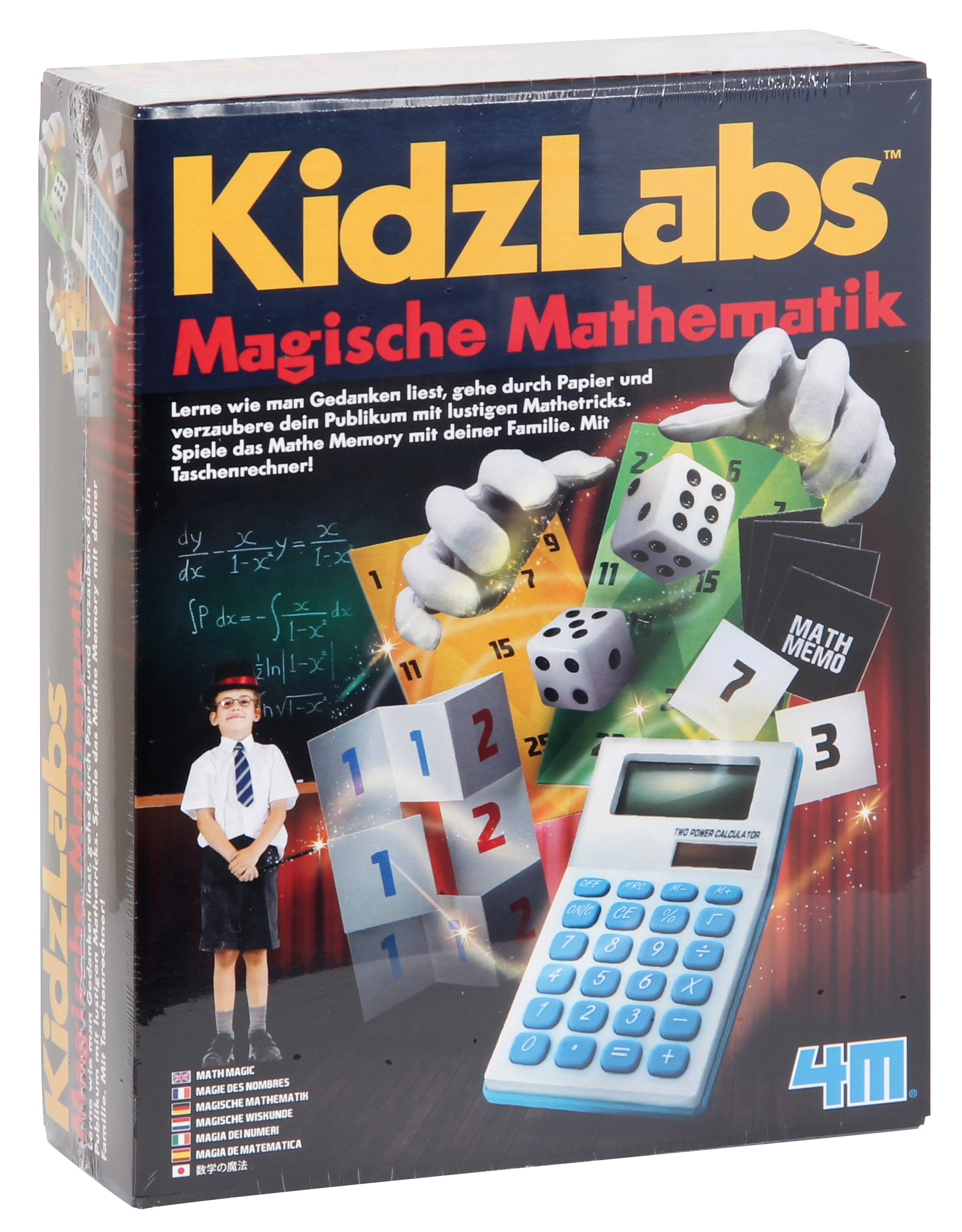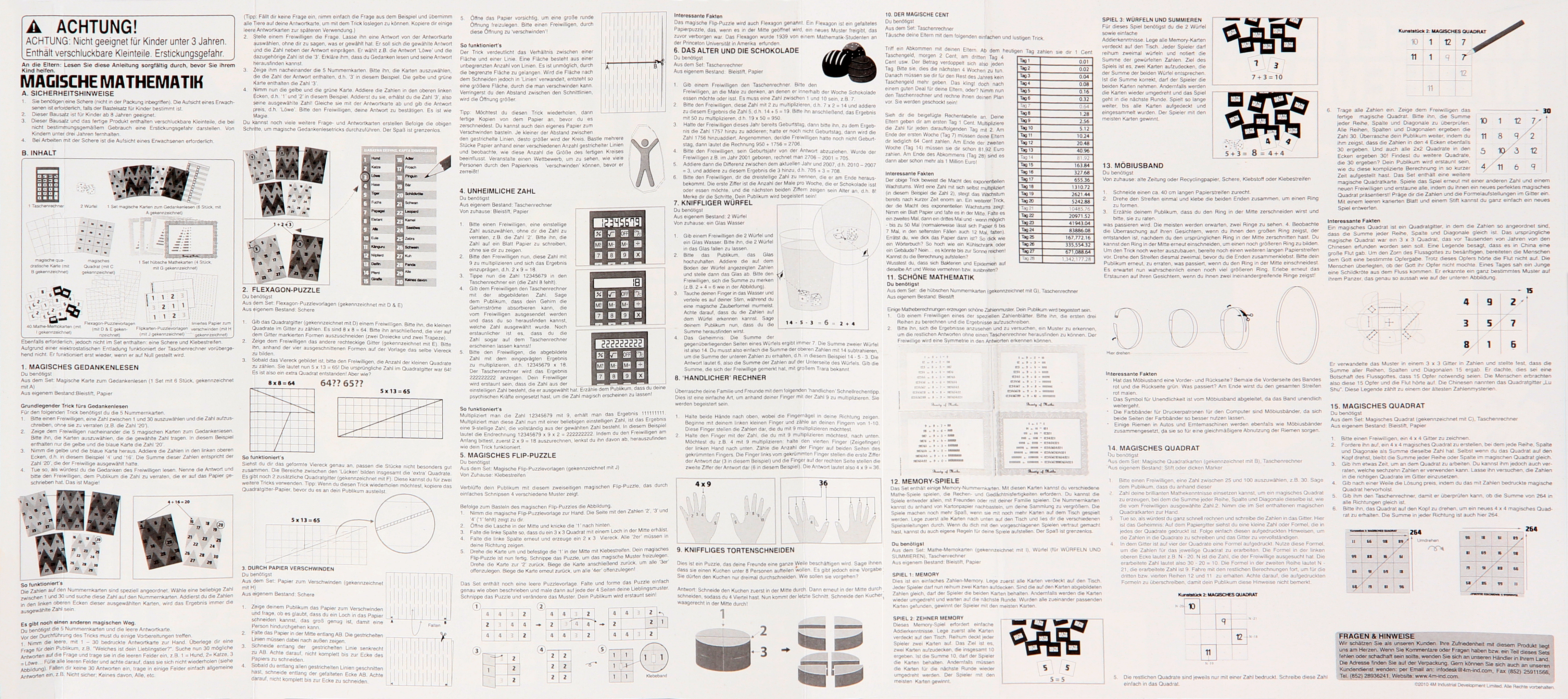Mehr als 15 spannende Mathetricks, Spiele und Puzzles! Ab 8 Jahren. Inhalt: Taschenrechner, 2 Würfel, 1 Set magische Karten, 2 magische Quadrate, 1 Set Mathe-Karten, 40 Mathe-Memokarten, Papier zum Hindurchgehen, Anleitung.