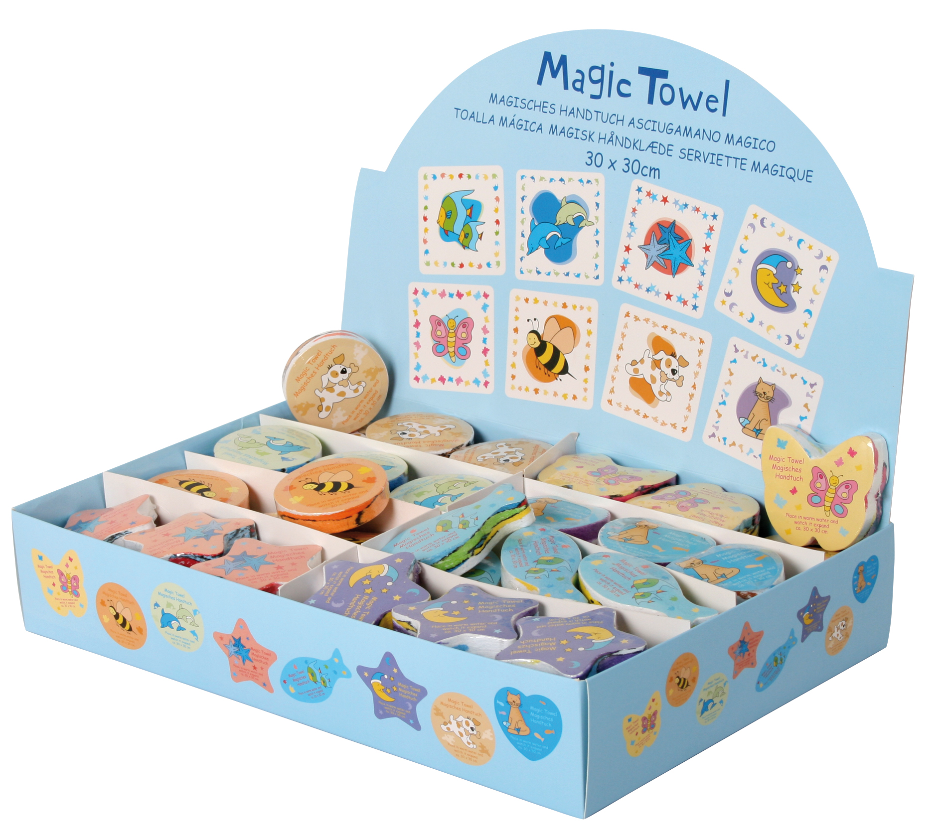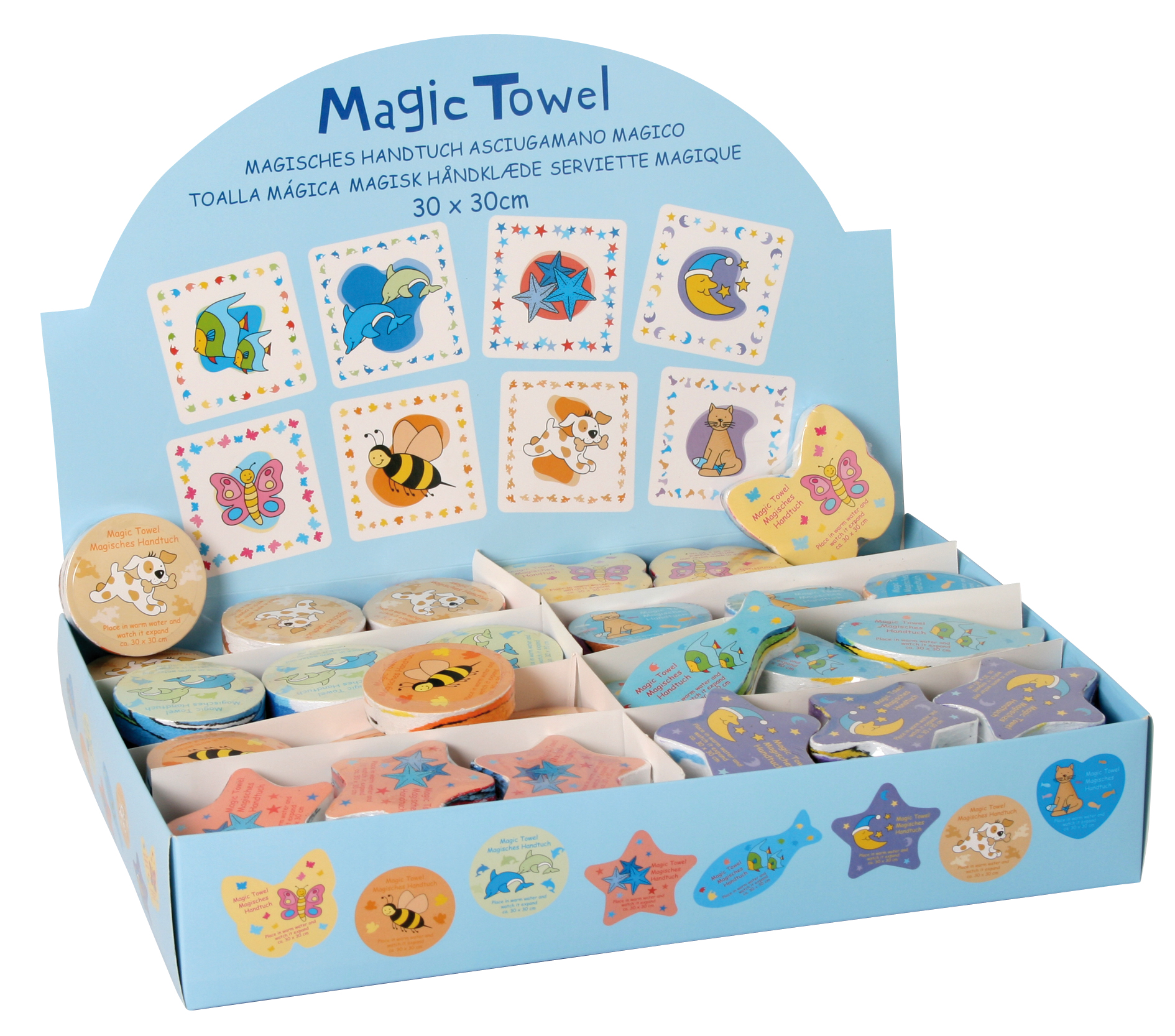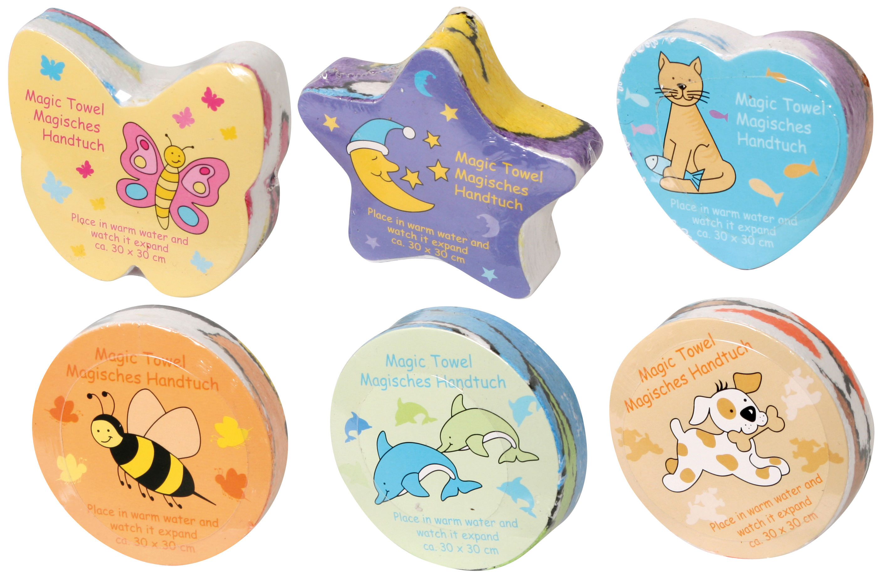 Das Päckchen wird, in warmes Wasser gelegt, wie von Zauberhand zum ca. 30 x 30 cm großen Handtuch. 100 % Baumwolle. Acht Dessins sortiert.