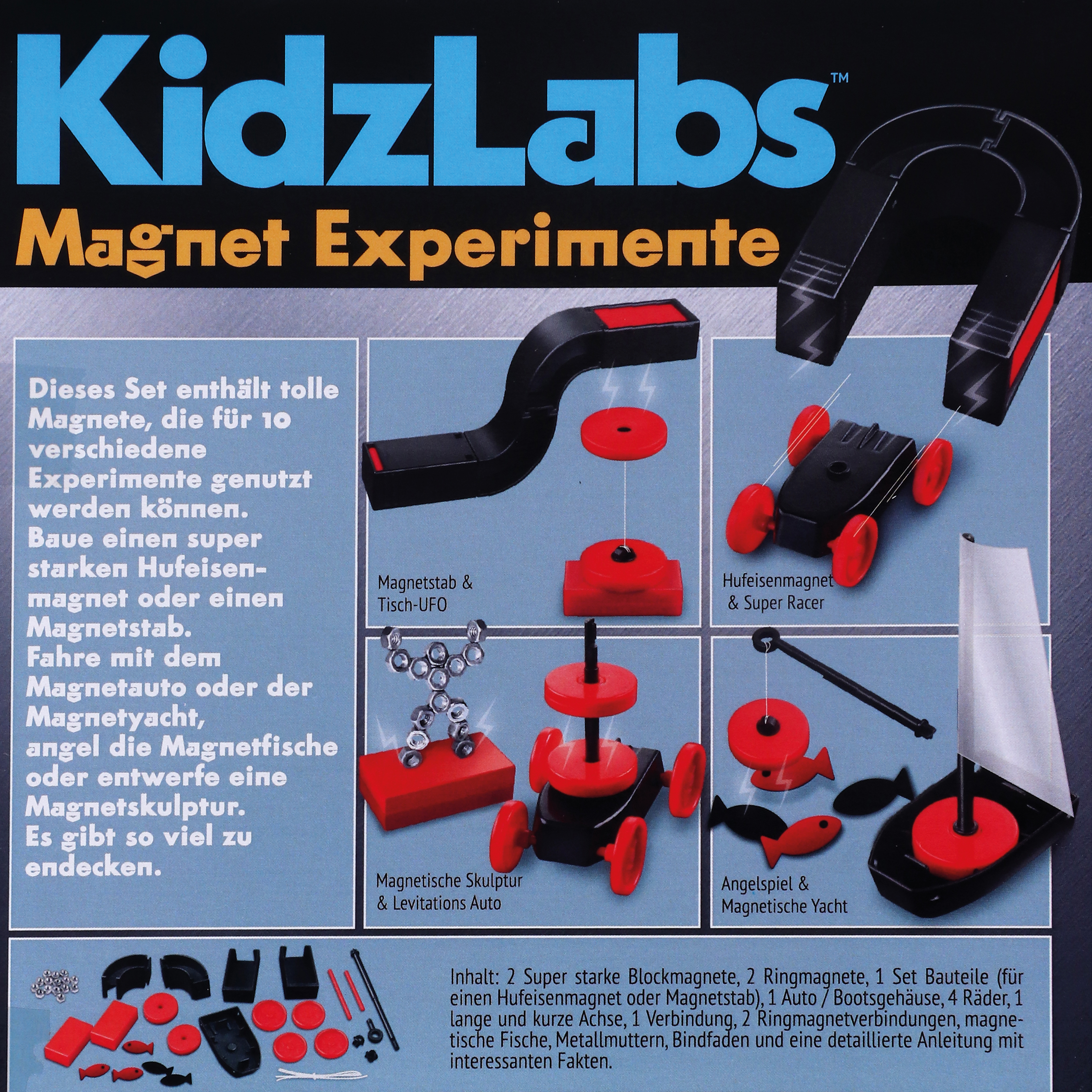 10 spannende Experimente mit Magneten. Lass das Magnet-Auto fahren, angle Fische oder entwirf Magnet-Figuren, teste den Super Hufeisenmagnet oder den Stabmagneten. Inhalt: 2 Stabmagente, 2 Ringmagnete, 1 Autogehäuse, 4 Räder, 2 Achsen, Stab, 5 magnetische Fische, 15 Metallmuttern, Schnur und eine detaillierte Anleitung.