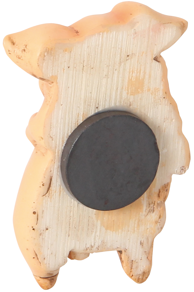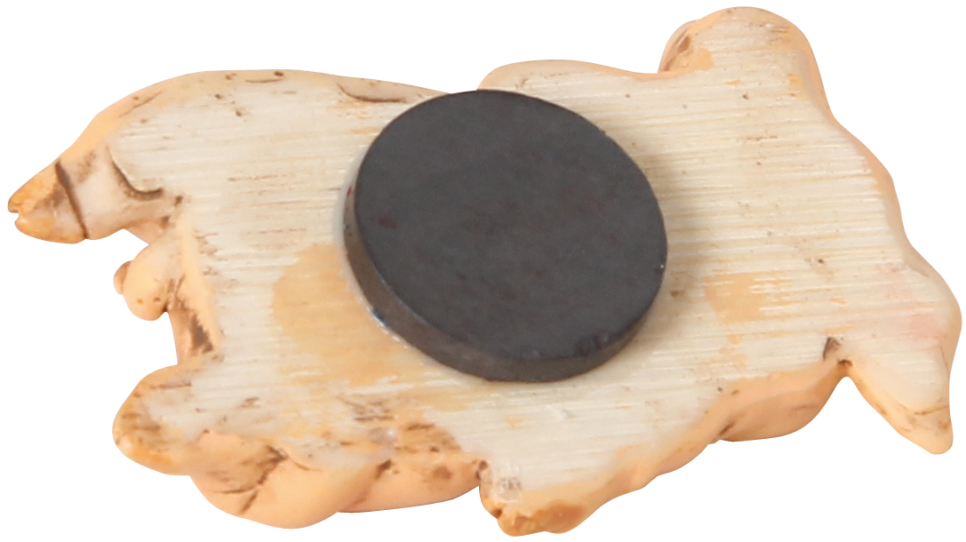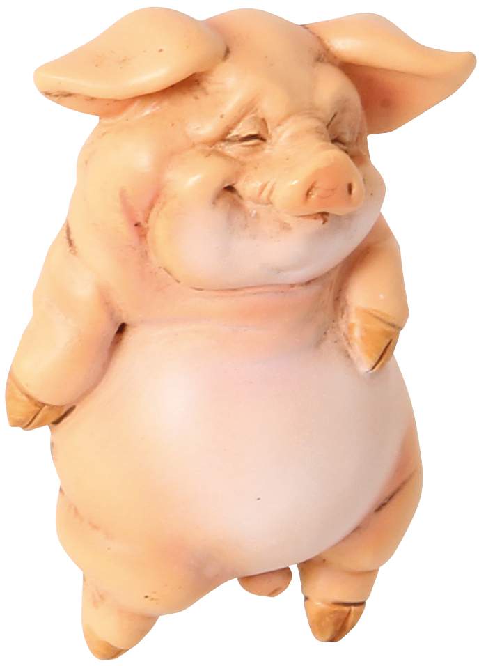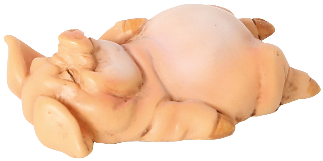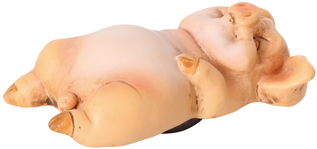 Kleines Polyresin-Schweinchen mit selig entspanntem Gesichtsausdruck und mit Magnet zum Befestigen an Kühlschränken, Magnettafeln oder sonstigen Metallflächen.