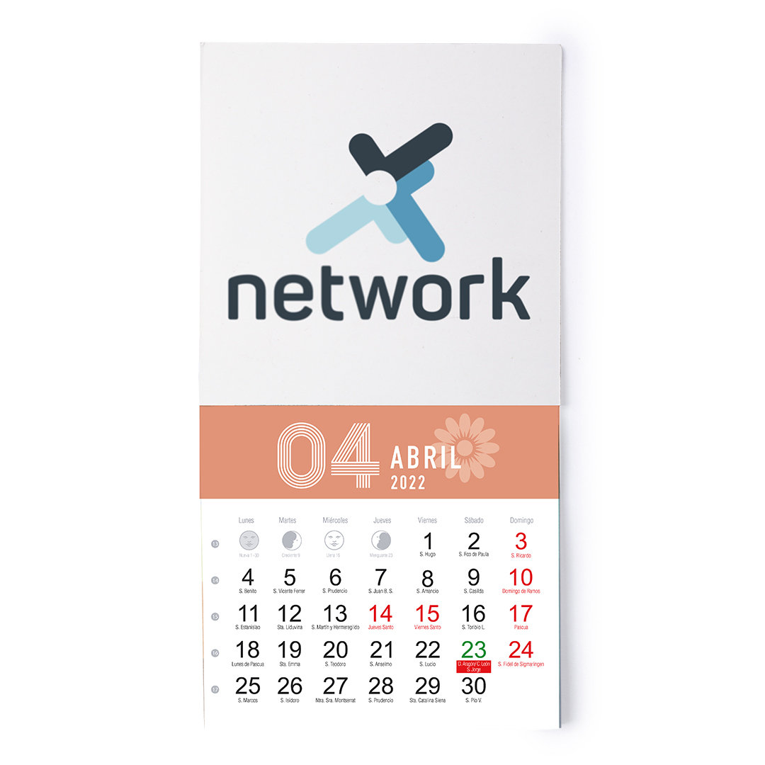Praktischer Kalender mit Magnetseite. Aus Karton, mit fortlaufendem Monat und Heiligendarstellung. Mit großer Druckfläche.