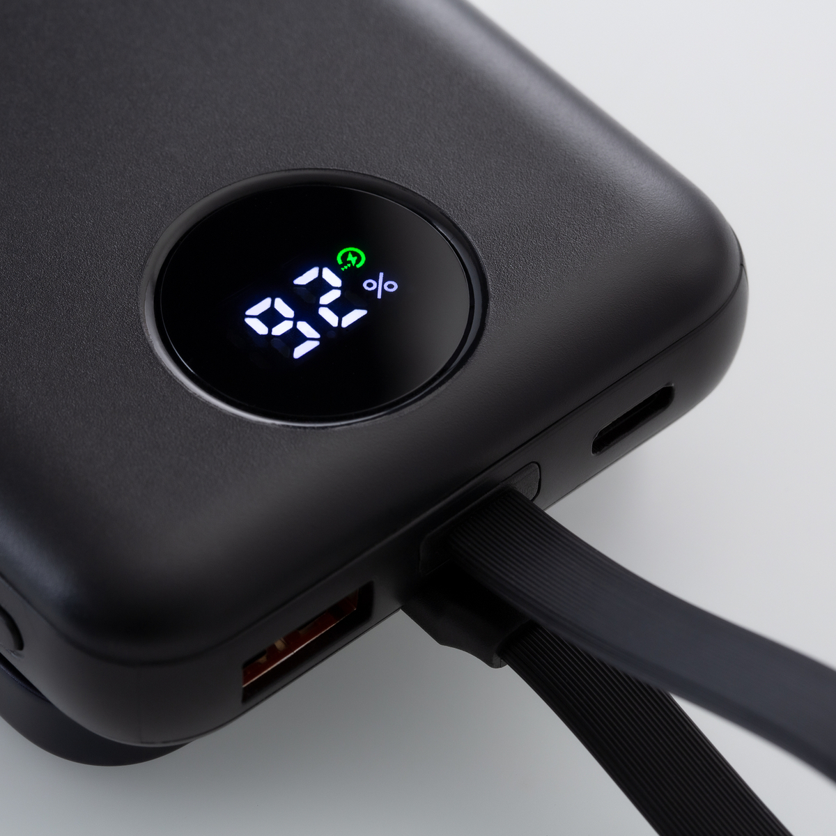 Elegant in Schwarz und praktisch in der Anwendung - Die REEVES-Daiymo Powerbank ermöglicht komfortables Laden unterwegs – ganz ohne Kabelsalat. Dank der magnetischen Halterung lässt sich die Powerbank an die Rückseite der MagSafe®-kompatiblen Endgeräte fixieren und ermöglicht ein kabelloses Laden - ob auf Reisen, unterwegs oder während des Sports. Das schlanke und kompakte Design sorgt für eine problemlose Nutzung während des Ladevorgangs. Mit 10.000 mAh Kapazität, bis zu 15 Watt Ausgangsleistung sowie Power Delivery lädt REEVES-Daiymo Endgeräte effizient auf, sei es Smartphone, Kopfhörer oder Tablet. Durch eine smarte Autoabschaltung nach 30 Sekunden Inaktivität wird Energie gespart. Ein digitales Display zeigt den Ladestand in Prozent an, während ein seitlicher Einschalter für intuitive Bedienung sorgt. Das integrierte USB-C-Ladekabel sorgt für schnelles Laden mit bis zu 20 Watt und kann ebenfalls zum Aufladen der Powerbank verwendet werden. Zusätzlich bieten ein USB-C- und ein USB-A-Anschluss weitere Lademöglichkeiten für verschiedene Endgeräte. Die Powerbank aus recyceltem ABS-Kunststoff bietet eine prominente Werbefläche. Wählen Sie Tampondruck oder UV-Druck und gestalten Sie REEVES-Name mit Ihrer Werbebotschaft! Sie erhalten den Artikel in einer 1C-Geschenkverpackung. Für eine sichere Handhabung ist der Artikel mit allen erforderlichen Schutzschaltungen ausgestattet. REEVES-Daiymo im Überblick:-Wireless Powerbank mit magnetischer Halterung für Endgeräte, die MagSafe® unterstützen-10.000 mAh Kapazität -Bis zu 15 Watt Ausgangsleistung-Fast Charge und Power Delivery-Autoabschaltung 30 Sekunden Inaktivität-Integriertes USB-C Ladekabel für Fast Charge bis zu 20 Watt-Digitales Display zur Ladestandsanzeige-1 USB-C Anschluss-1 USB-A Anschluss-Kompaktes, schlankes Design-Integrierter Überspannungs-, Kurzschluss- und Überhitzungsschutz-Hergestellt aus recyceltem ABS-KunststoffApple® and MagSafe® are registered trademarks of Apple Inc., registered in the US and other countries.