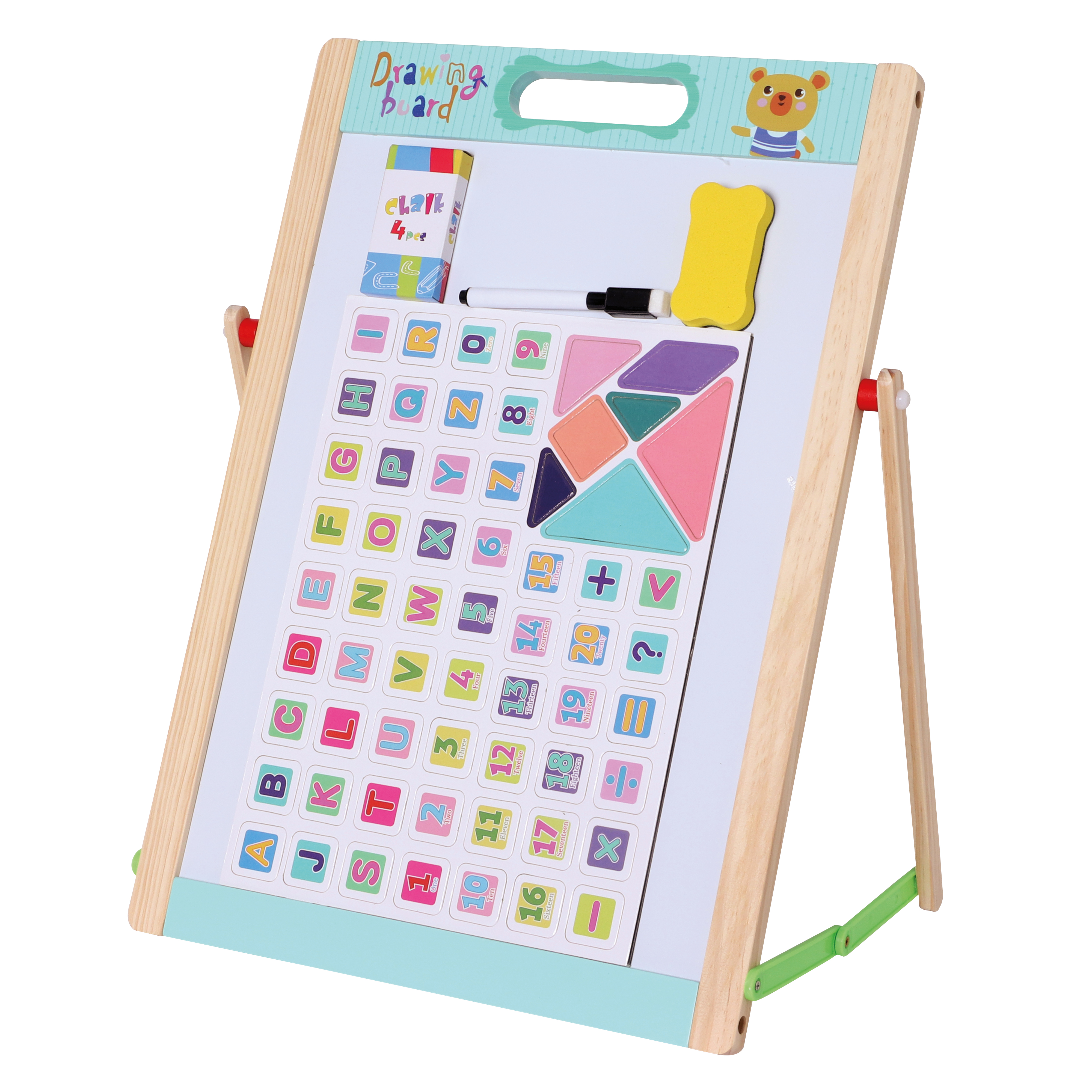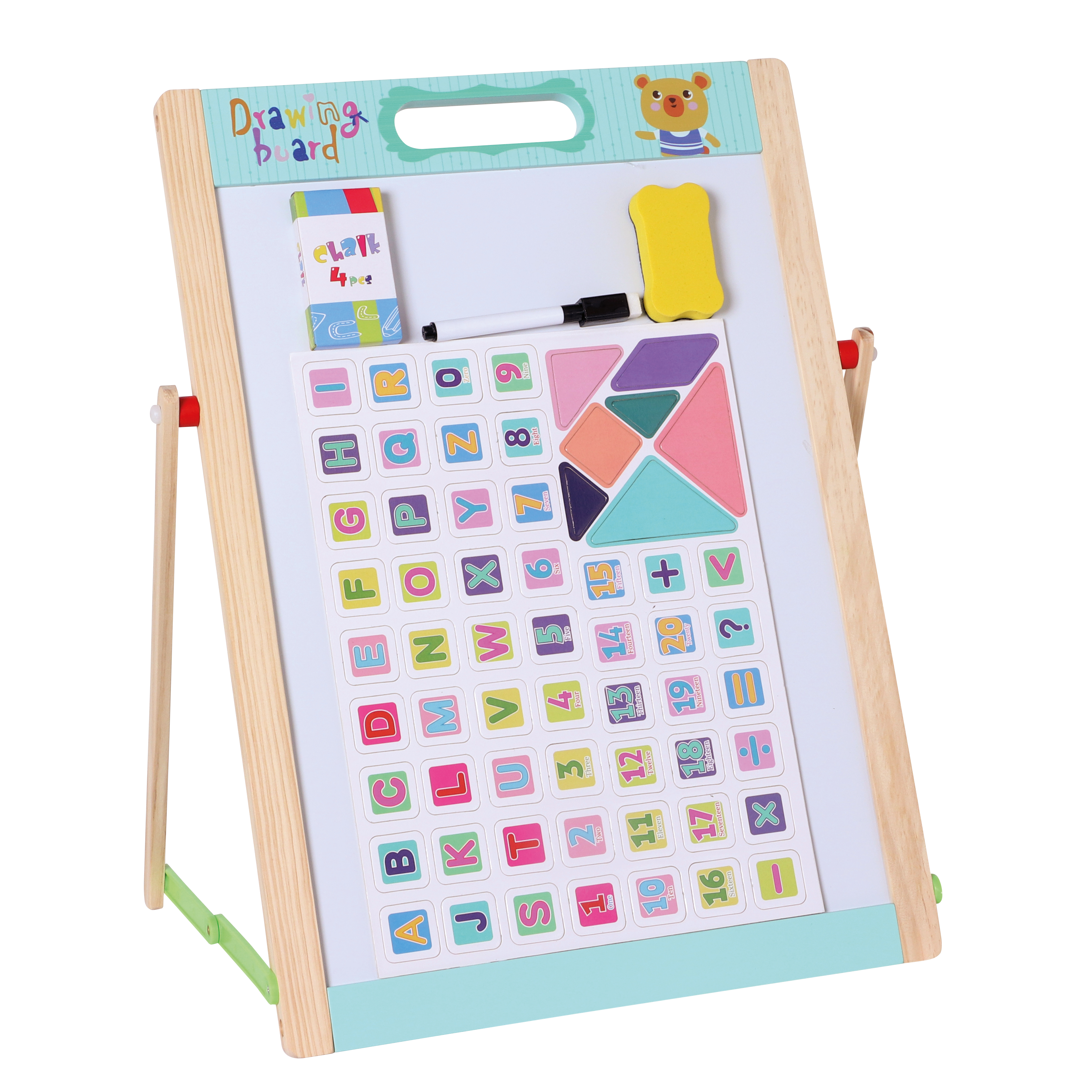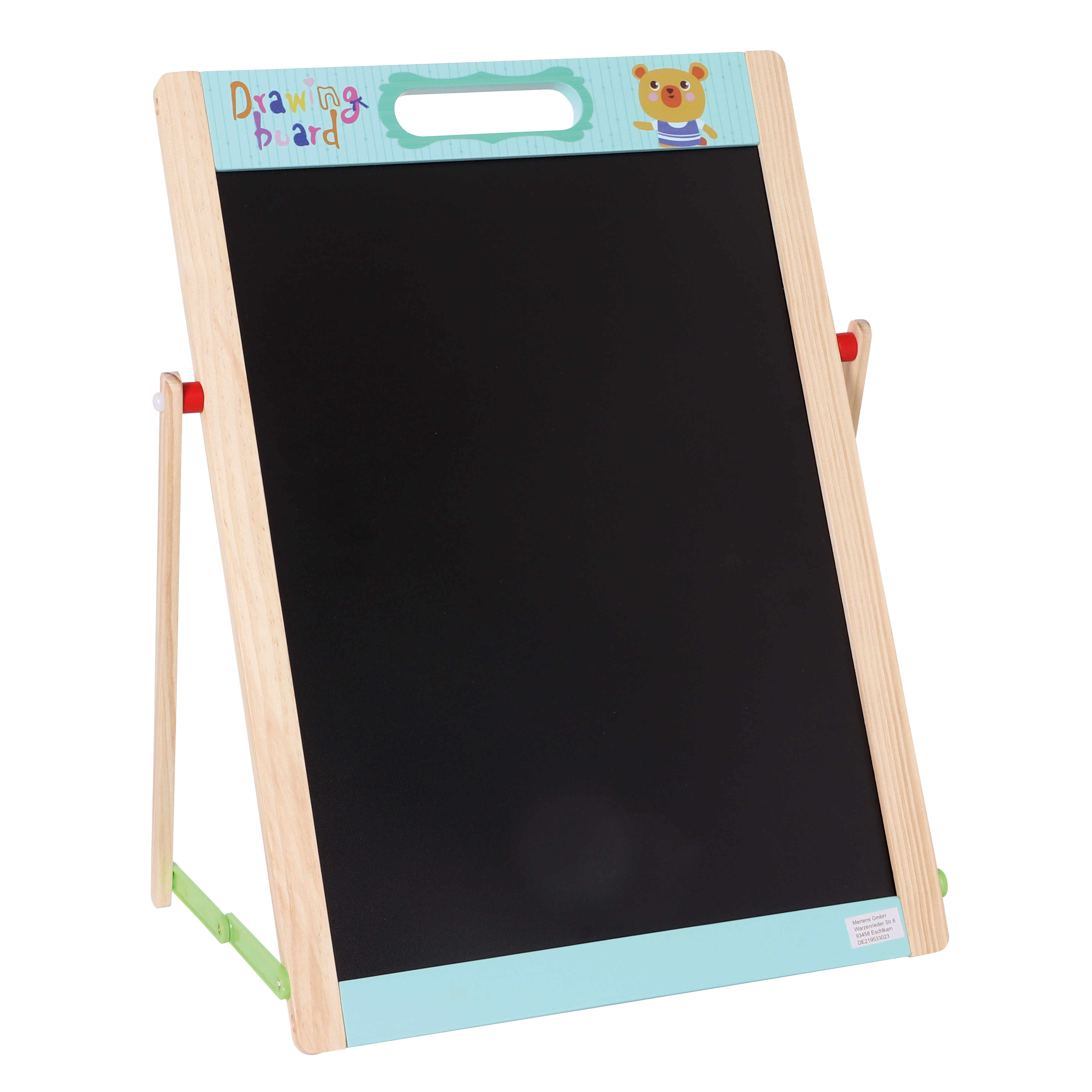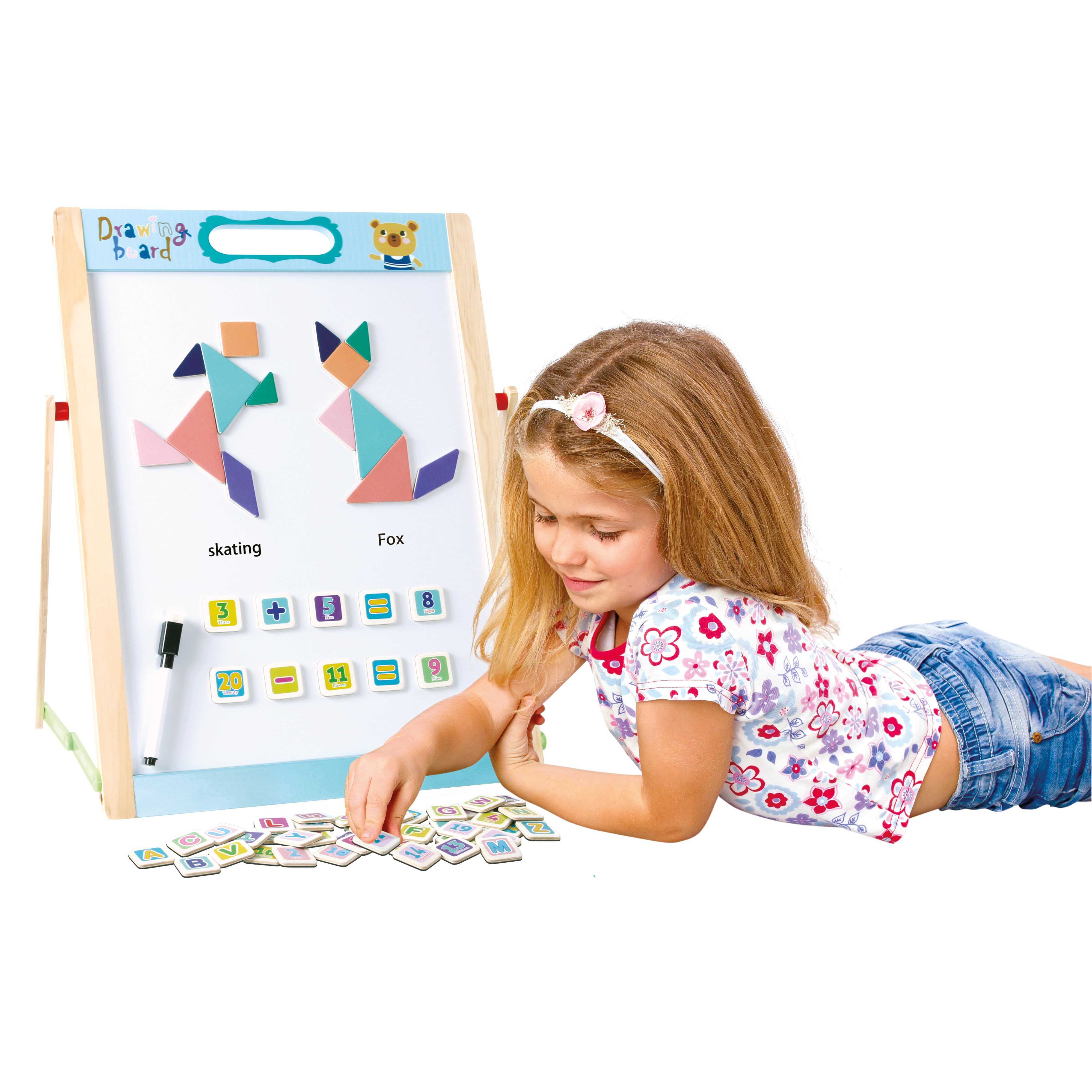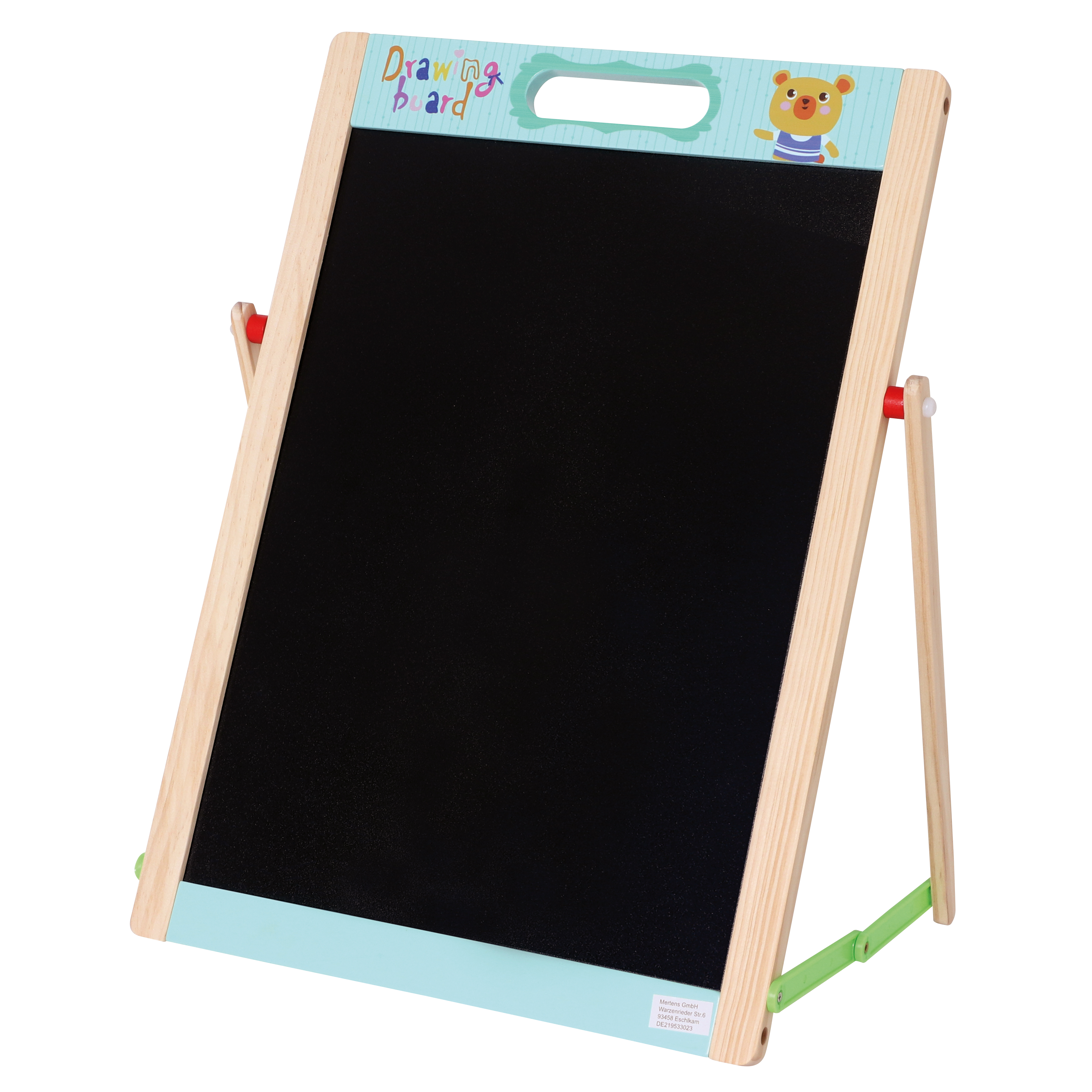 Klappbare, beidseitige Stand-Kindertafel mit viel Zubehör. Eine Seite ist weiß und magnetisch zum Anbringen der mitgelieferten bunten Magnetbilder bzw. zum Beschriften mit Filzstiften. Die andere Seite ist aus beschichtetem Holz zum Beschriften mit Kreide. Kreide, Filzstift und Radierer liegen bei.