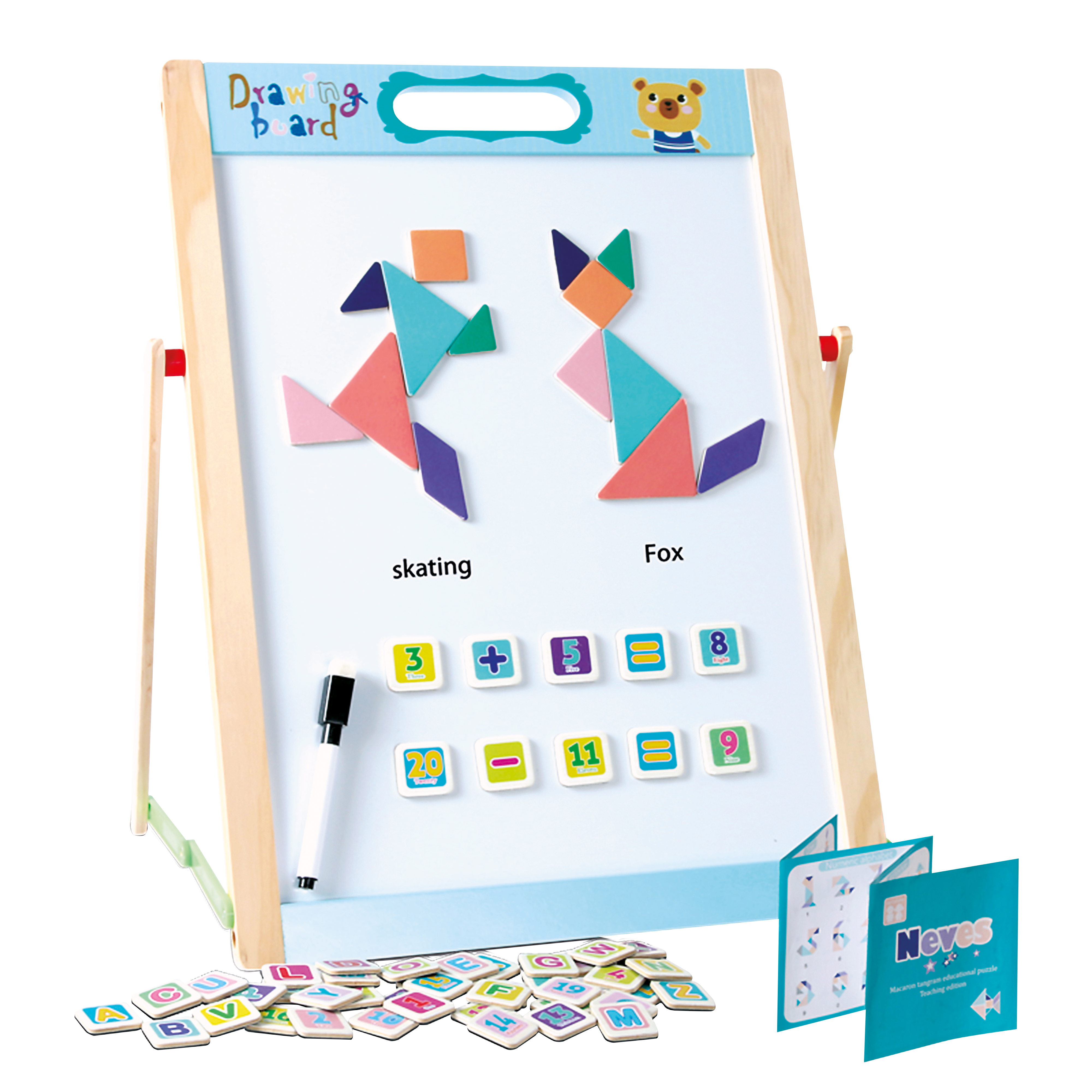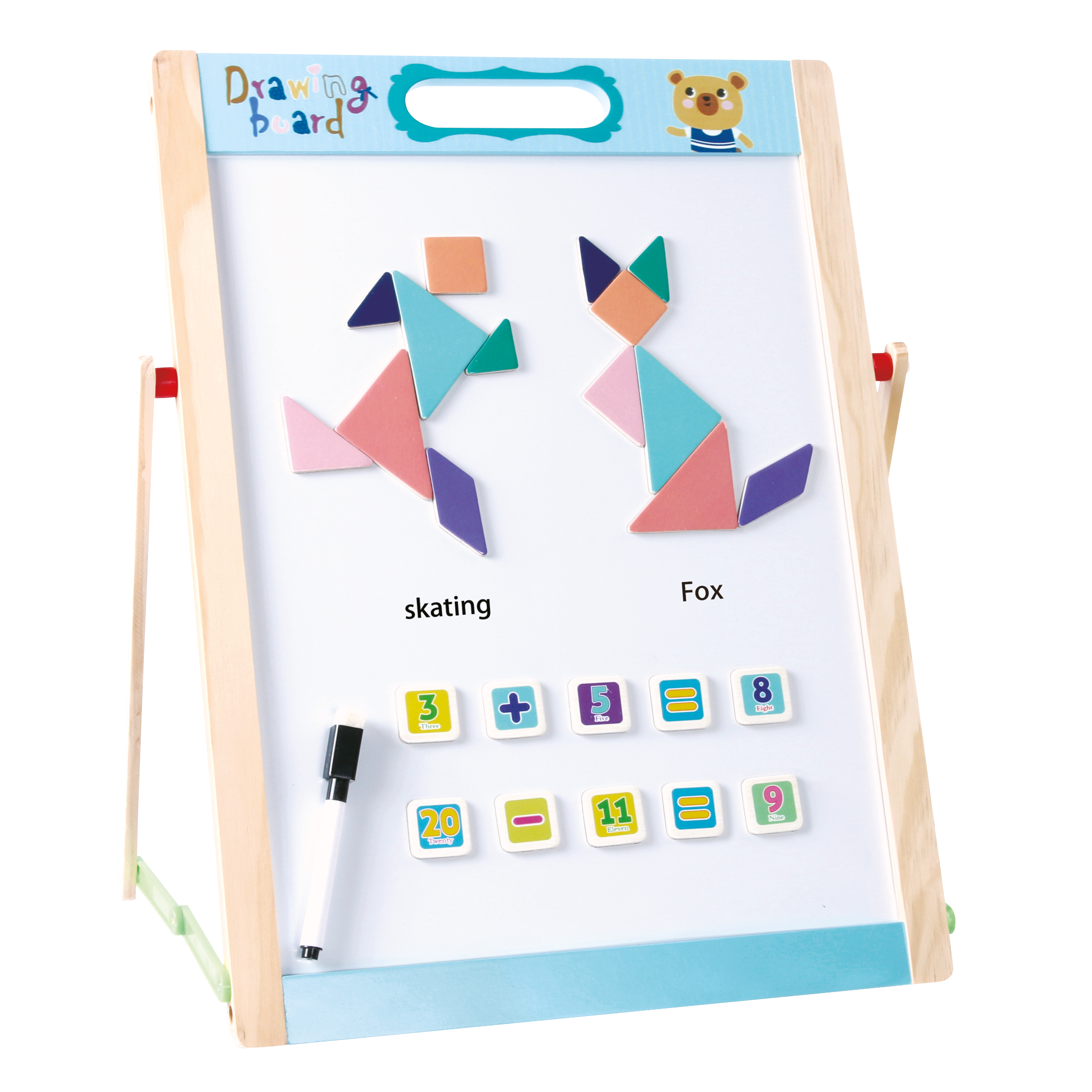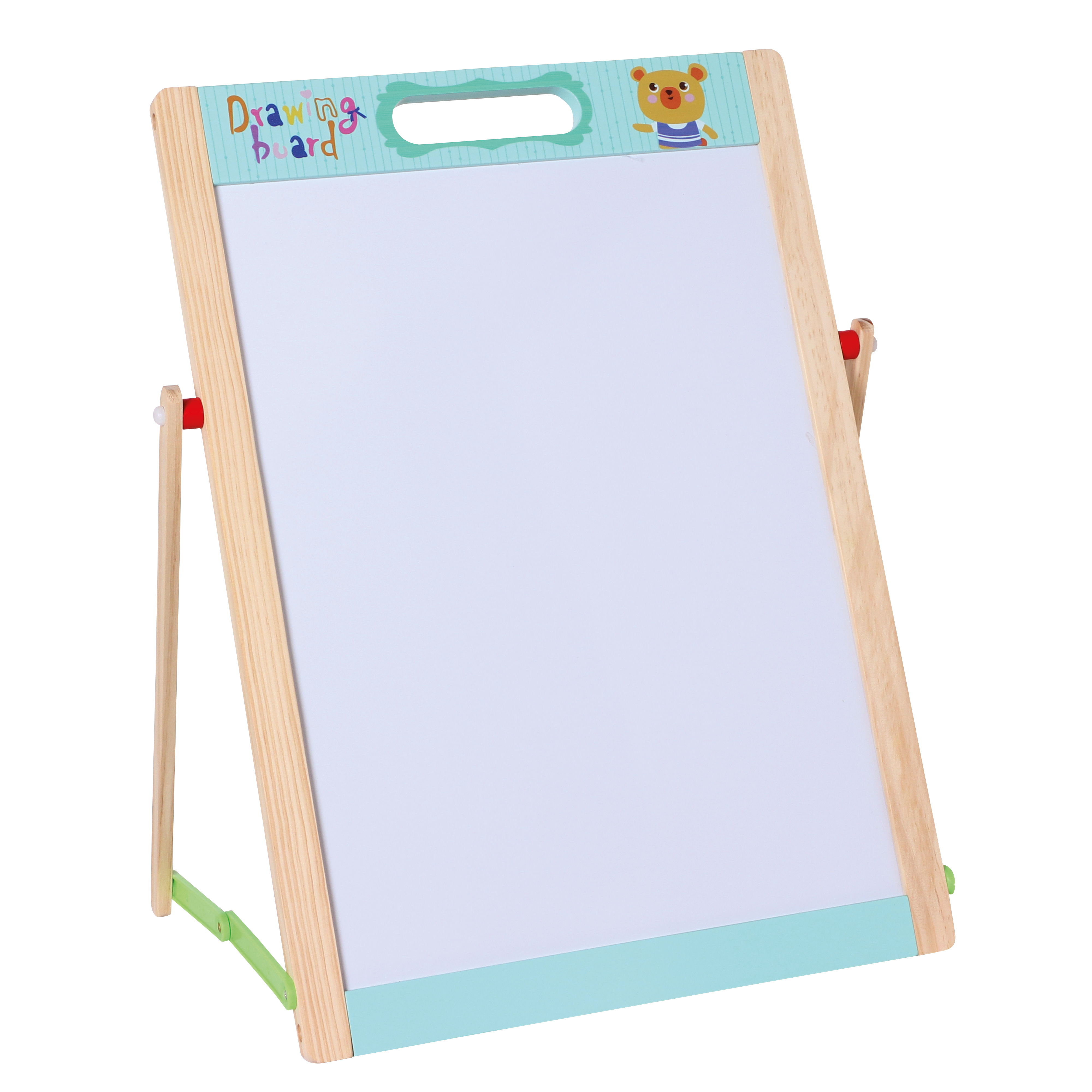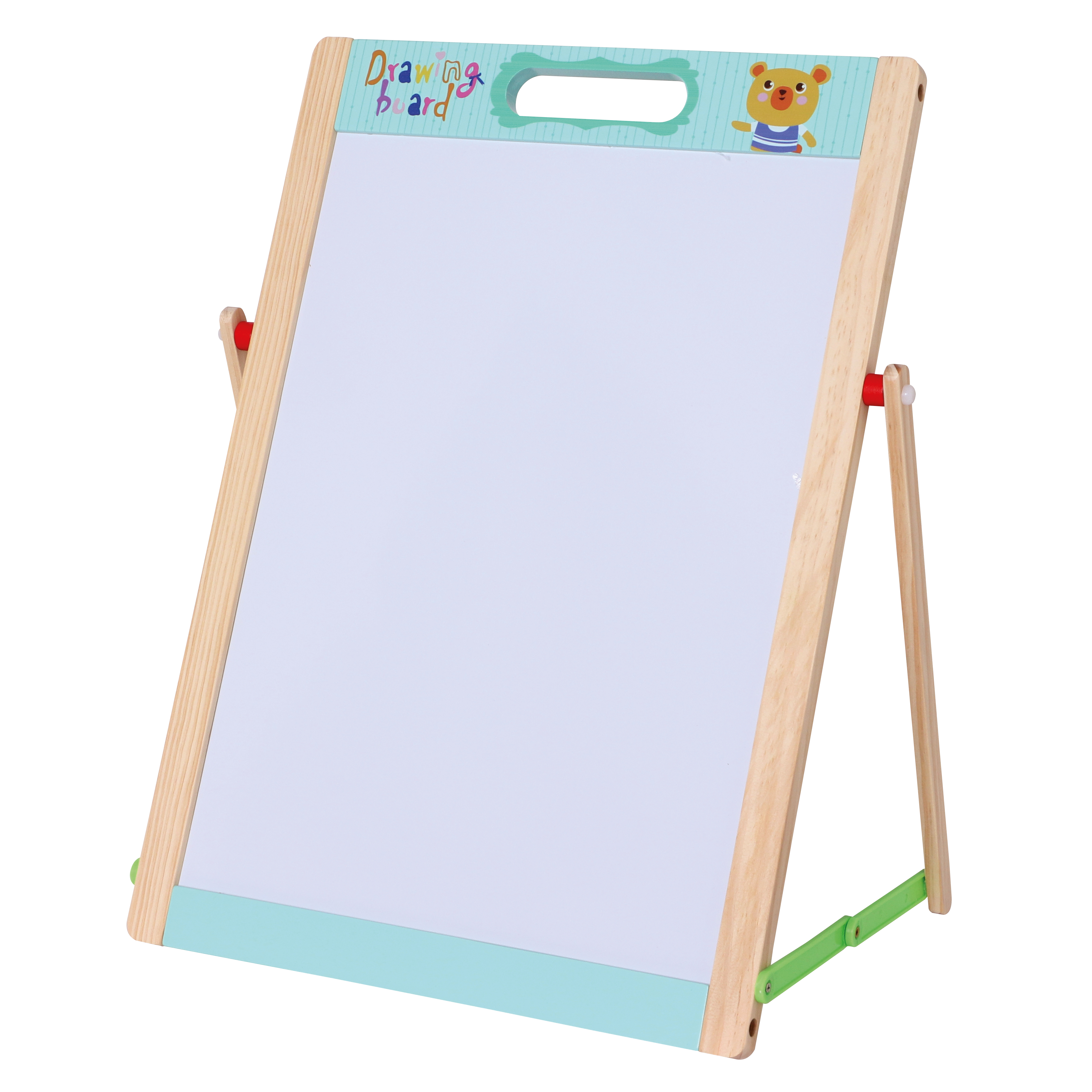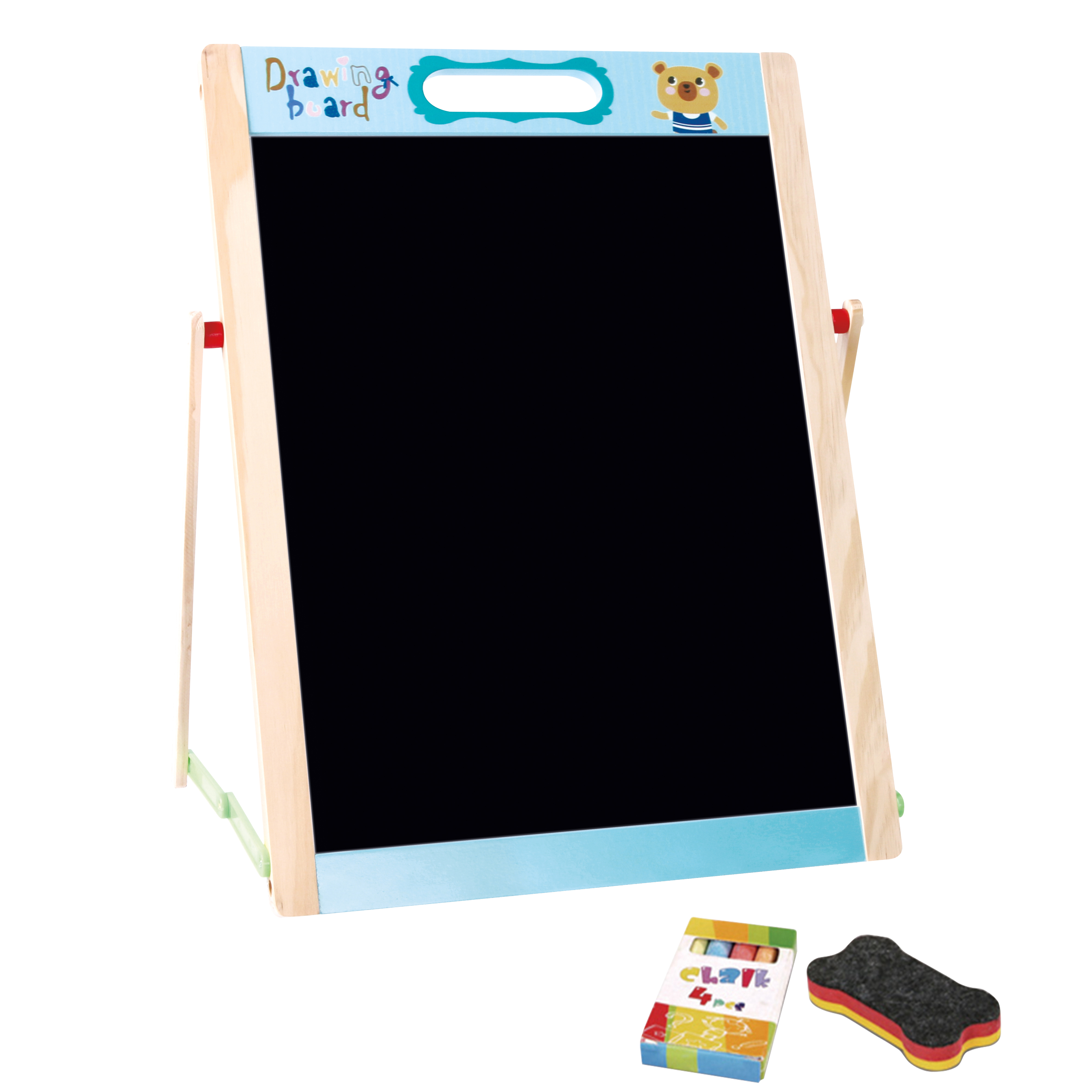 Klappbare, beidseitige Stand-Kindertafel mit viel Zubehör. Eine Seite ist weiß und magnetisch zum Anbringen der mitgelieferten bunten Magnetbilder bzw. zum Beschriften mit Filzstiften. Die andere Seite ist aus beschichtetem Holz zum Beschriften mit Kreide. Kreide, Filzstift und Radierer liegen bei.