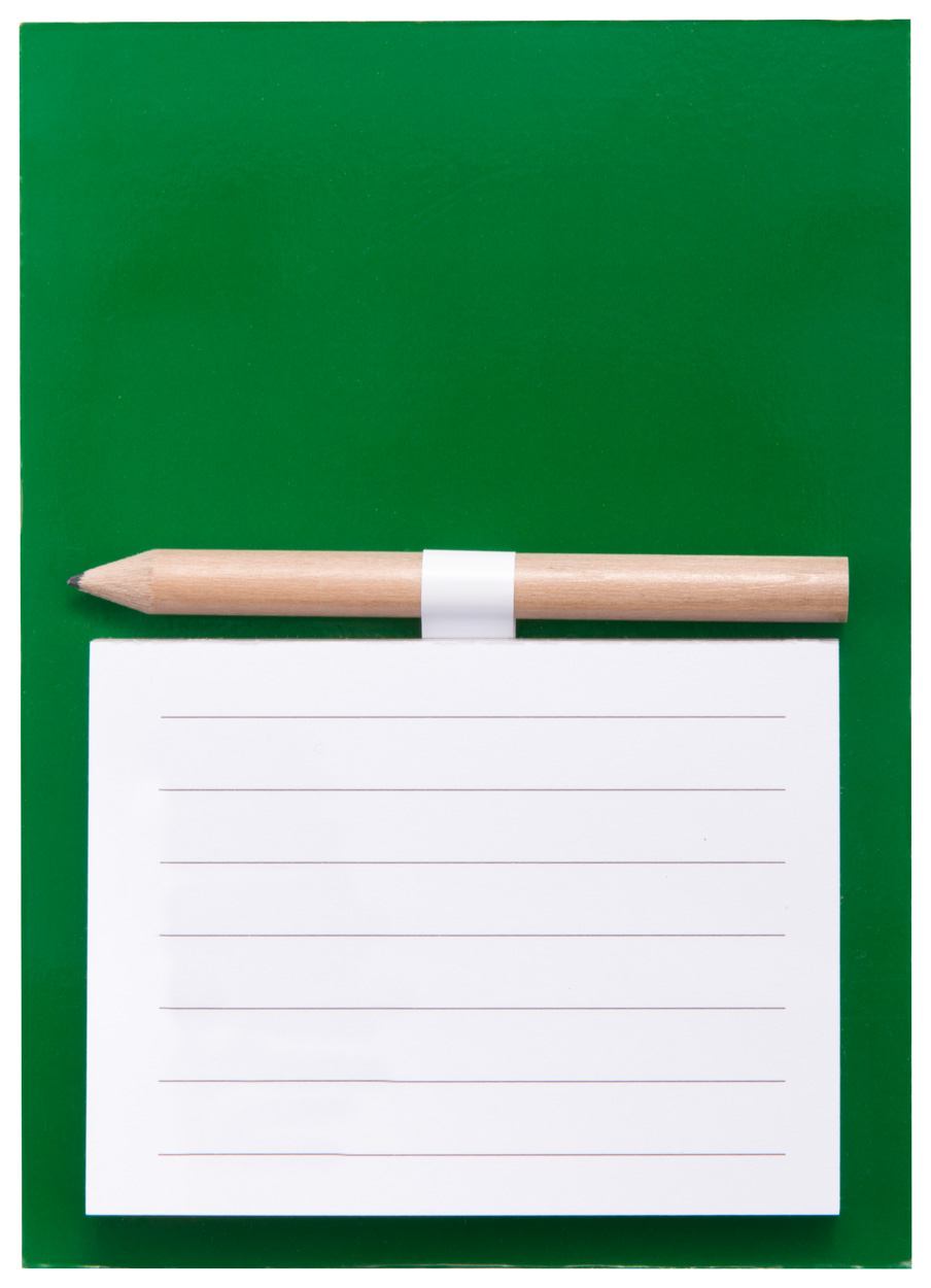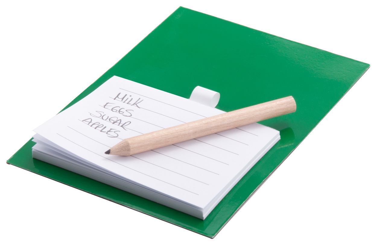 Farbiger Kühlschrankmagnet mit Notizblock (40 Seiten) und Mini-Bleistift.