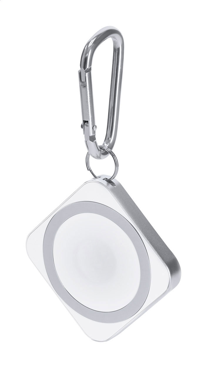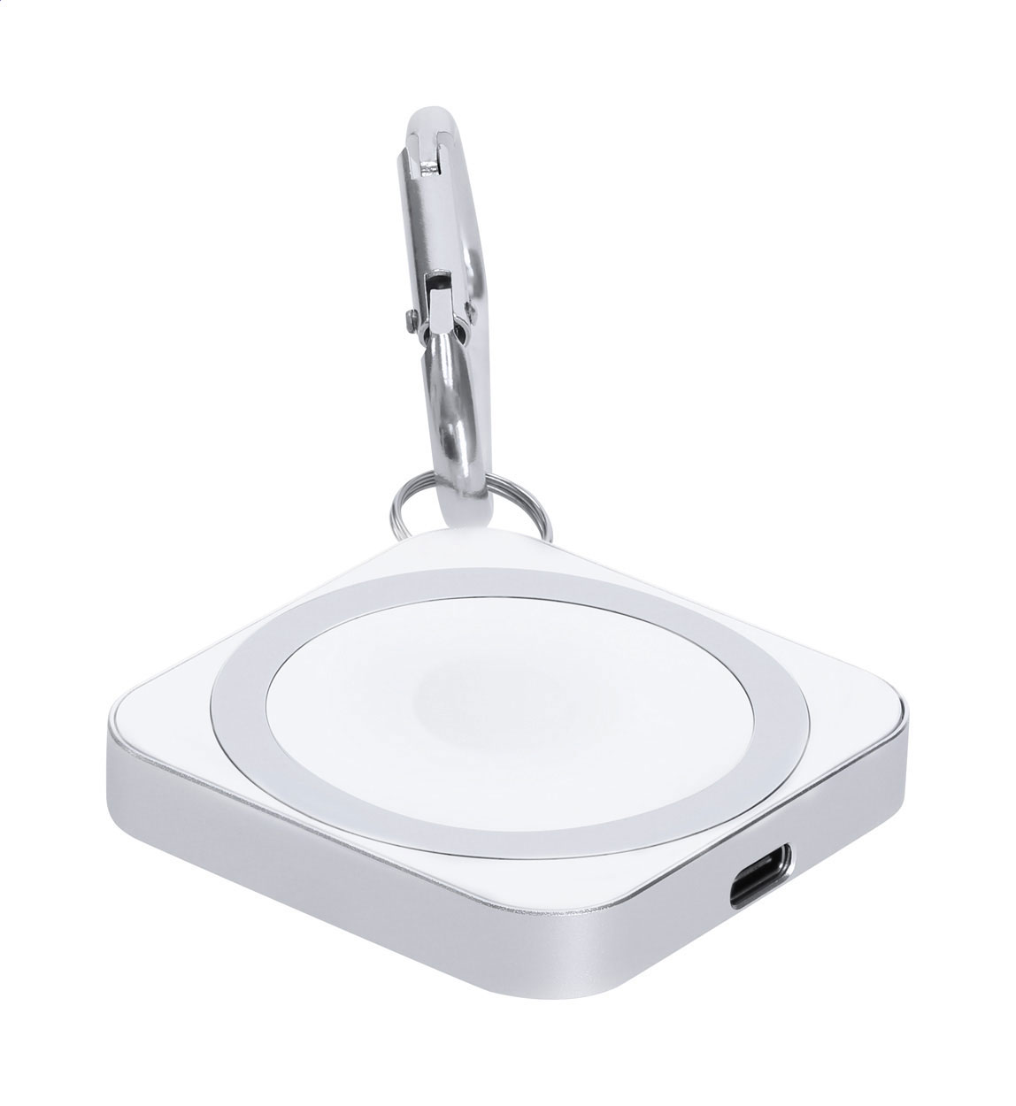 Magnetisches Wireless-Charger (15W) im Aluminiumgehäuse mit Karabiner. Entwickelt zum Laden von Smartphones, Kopfhörern und Smartwatches. Kompatibel mit iPhone® 12 oder neuer.