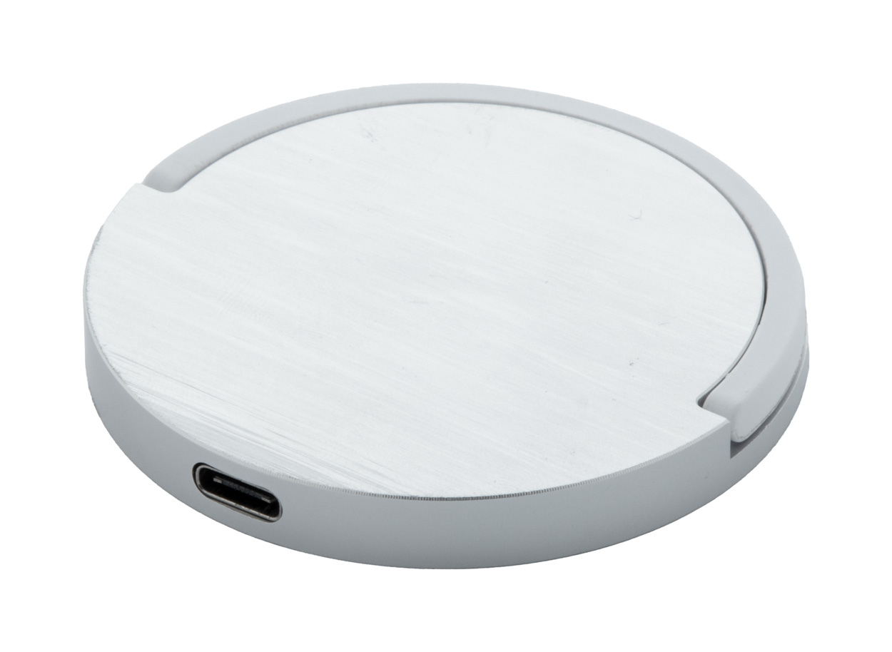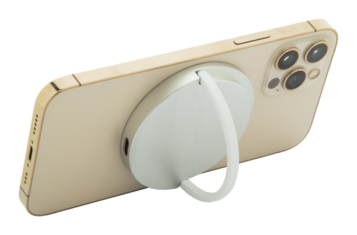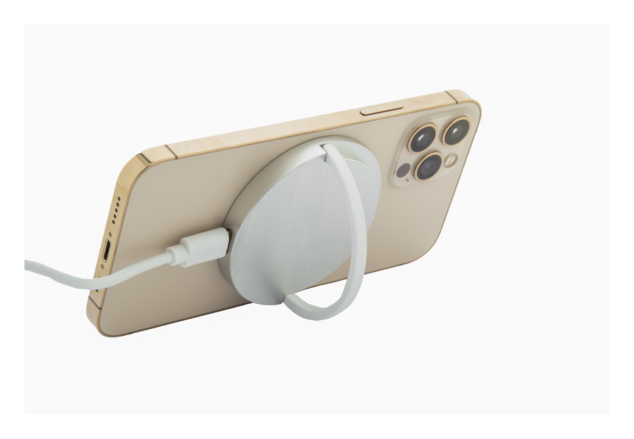 Magnetischer Wireless-Fastcharger (15W) aus recyceltem Aluminium und RABS-Kunststoff mit Handyhalterring. Kompatibel mit iPhone® 12 oder neuer. Inkl. USB-Ladekabel.