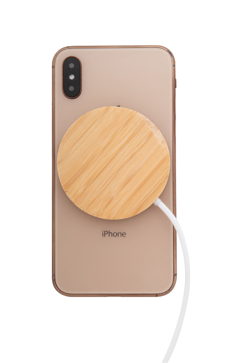 Magnetischer Wireless-Fast-Charger (15 W) mit Gehäuse aus Bambus und transparenten Kunststoff mit sichtbaren elektronischen Bauteilen. Inklusive selbstklebendem Metallring zur Nutzung der Magnetfunktion an jedem kabellos aufladbaren Gerät. Kompatibel mit iPhone® 12 oder neuer. Inklusive USB-C-Ladekabel.