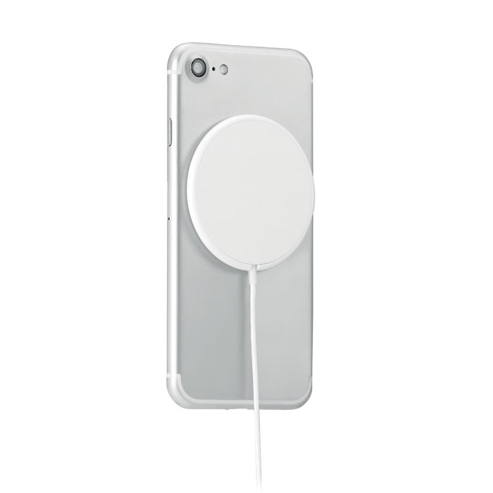 Induktives, magnetisches Ladegerät aus ABS. Ausgang: DC 9V/1.1A (10W) für schnelles Aufladen. Kompatibel mit iPhone® 12 und neuer. Inkl. magnetischem Metallring zur Unterstützung anderer nicht-magnetischer wireless aufladbarer Telefone.