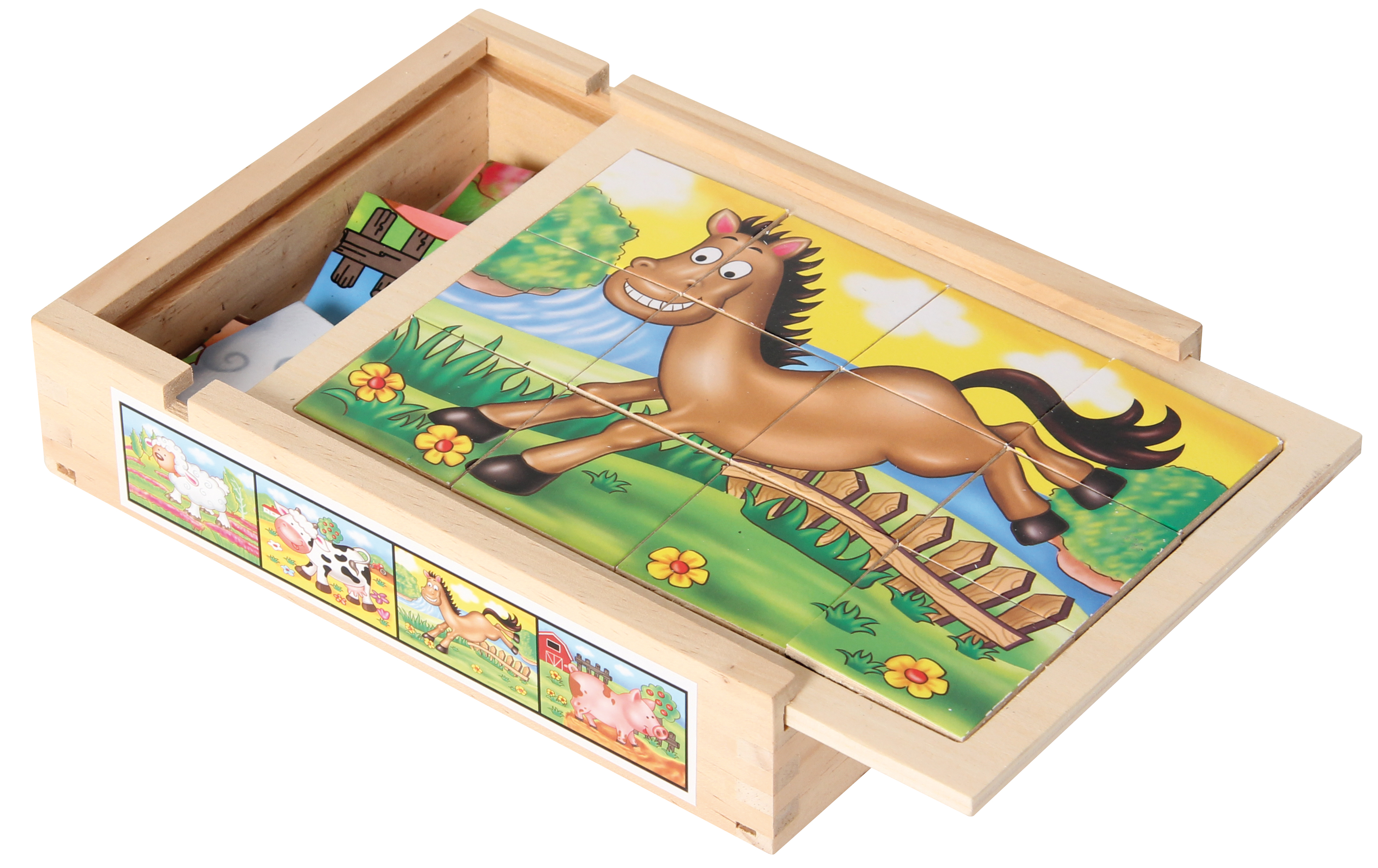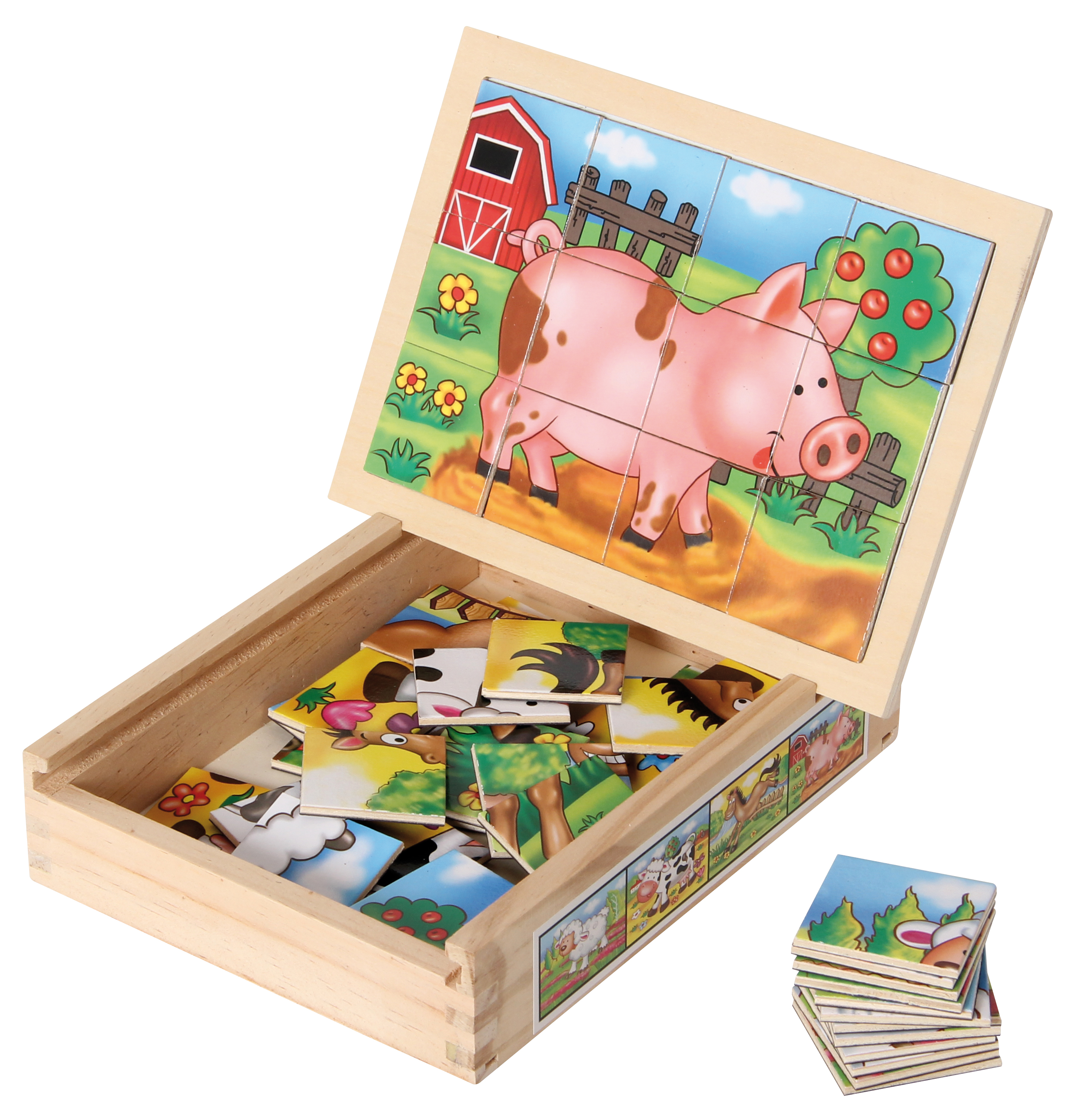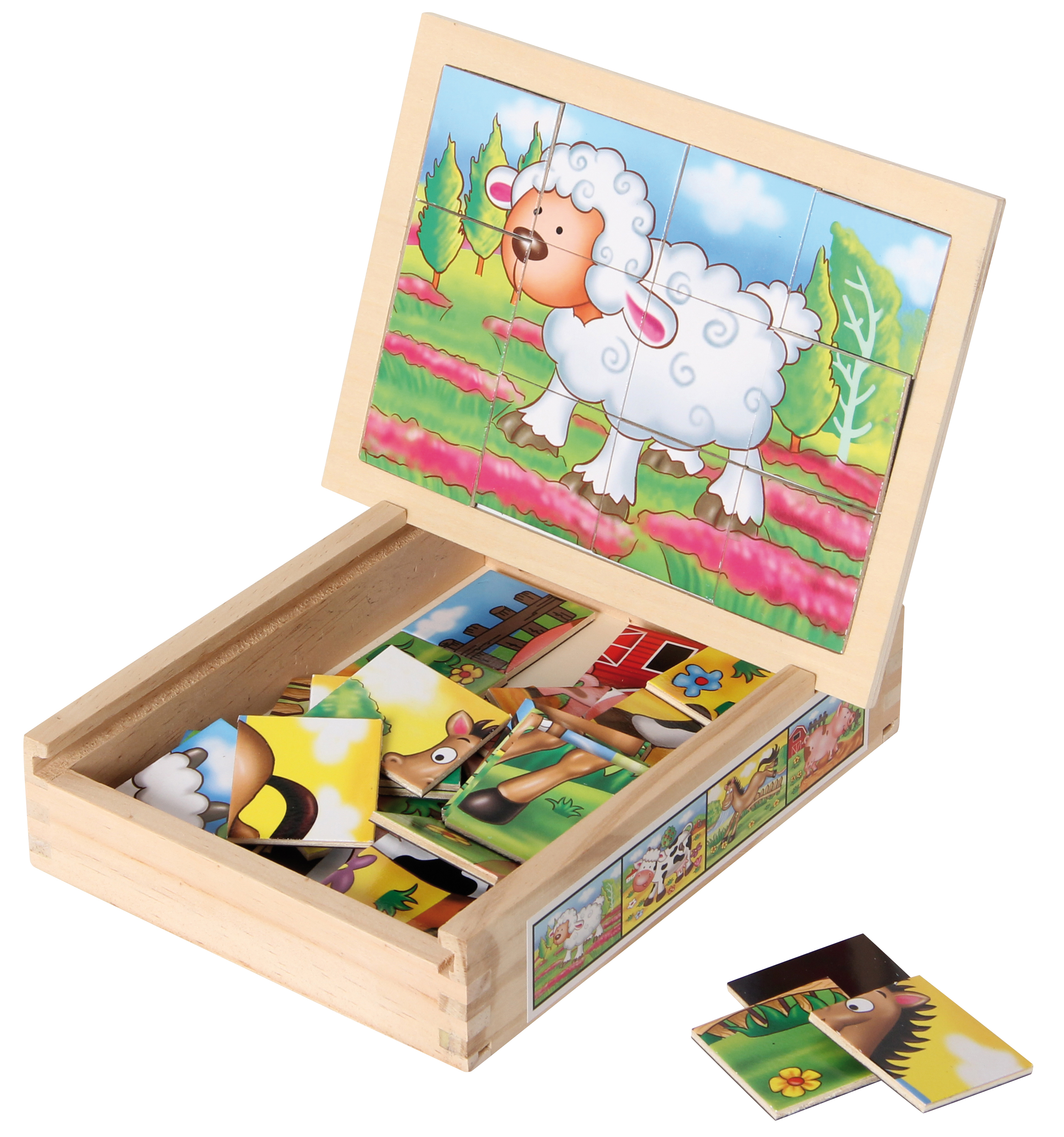 Hochwertiges Set aus vier Holzpuzzles mit Bauernhof-Motiven (Kuh, Schwein, Pferd und Schaf). Die Puzzleteile haben eine magnetisch Rückseite, mit der sie super auf der Tafelseite des Deckels haften. Inhalt: 48 Bildteile.