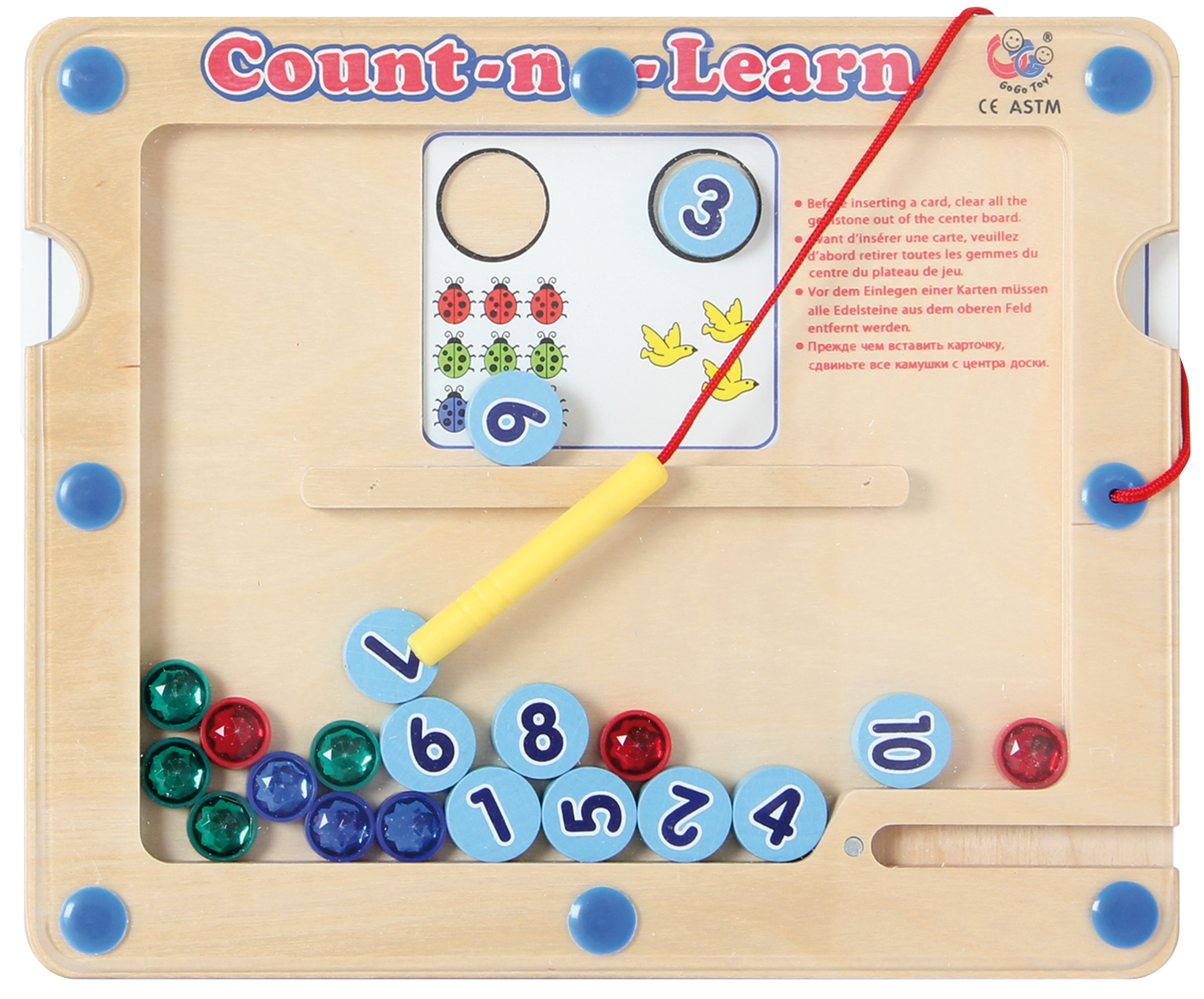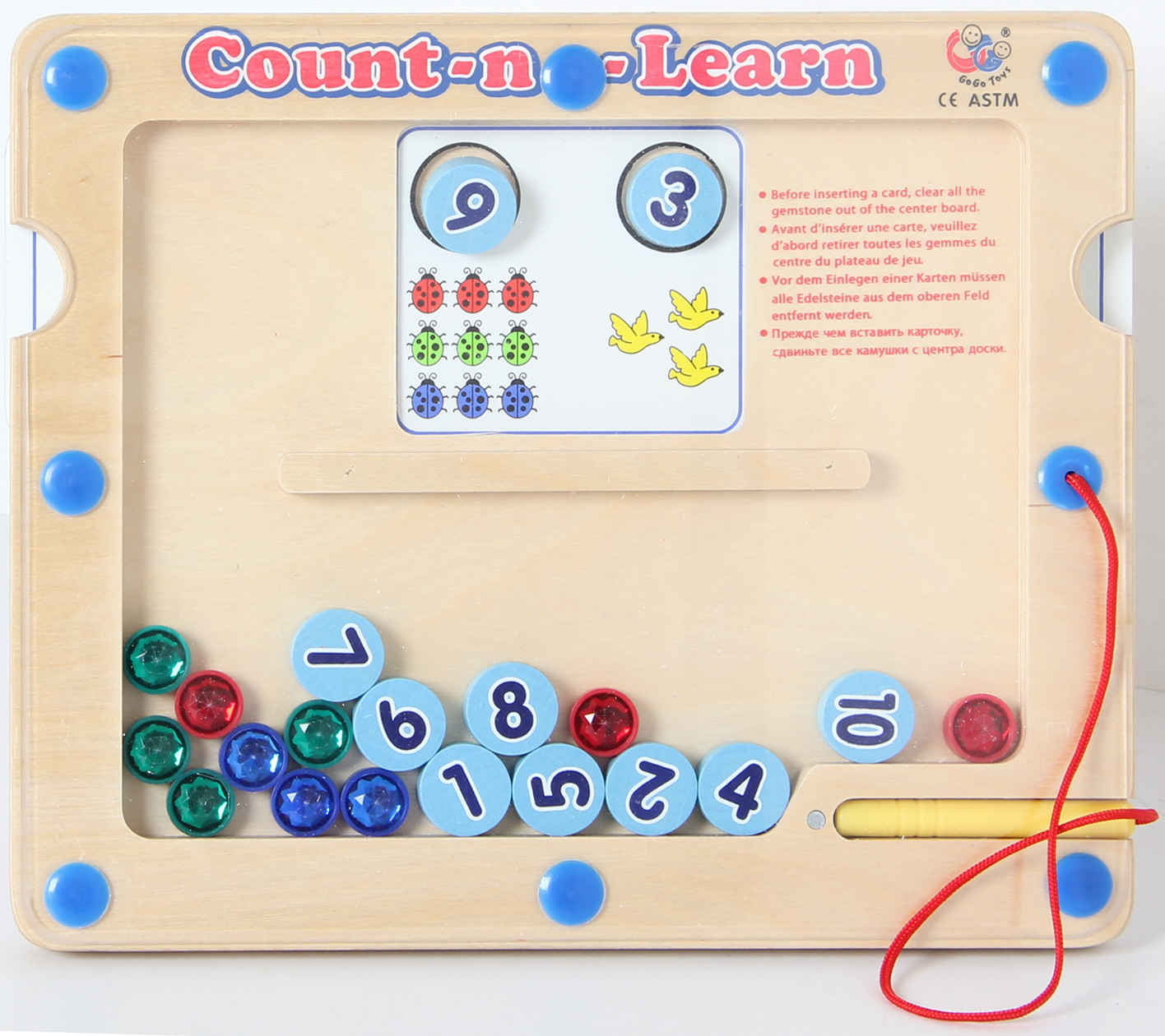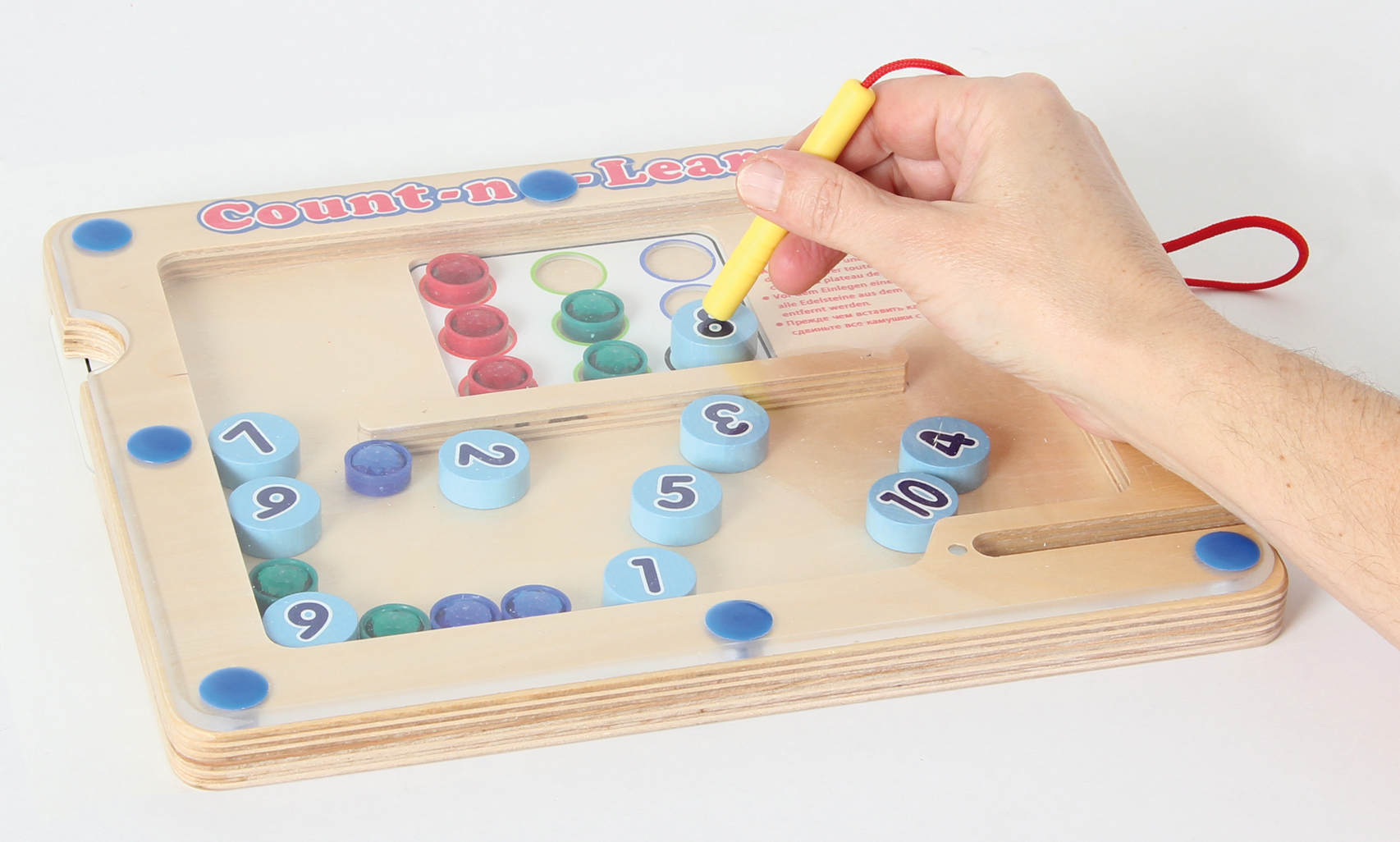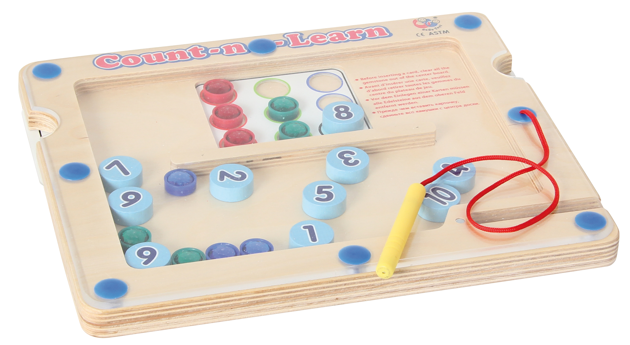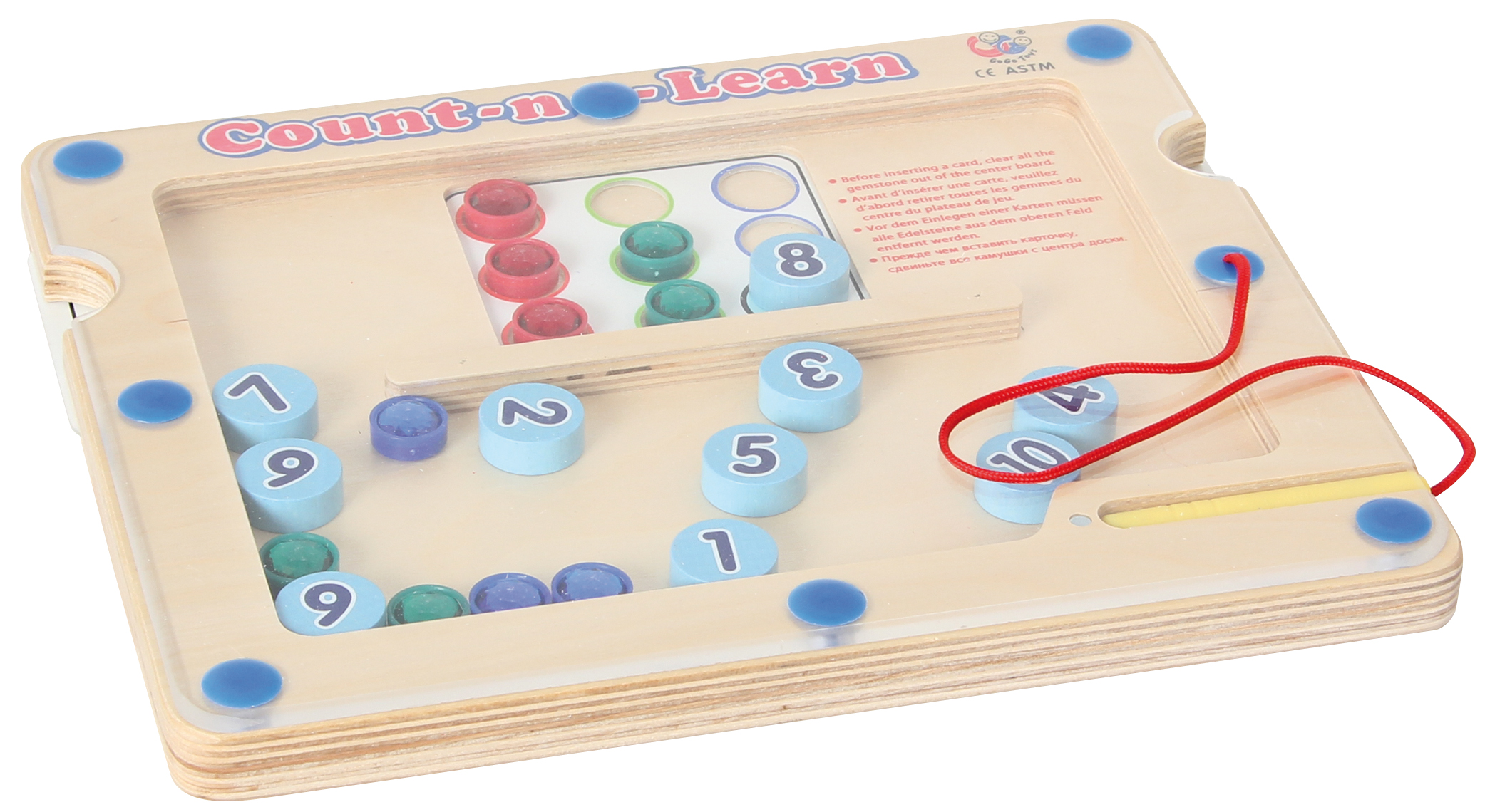 Magnetspiel zum Zählen lernen für Vorschulkinder. Das Spiel besteht aus einem Holzboard mit Magnetstift, 10 magnetischen Zahlenplättchen, Glitzersteinen und Aufgabenkarten in unterschiedlichen Schwierigkeitsstufen. Die Vorlagekarten werden seitlich in das Holzboard geschoben. Mit dem Magnetstift ordnet man die passenden Zahlenplättchen zu und zählt die Glitzersteine ab, die zu der Zahl gehören. Dabei werden die Zahl- und Farbzuordnung, die Schreibfähigkeit, sowie das Zählen und die Feinmotorik trainiert. Zählen ist eine ideale frühe Lernerfahrung.
