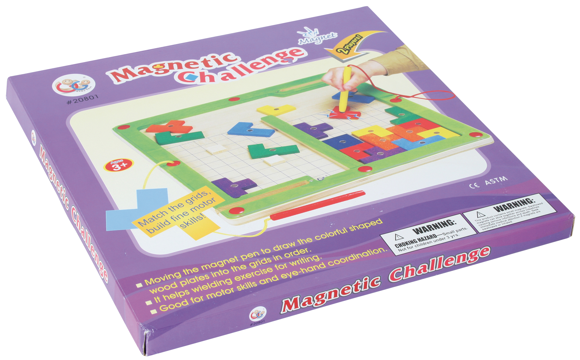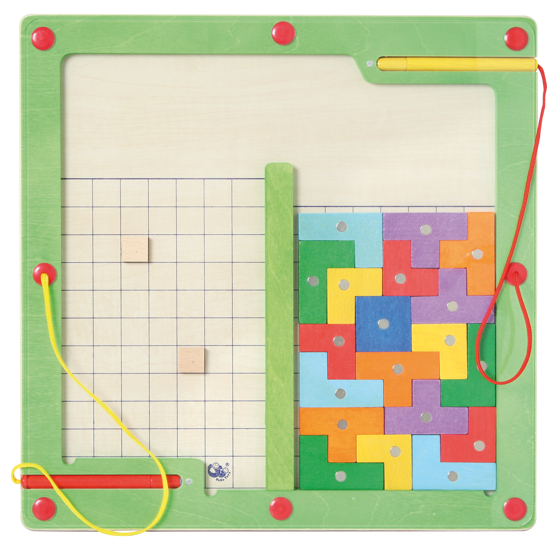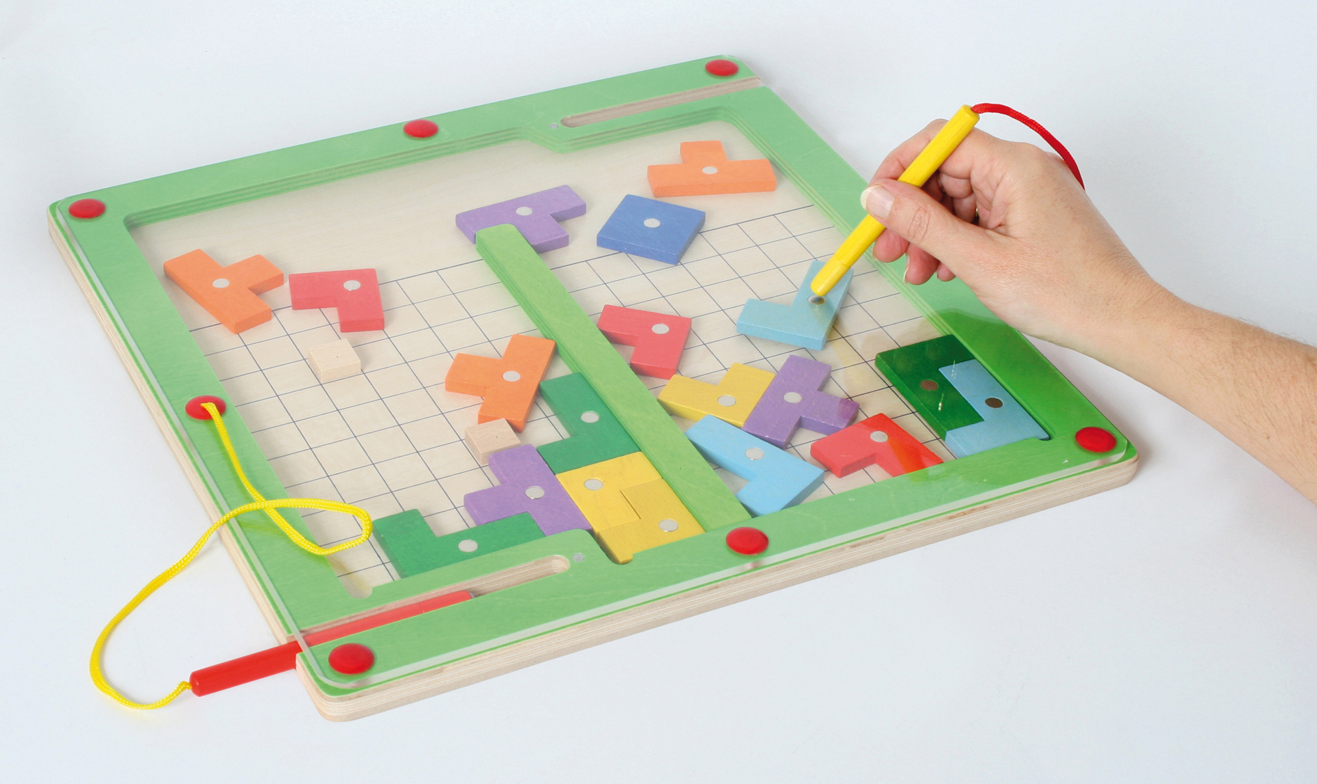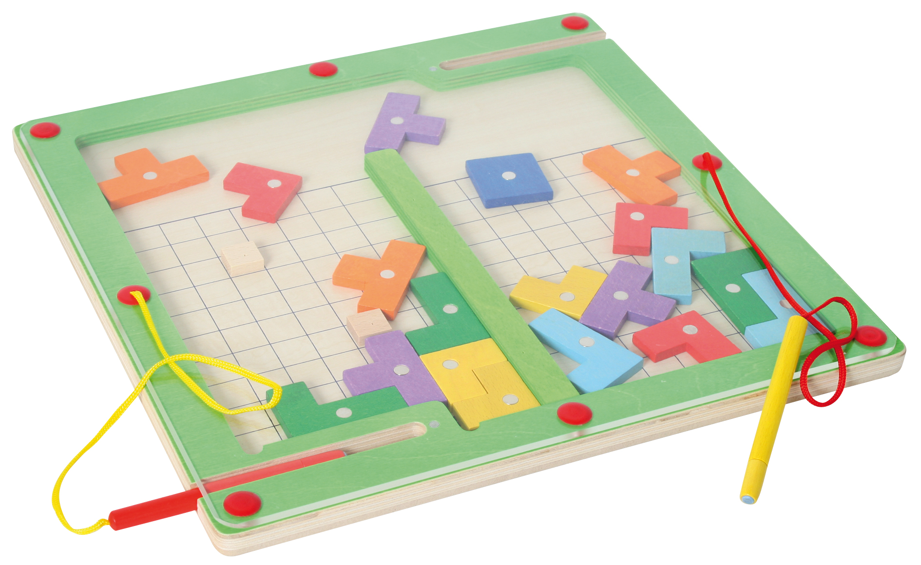 Massives, geschlossenes Holz-Spielbrett mit Acrylglasplatte. Es gilt, mit den zwei am Spielbrett befestigten Magnetstäben 19 Holzplättchen einzupassen.