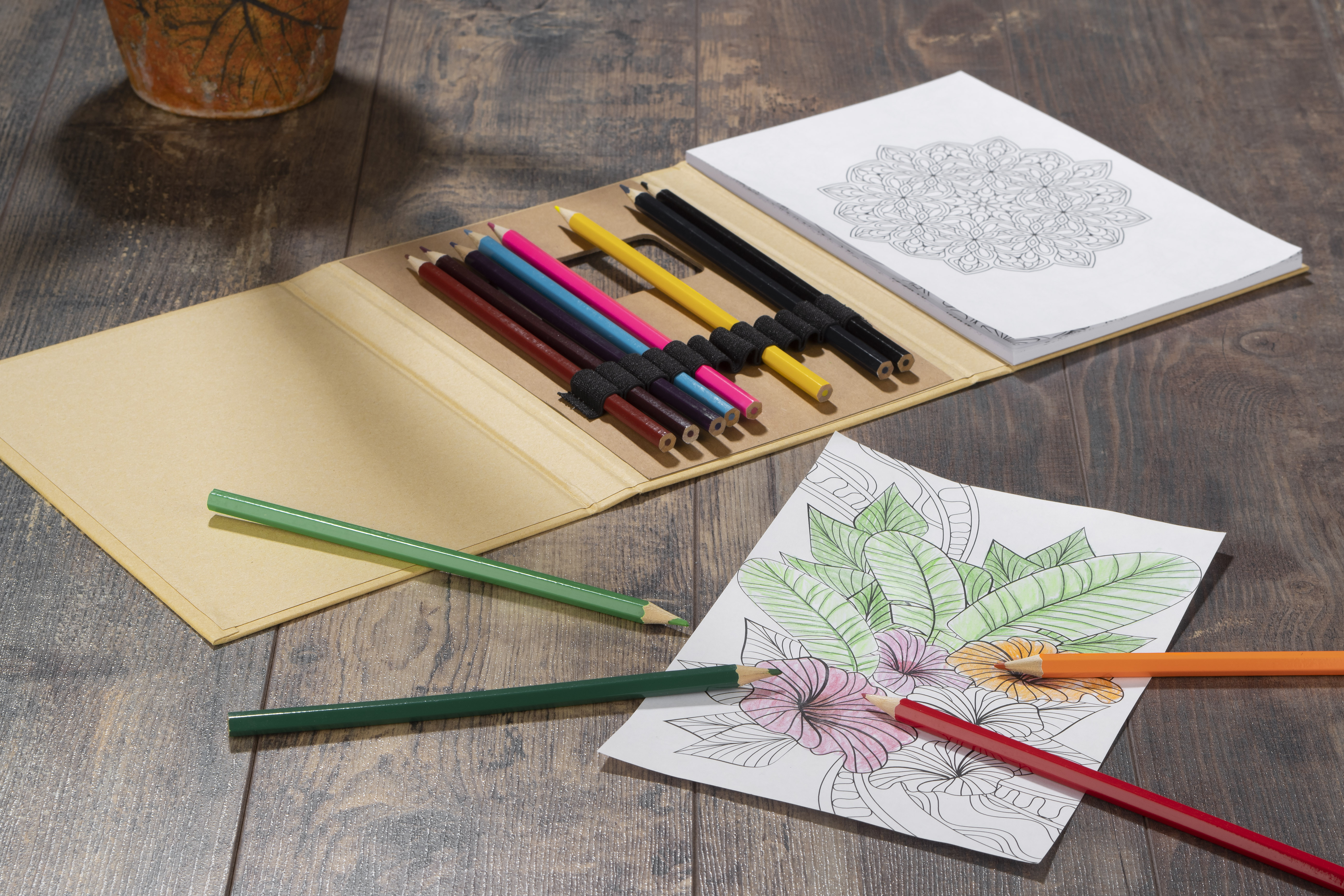 Ein praktisches Malbuch mit einem Kraftpapiereinband. Besteht aus 10 Malbücher, 40 glatte Blätter und 12 Buntstifte.