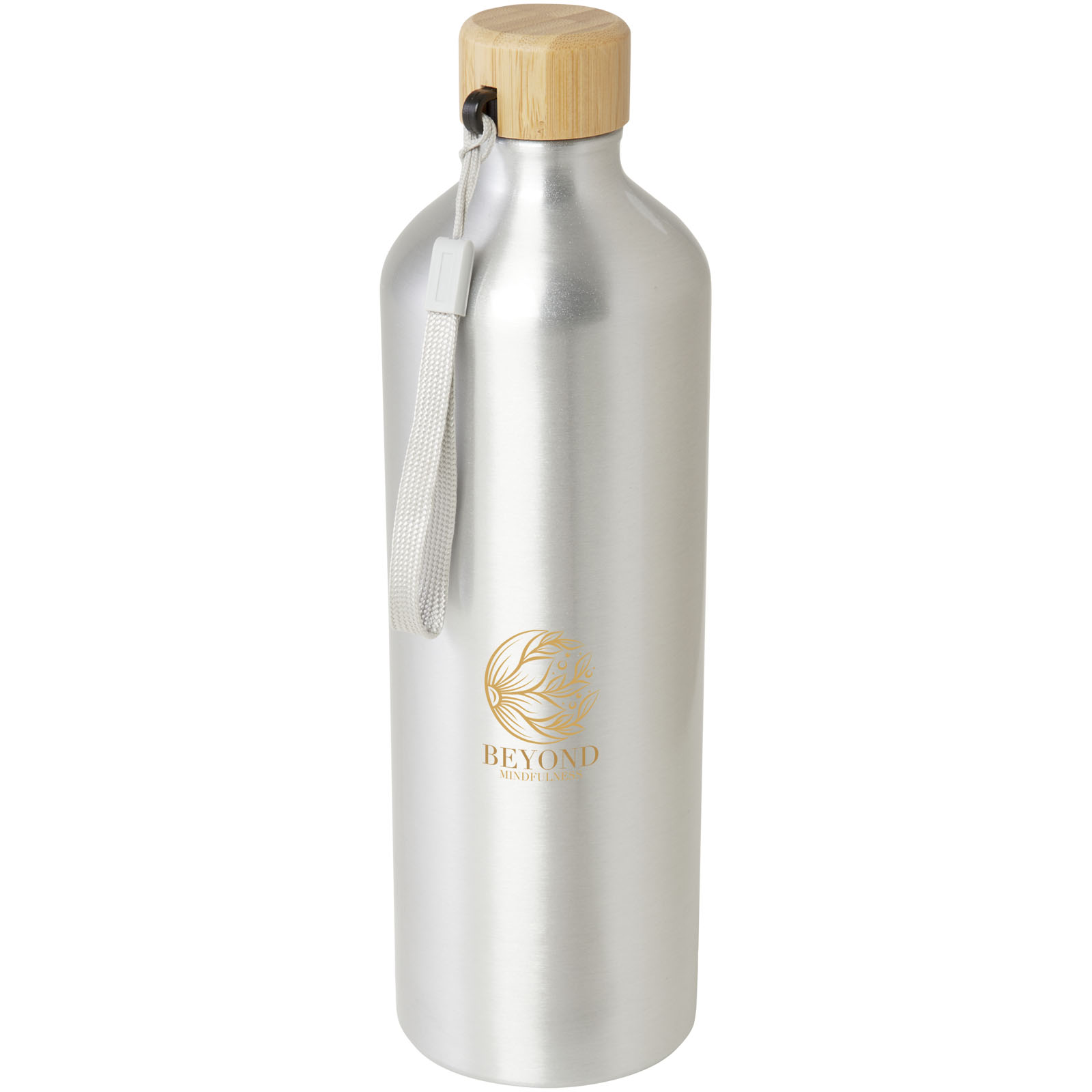RCS-zertifizierte Wasserflasche aus recyceltem Aluminium mit einem eleganten Bambusdeckel. Die leichte, einwandige Flasche ist mit einem Riemen zum einfachen Tragen ausgestattet. Das Bambusholz stammt aus nachhaltigen, umweltfreundlichen und sozial verantwortlichen Quellen. Das Fassungsvermögen beträgt 1000 ml. Nur von Hand reinigen.