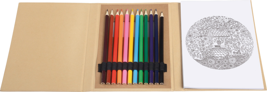 Malset COLOURFUL BOOK: bestehend aus 10 Malblättern mit verschiedenen Motiven zum Ausmalen, 40 leere Blätter, 12 Buntstifte (angespitzt), im Geschenkkarton mit Sichtfenster
