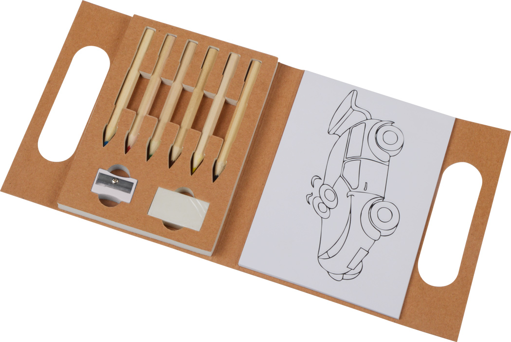 Malset PAINTING BAG: bestehend aus 30 Malblättern mit verschiedenen Motiven zum Ausmalen, 6 kleine verschiedenfarbige Naturholz-Buntstifte, angespitzt, Radiergummi und Anspitzer, in Papptasche mit Tragegriff