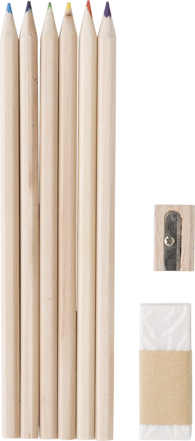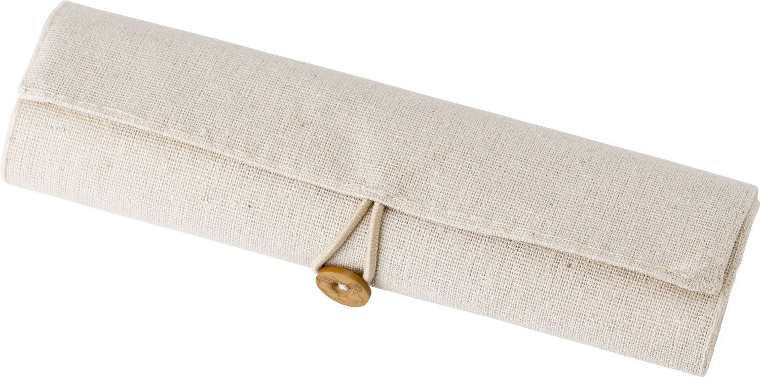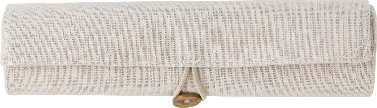 Aufrollbares Malset aus Leinen und Baumwolle mit sechs Malstiften (in den Farben Blau, Dunkelblau, Grün, Gelb, Orange und Lila), Bleistiftanspitzer und Radiergummi.