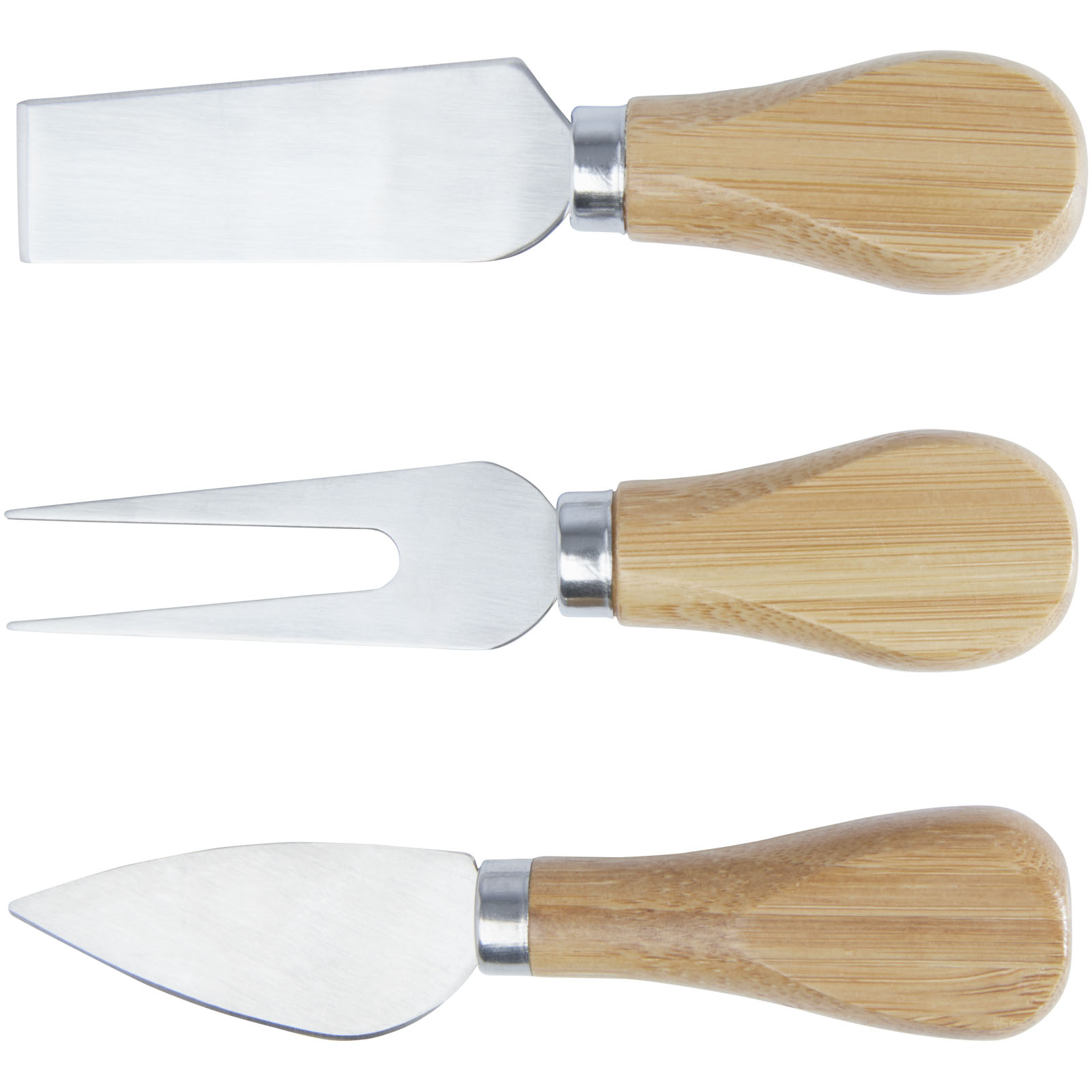 4-teiliges Käseset aus Bambus, bestehend aus einem Käsebrett (30 x 20,2 x 7,6 cm), 2 Käsemesser (12,5 x 2,5 cm und 12,5 x 2,7 cm) und einer Käsegabel (13,5 x 2,4 cm). An der Seite des Käsebretts befindet sich ein Magnetstreifen, an dem das Käsebesteck befestigt wird, so dass Sie den Käse stilvoll servieren können. Der verwendete Bambus wird nach nachhaltigen Normen beschafft und produziert.