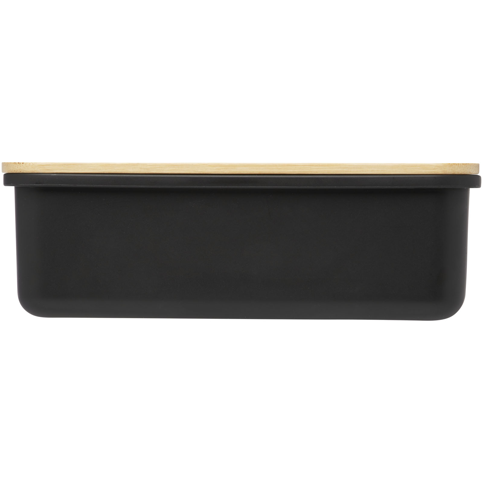 Die Mangi Lunchbox besteht aus recyceltem Kunststoff und hat ein Fassungsvermögen von 750 ml. Sie hat einen Deckel aus Bambus und ein Gummiband, das den Deckel an Ort und Stelle hält und dafür sorgt, dass der Inhalt frisch bleibt. Der Behälter ist spülmaschinenfest, jedoch nicht der Deckel.