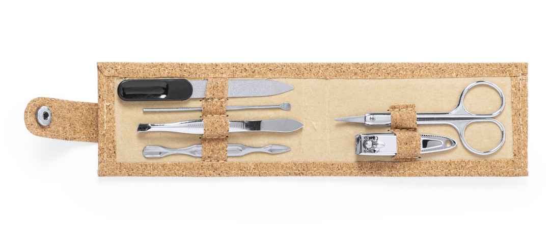 Linie "Natur" Maniküre-Set in einem Korketui, um die Verwendung natürlicher Rohstoffe zu fördern und Schadstoffemissionen zu reduzieren. Inklusive 6 Zubehörteile aus Edelstahl: Schere, Pinzette, Nagelknipser, Nagelfeile und 2 Nagelhautentferner. Innenliegende Zubehörhalter und Knopfverschluss. Vollständig ausklappbar für einfaches Branding.