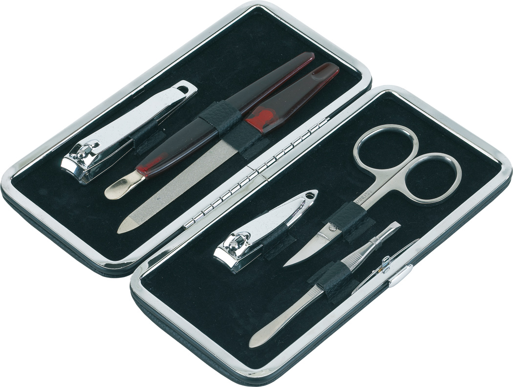 Maniküreset AMELIE, 6-teilig: bestehend aus Nagelschere, Nagelfeile, Pinzette, Nagelschaber, großem und kleinem Nagelknipser, im rechteckigen Etui mit Seitknopfverschluss