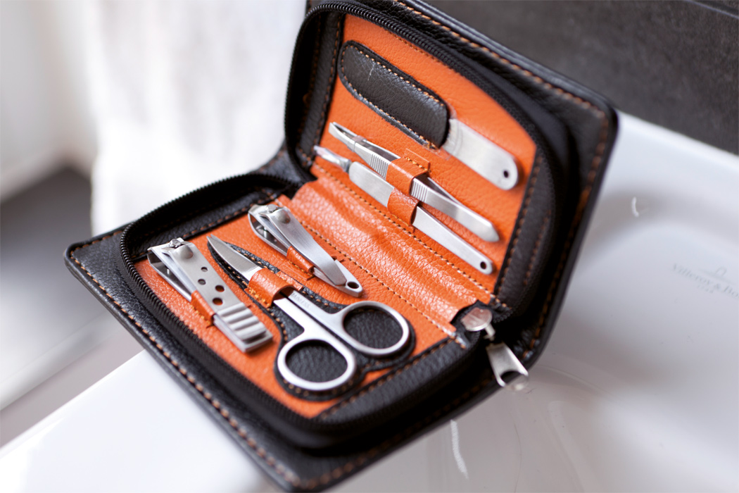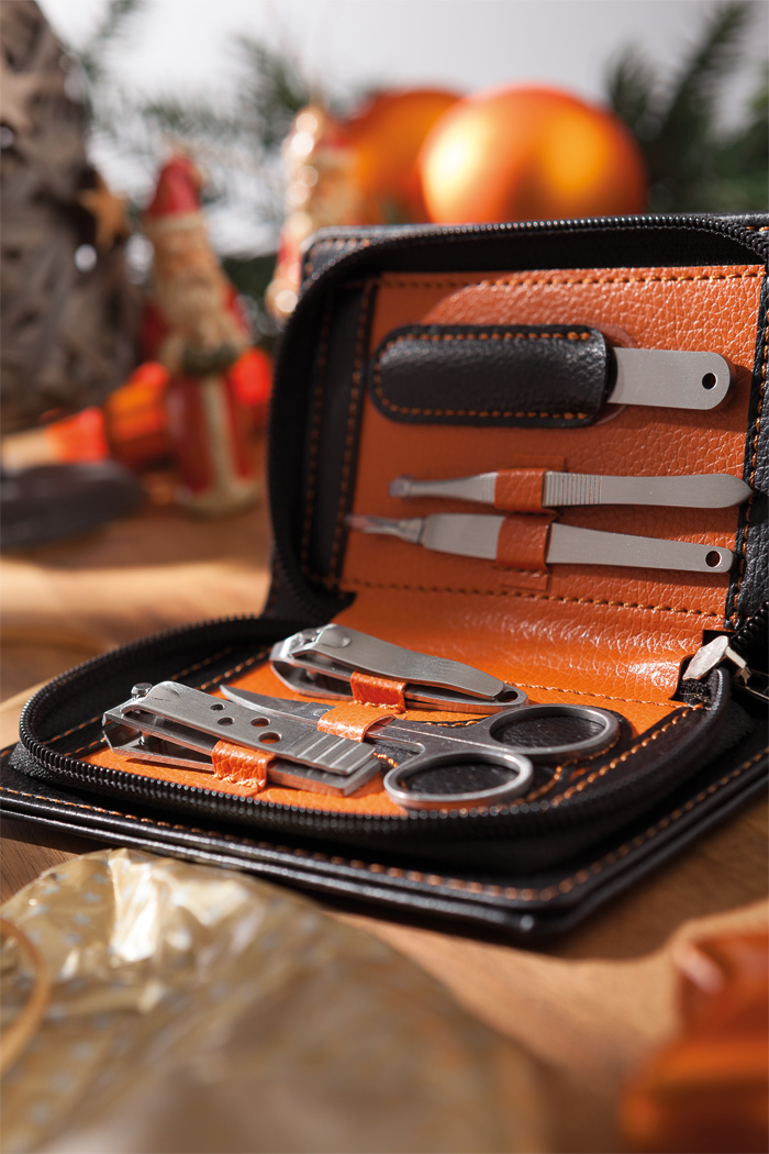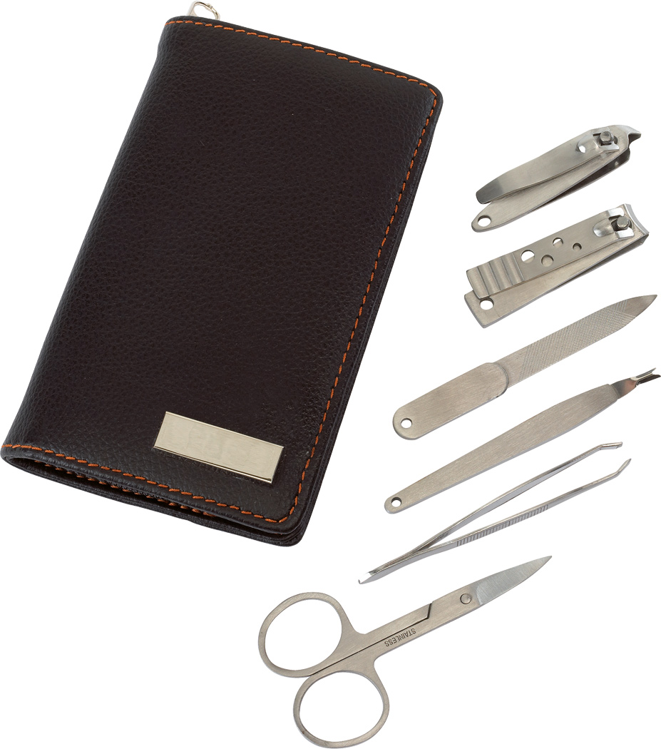 Maniküreset PERFECT, 6-teilig: bestehend aus Nagelfeile, Pinzette, Nagelhautschneider, Nagelknipser, Nagelschere und Fußnagelknipser, im Reißverschluss-Etui mit farbigen Ziernähten und Metallplättchen zur Werbeanbringung