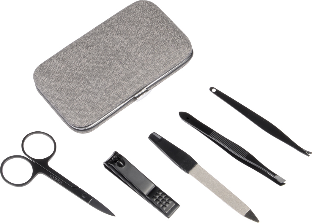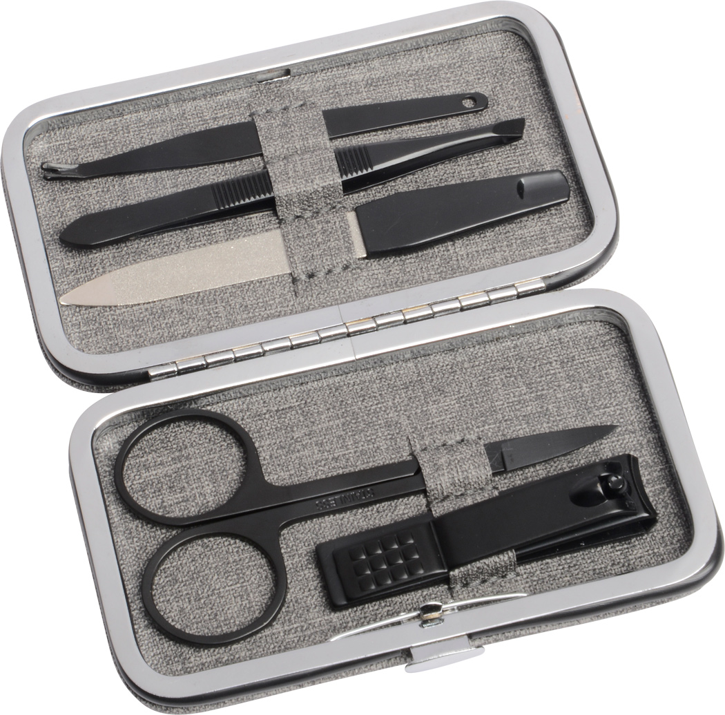 Maniküreset PRETTY IN BLACK, 5-teilig: bestehend aus Nagelfeile, Pinzette, Nagelhautschneider, Nagelknipser und Nagelschere, im rechteckigen Etui mit Seitknopfverschluss