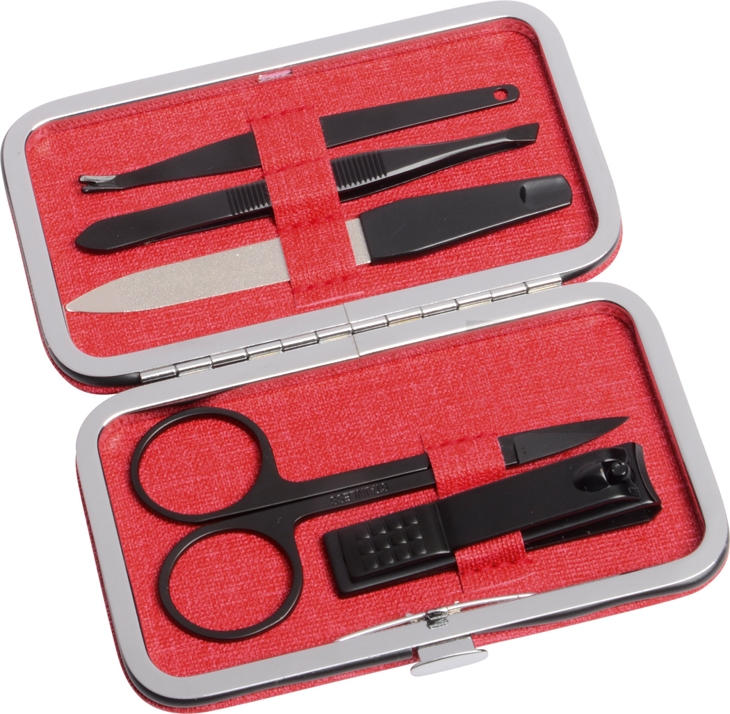 Maniküreset PRETTY IN BLACK, 5-teilig: bestehend aus Nagelfeile, Pinzette, Nagelhautschneider, Nagelknipser und Nagelschere, im rechteckigen Etui mit Seitknopfverschluss