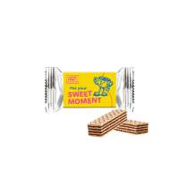Knusprige Waffel mit Haselnusscremefüllung (82 %) in glänzend- oder matt-kaschiertem weißem Flowpack einzeln verpackt. Bruch einzelner Kekse möglich.