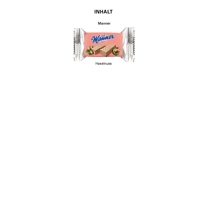 Manner 2er Neapolitaner im Werbeschuber aus weißem Karton, individuell bedruckt. Inhalt: 1 kleines Päckchen mit 2 knusprigen Manner Waffeln, gefüllt mit Haselnusscreme, 15 g