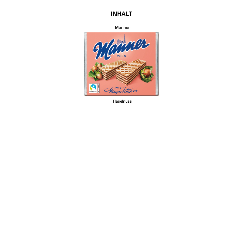 Manner Neapolitaner mit Werbeschuber aus Karton, individuell bedruckt. Inhalt: 1 Päckchen Knusprige Manner Waffel gefüllt mit Haselnusscreme, 75 g
