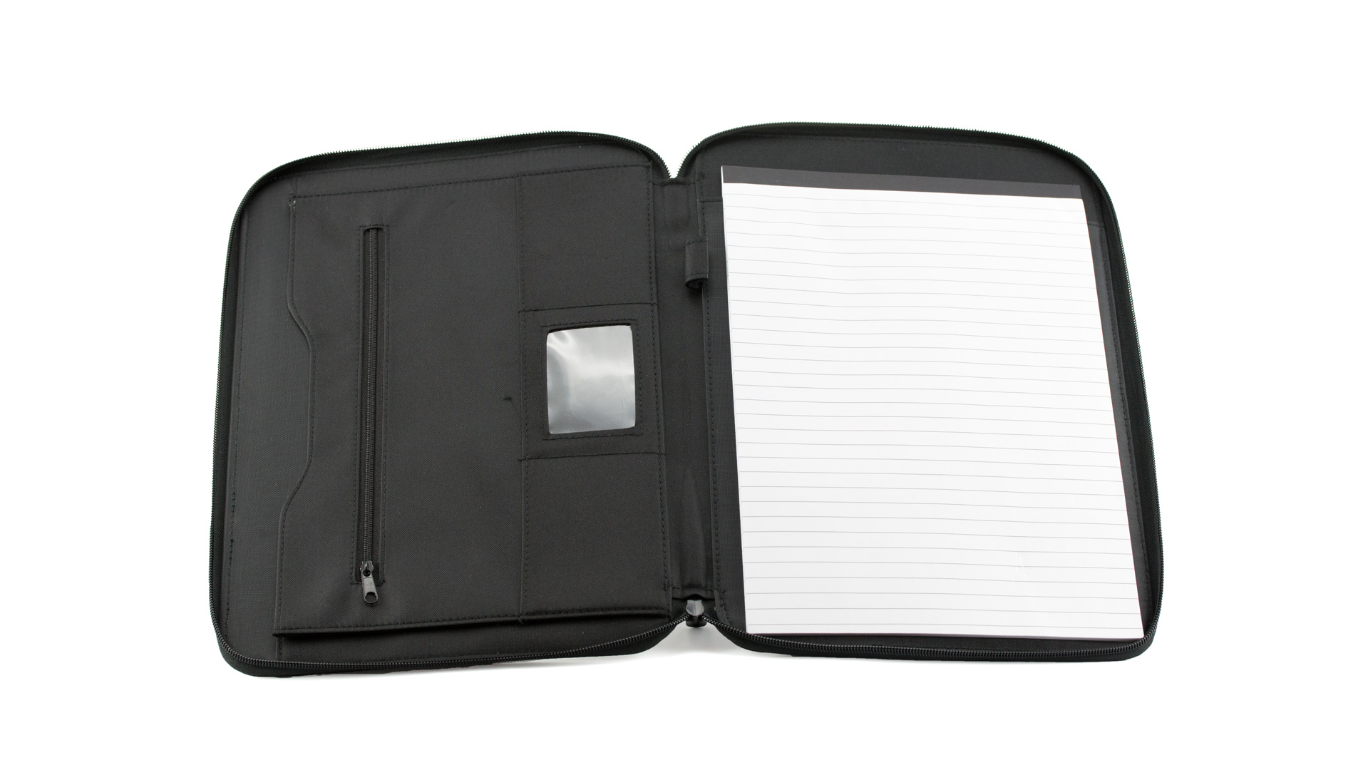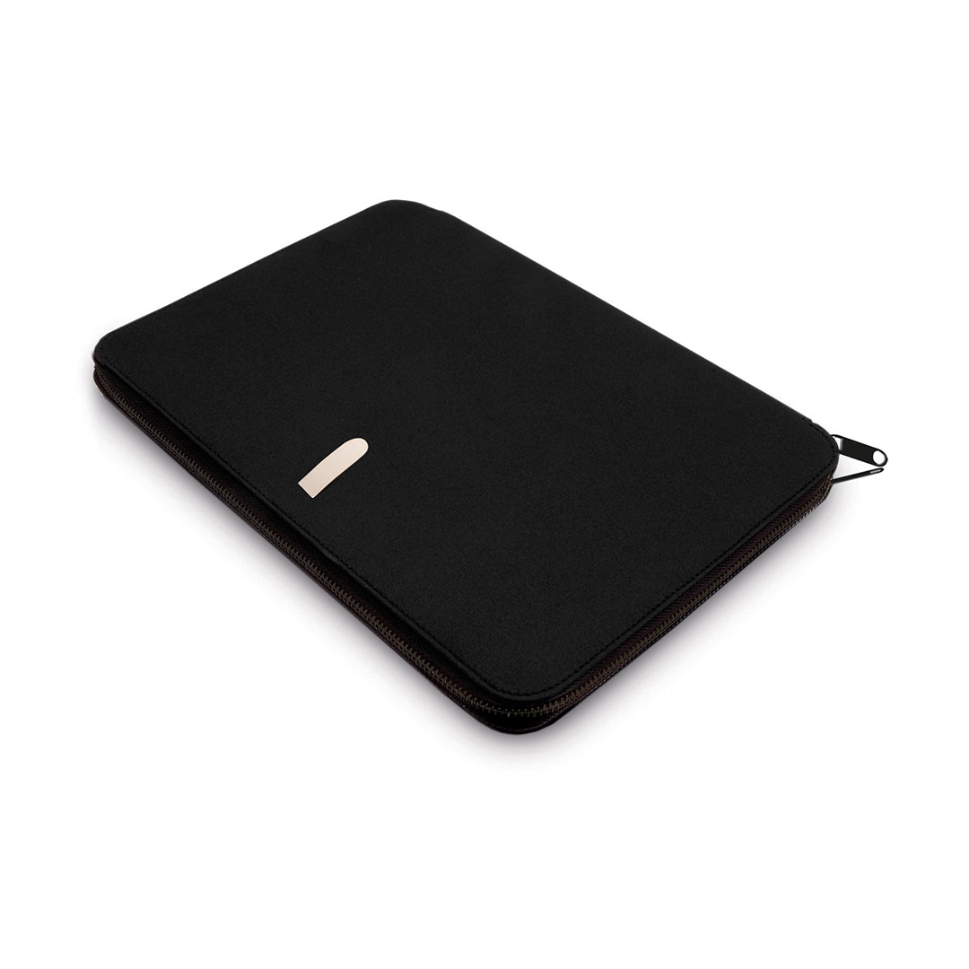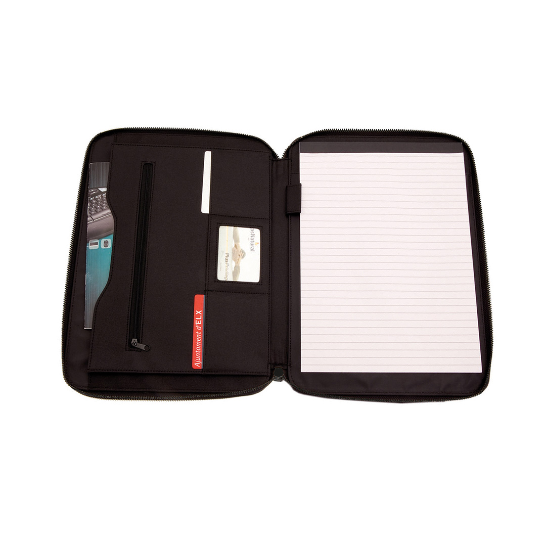 Elegante Dokumententasche mit Reißverschluss aus weicher Mikrofaser. Innenfach mit herausnehmbarem Block mit 20 linierten Blättern, Reißverschlusstasche, Pattentasche sowie Kartenfächern und Stifthalter. Mit elegantem Metall-Label auf der Front für den Laserdruck.