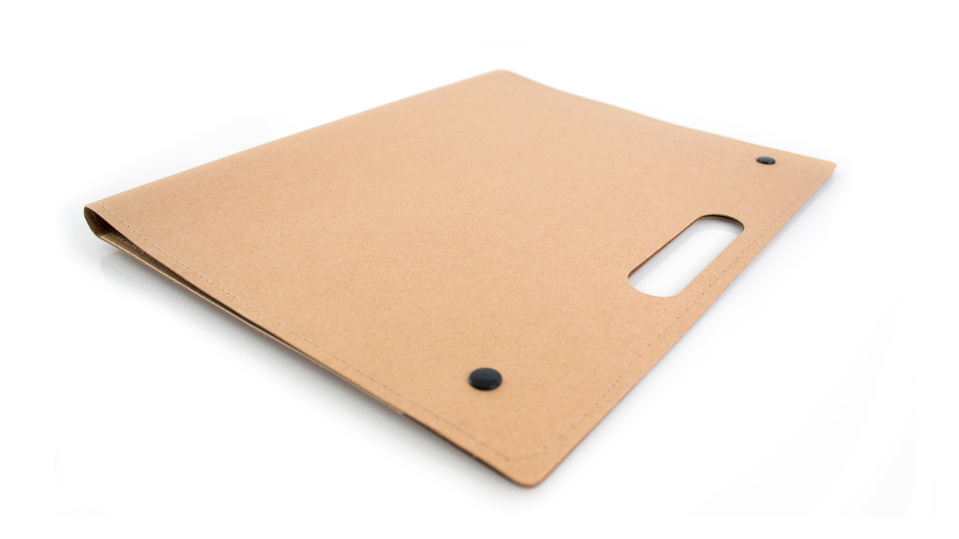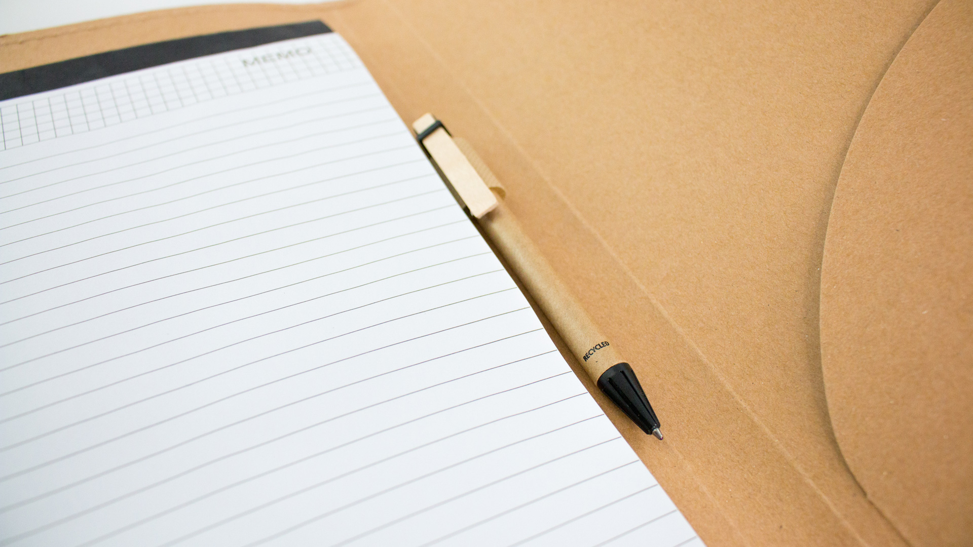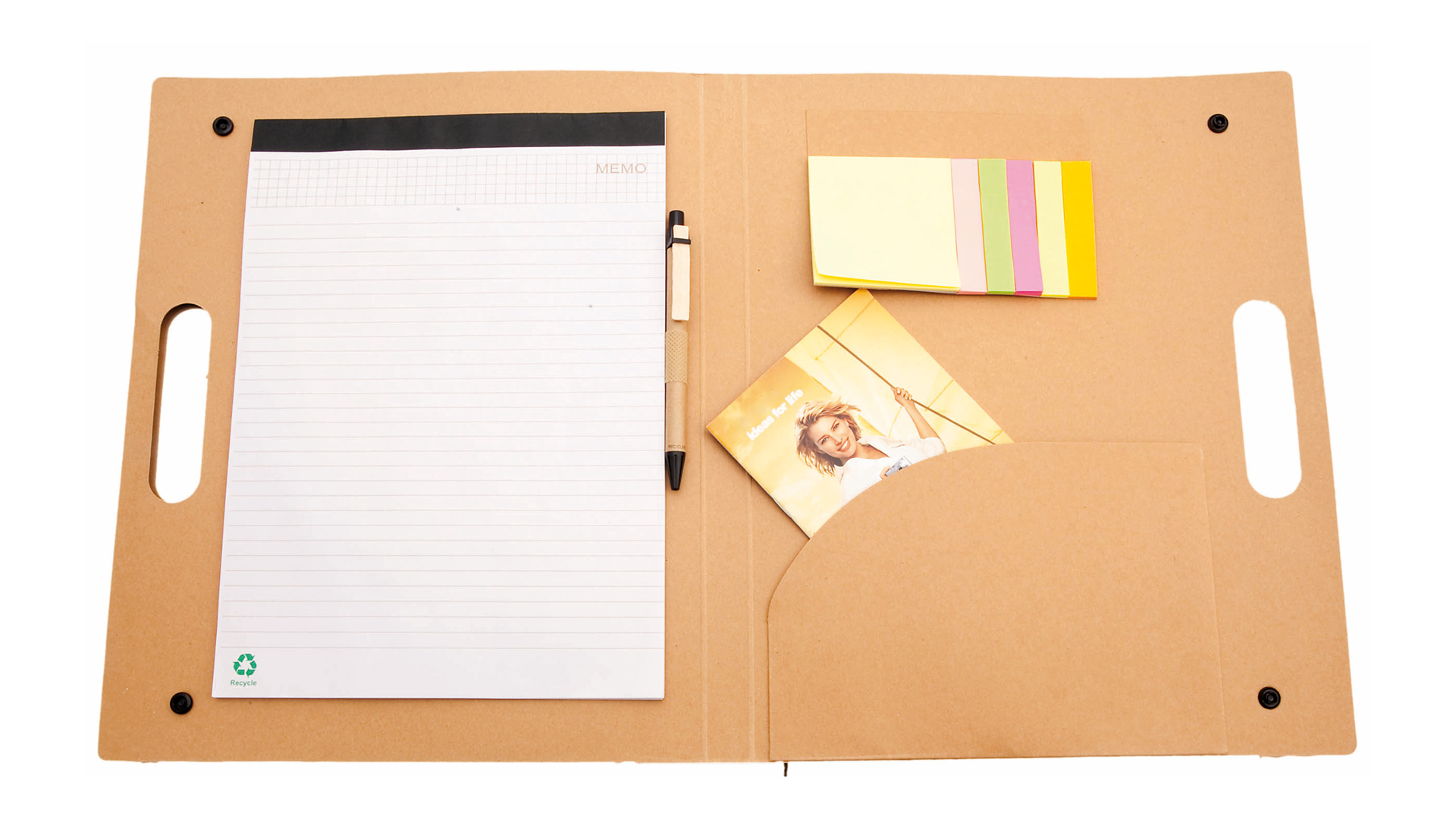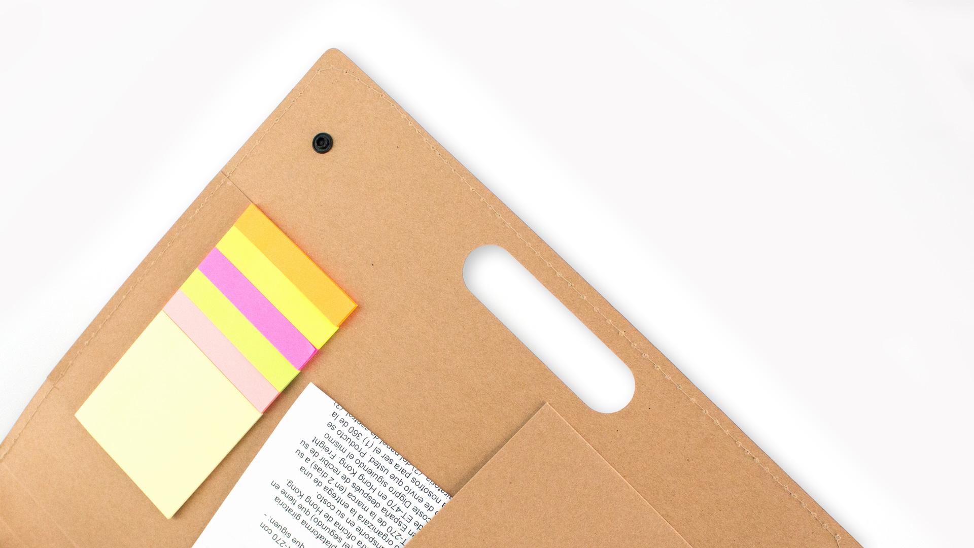 Ökologische Mappe mit zweifachem Druckknopfverschluss aus flexiblem Recyclingkarton und praktischem, integriertem Griff. Mit herausnehmbarem Block mit 25 linierten Blättern, 25 großen Haftnotizen und 125 Mini-Haftnotizen sowie Klappentasche und Kugelschreiberhalter.