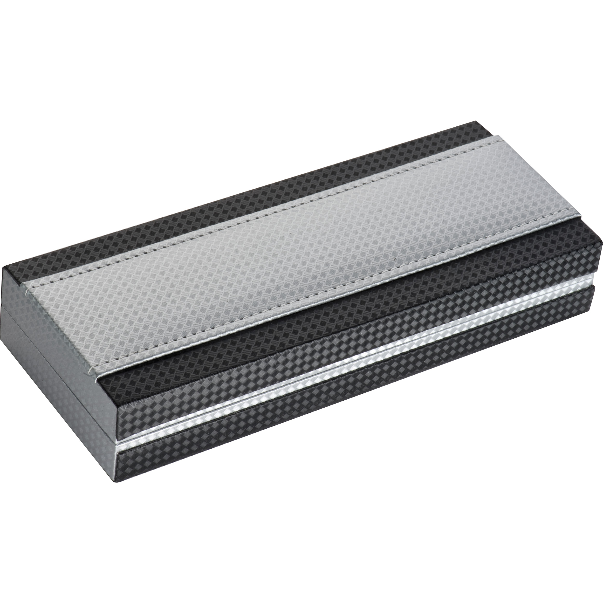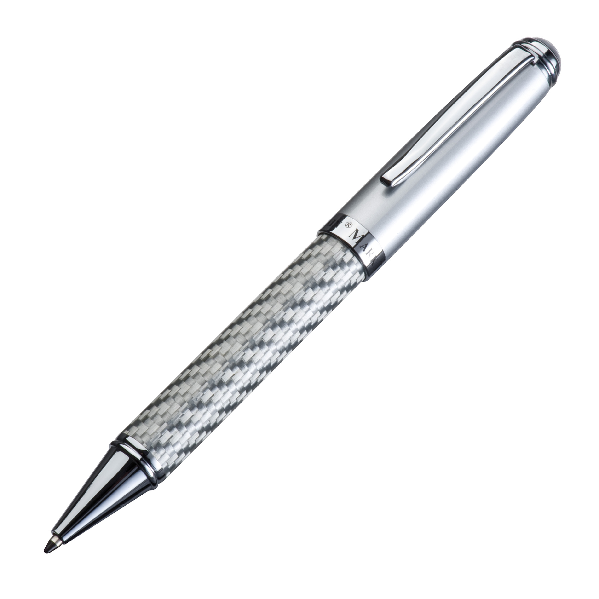 Mark Twain Drehkugelschreiber aus Metall, in silbernem Karbondesign mit blau schreibender Großraummine im farblich abgestimmten Etui. Ihre Werbung bringen wir mittels Gravur neben dem Clip an.