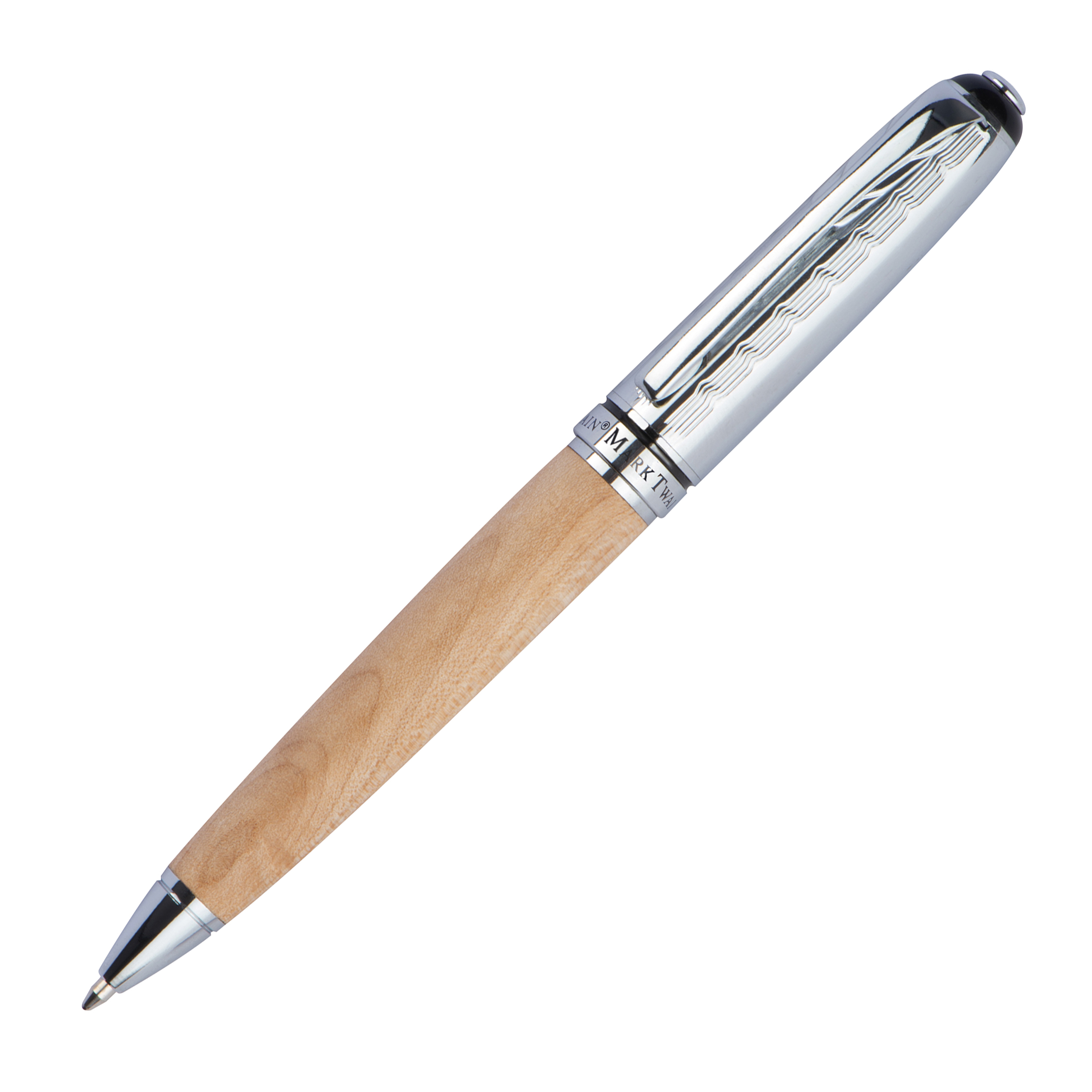 Hochwertiges Mark Twain Schreibset bestehend aus einem blau schreibenden Drehkugelschreiber mit Großraummine und einem Rollerball aus Metall mit Holzkorpus. Verpackt ist das Set in einer naturbelassenen Holzbox. Ihre Werbung wird rechts vom Clip gelasert, Gravurpreis ist für beide Schreibgeräte.