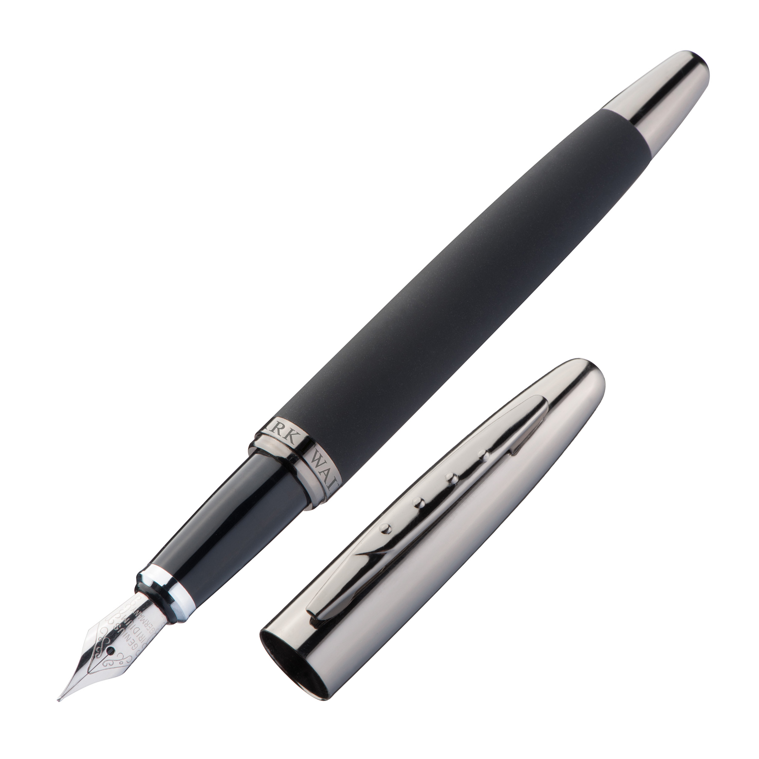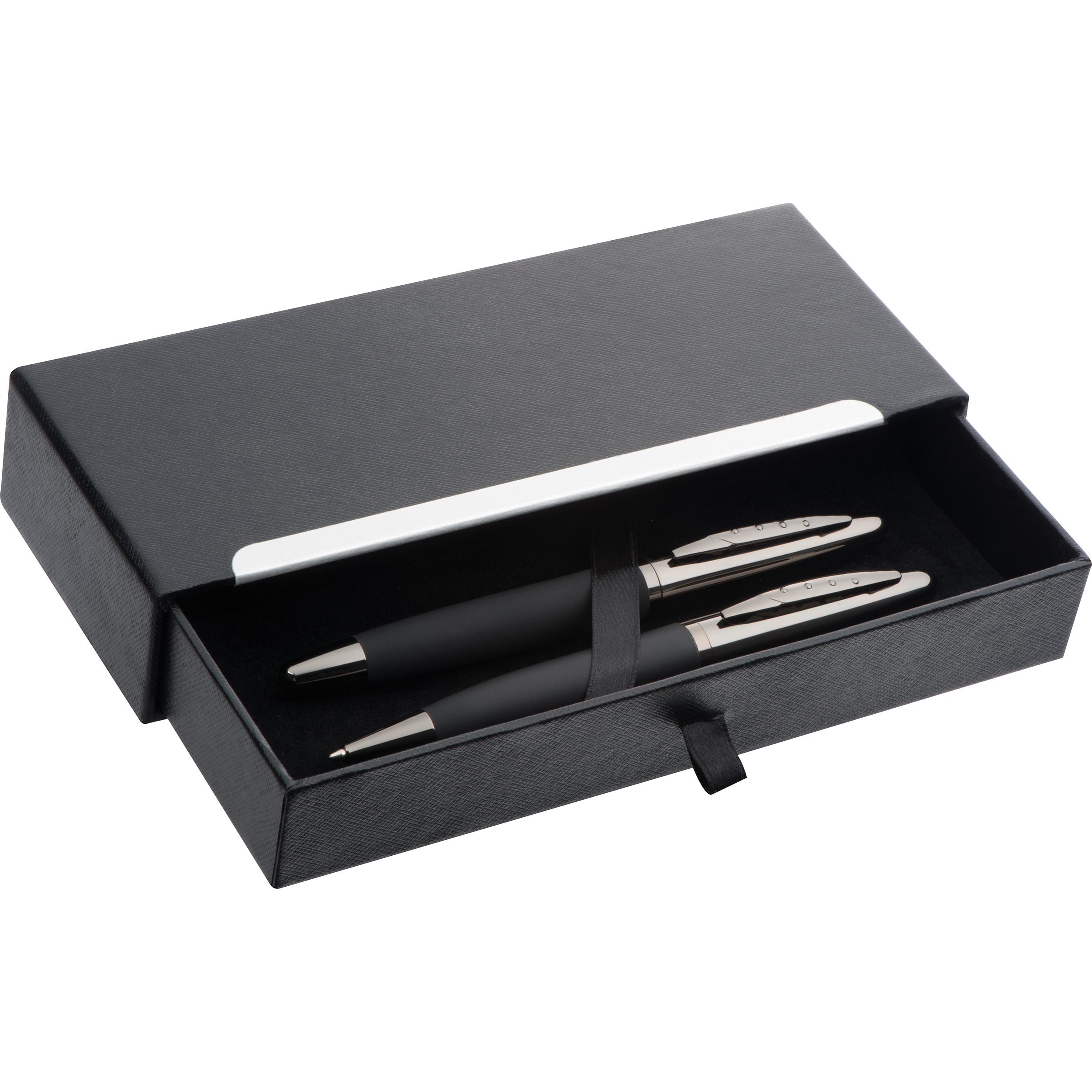 Mark Twain Schreibset aus Metall im schwarzen, aufschiebbaren Etui mit blau schreibendem Drehkugelschreiber (Großraummine) und Füllfederhalter mit gummiertem Schaft. Ihre Werbung lasern wir neben dem Clip - der Gravurpreis versteht sich für beide Schreibgeräte.