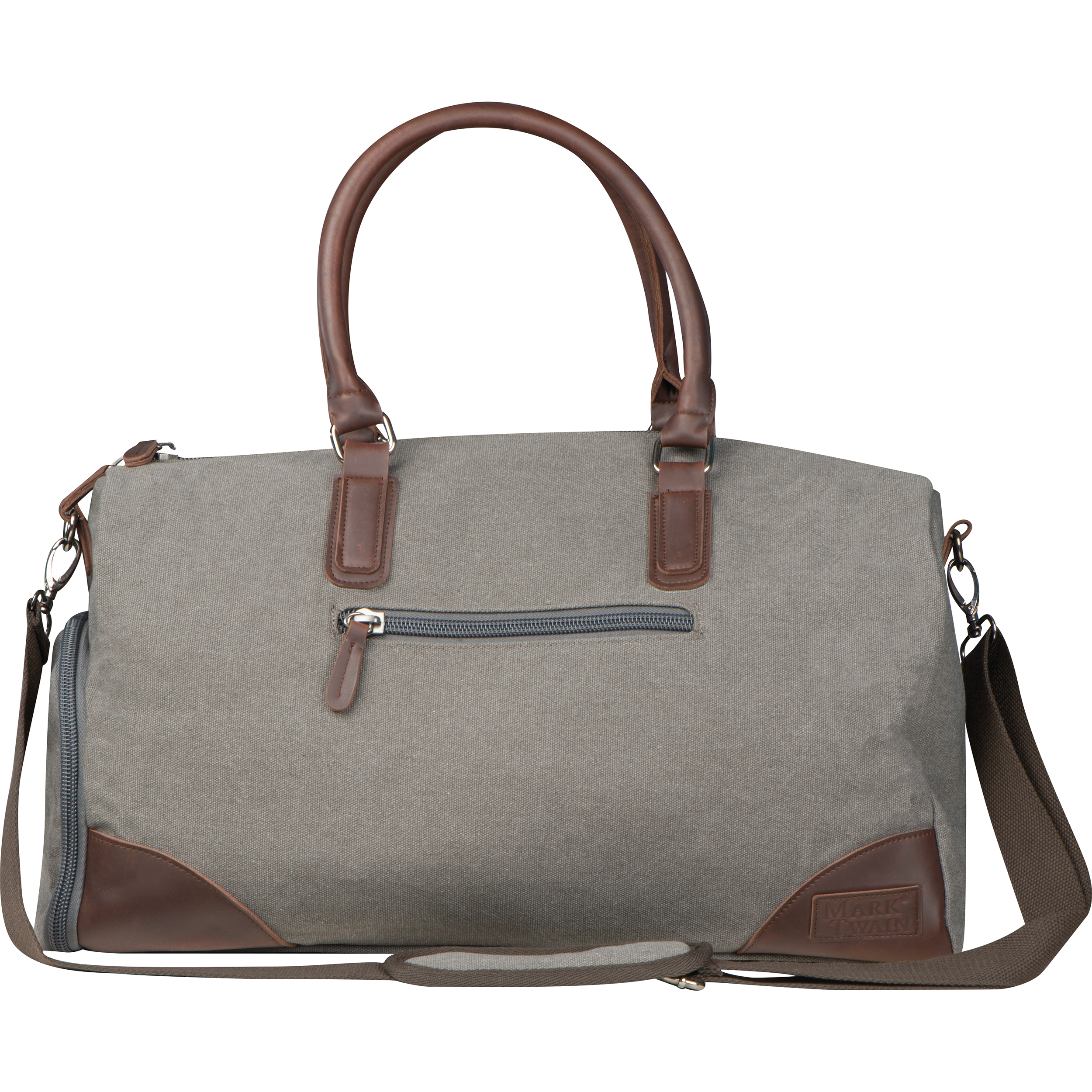 Mark Twain Reisetasche aus hochwertigem Canvas mit farblich abgesetzen PU Applikationen und einer Füllmenge von 32 Litern. Der Schultergurt mit Polsterung ist abnehmbar. Perfekt für einen Wochenendtrip. Ihre Werbung wird auf der Tasche angebracht.