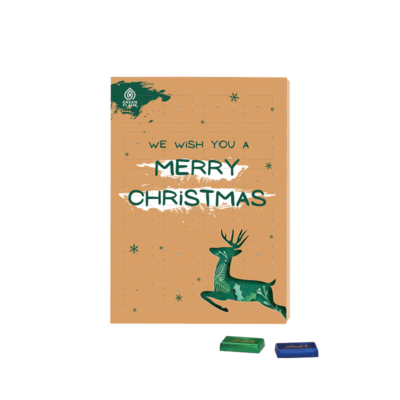 Wand Adventskalender mit Markenschokolade, in weißer Vollkarton-Hülle, individuell bedruckt. Inhalt: 24 Lindt Schokotäfelchen aus feinster Milchschokolade in drei festlichen Farben, bunt gemischt, 124 g. Saisonartikel - solange der Vorrat reicht!