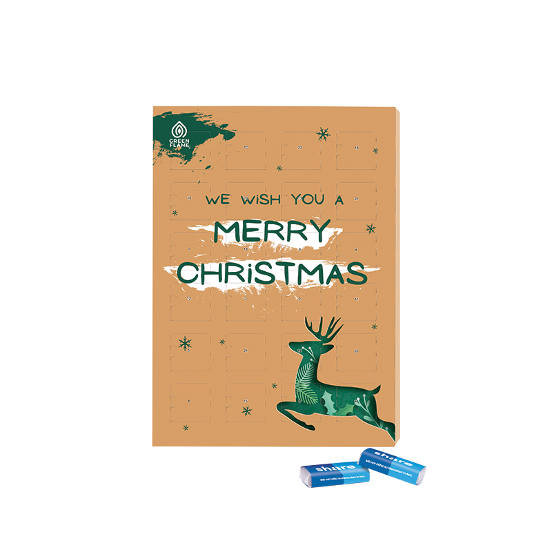 Wand Adventskalender mit Markenschokolade, in weißer Vollkarton-Hülle, individuell bedruckt. Inhalt: 24 share Schokotäfelchen mit Banderole aus weißem Papier eingewickelt in Pergaminpapier (kann über die Papiertonne entsorgt werden), 72 g. Saisonartikel - solange der Vorrat reicht!